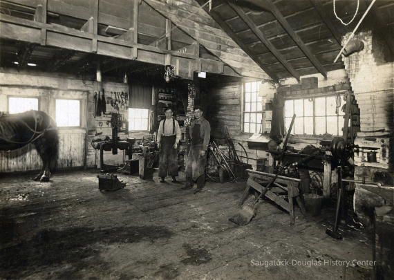 This image was featured as History Mystery #32 with the solution: The blacksmith shop mystery remains unsolved. A study of the picture dates it at ca. 1910. There were a number of such shops in the area. The smithy's faces are clear - so they may be identified.Photograph Details