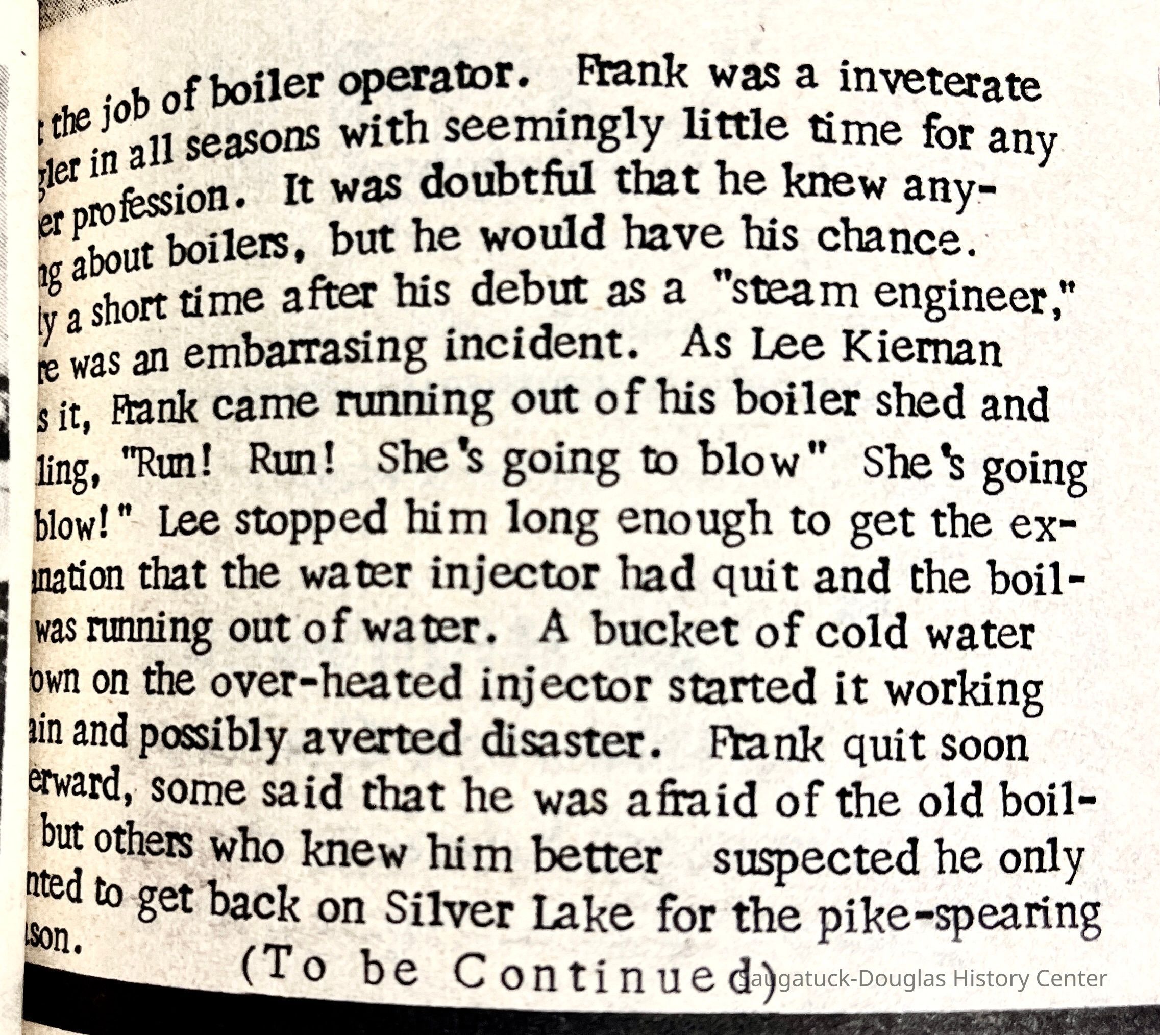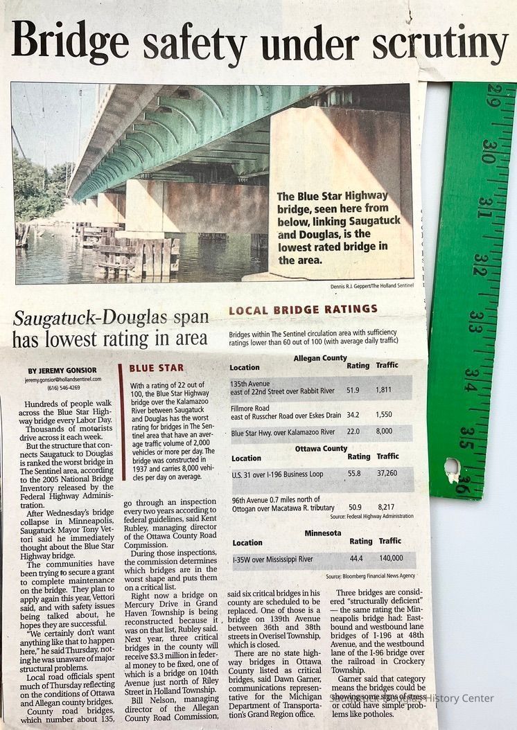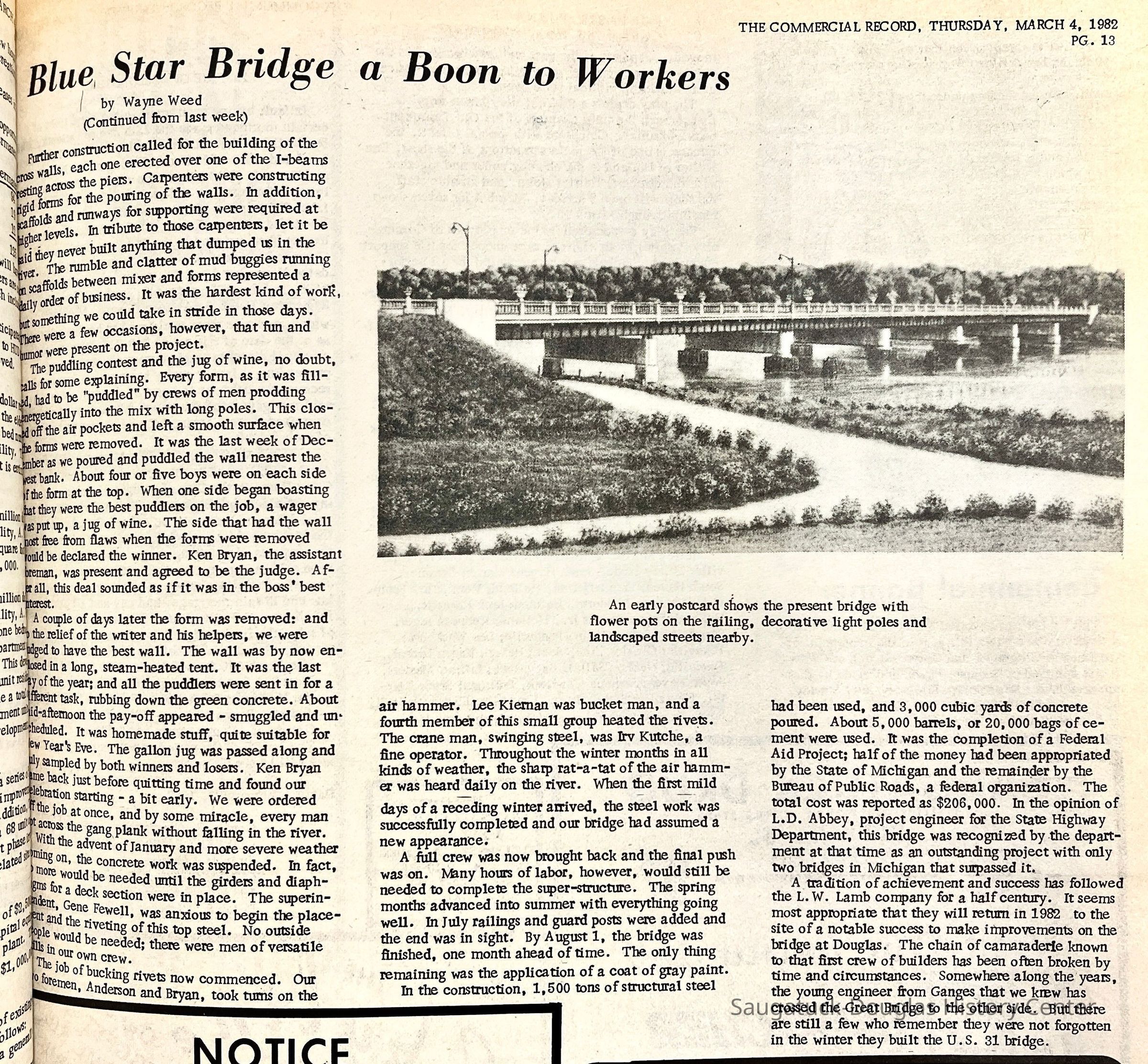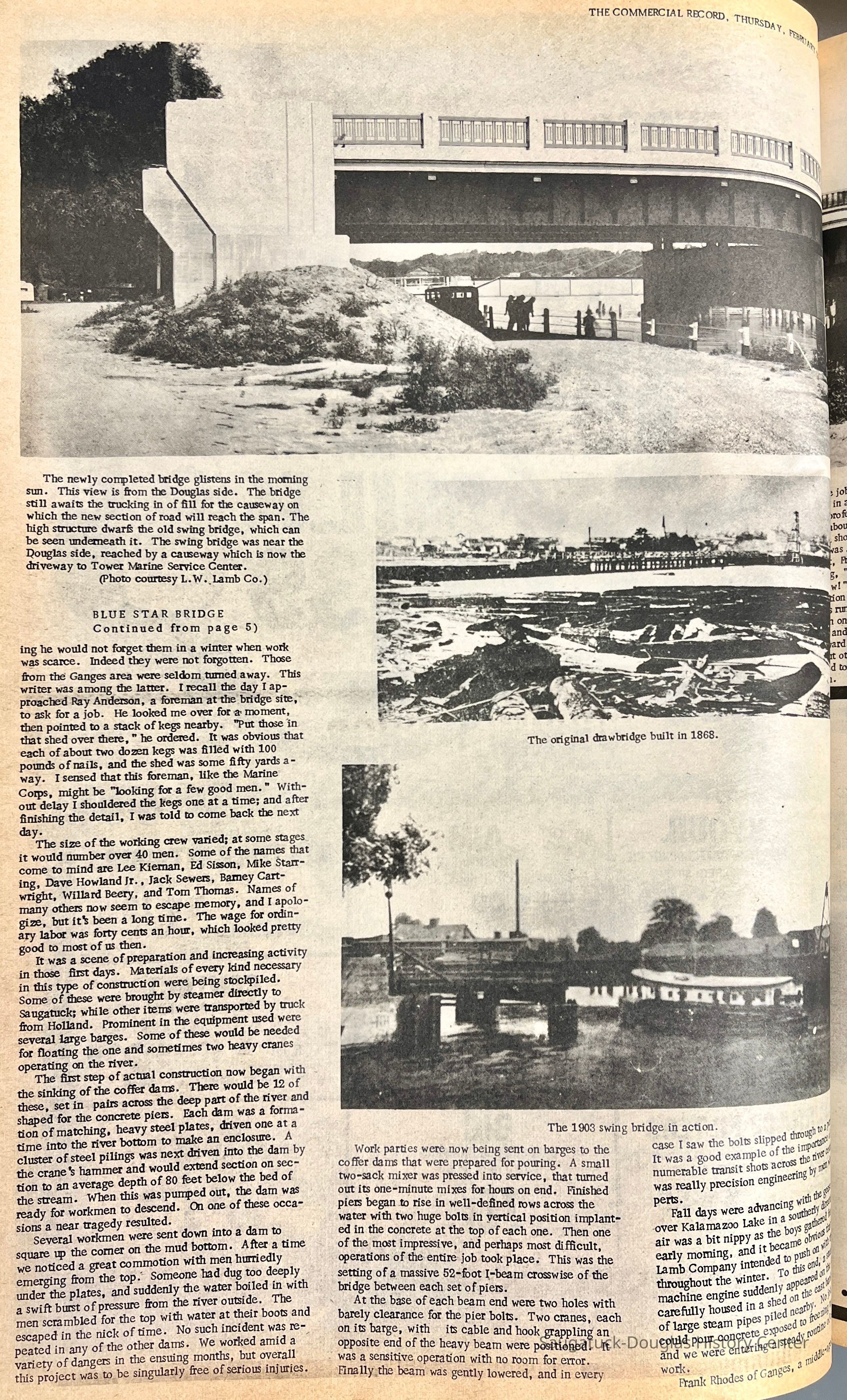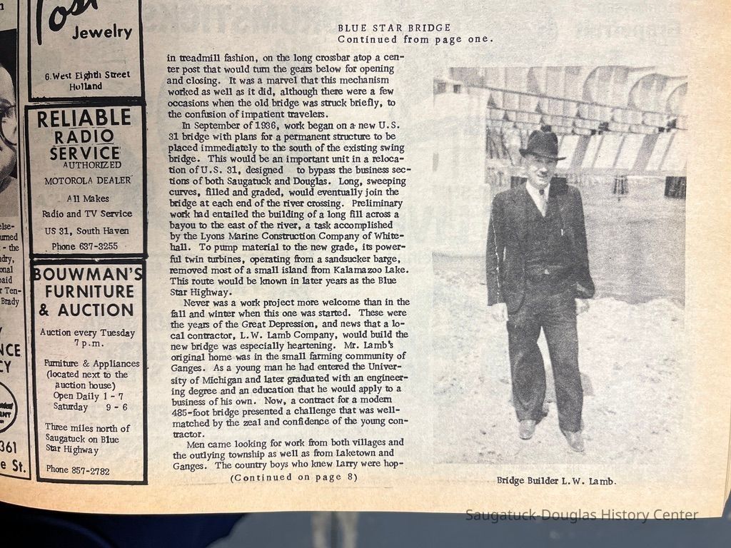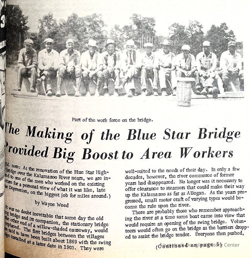 The Making of the Blue Star Bridge Provided Big Boost to Area Workers by Wayne Weed (Ed. note: As the renovation of the Blue Star Highway bridge over the Kalamazoo River nears, we are indebted to one of the men who worked on the existing structure for a personal view of what it was like, late in the Depression, on the biggest job for miles around.) It was no doubt inevitable that some day the old swing bridge and its companion, the stationary bridge at the other end of a willow-shaded causeway, would be replaced. The first bridges between the villages were said to have been built about 1869 with the swing bridge installed at a later date in 1903. They were well-suited to the needs of their day. In only a few decades, however, the river commerce of former years had disappeared. No longer was it necessary to offer clearance to steamers that could make their way up the Kalamazoo as far as Allegan. As the years progressed, small motor craft of varying types would become the rule upon the river. There are probably those who remember approaching the river at a time some boat came into view that would require an opening of the swing bridge. Volunteers would often go on the bridge as the barriers dropped to assist the bridge tender. Everyone then pushed,