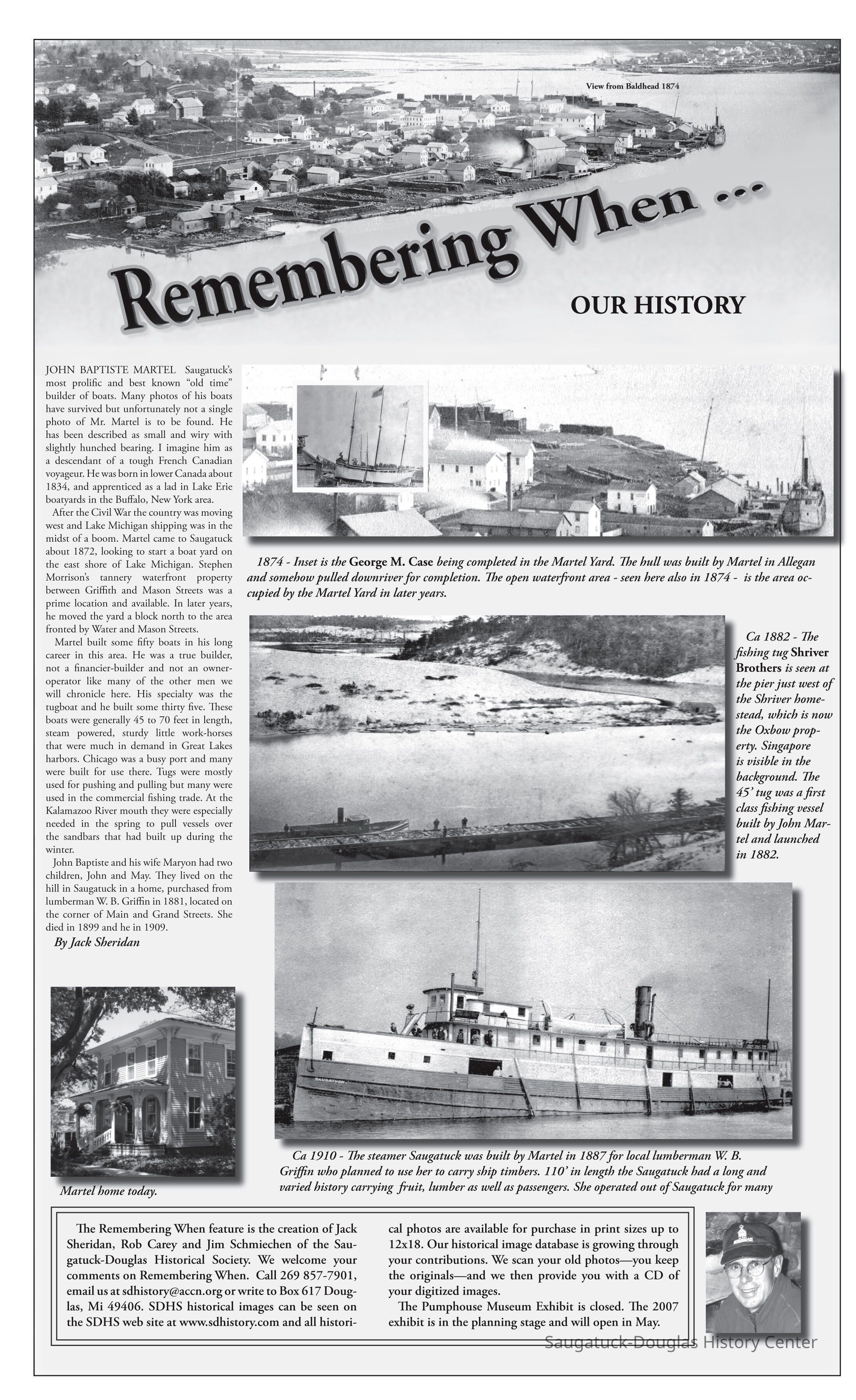 After the Civil War the country was moving west and Lake Michigan shipping was in the midst of a boom. Martel came to Saugatuck about 1872, looking to start a boat yard on the east shore of Lake Michigan. Stephen Morrison’s tannery waterfront property between Griffith and Mason Streets was a prime location and available. In later years, he moved the yard a block north to the area fronted by Water and Mason Streets.