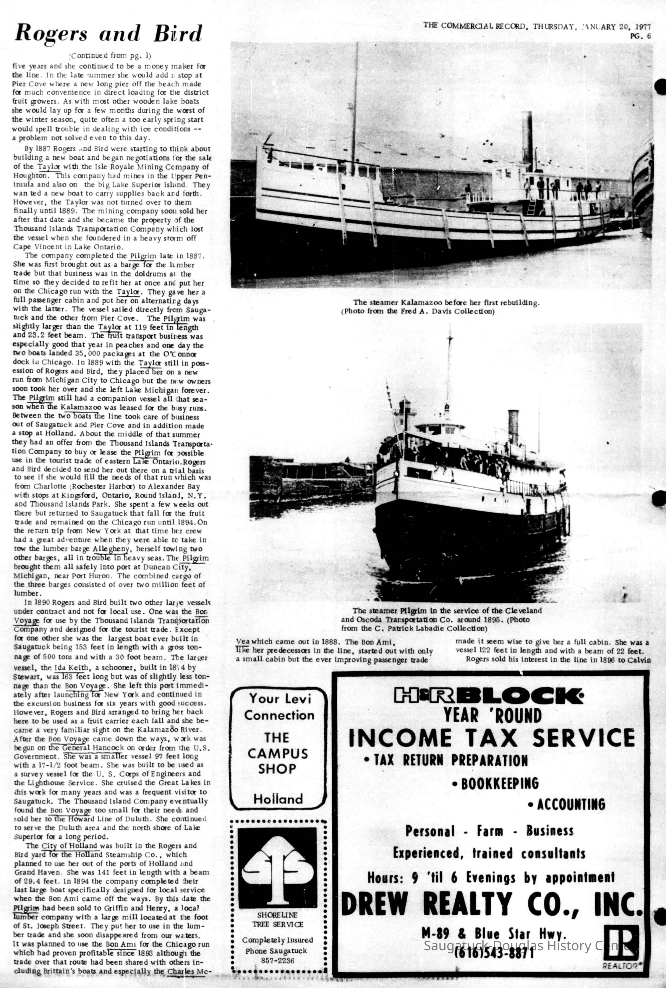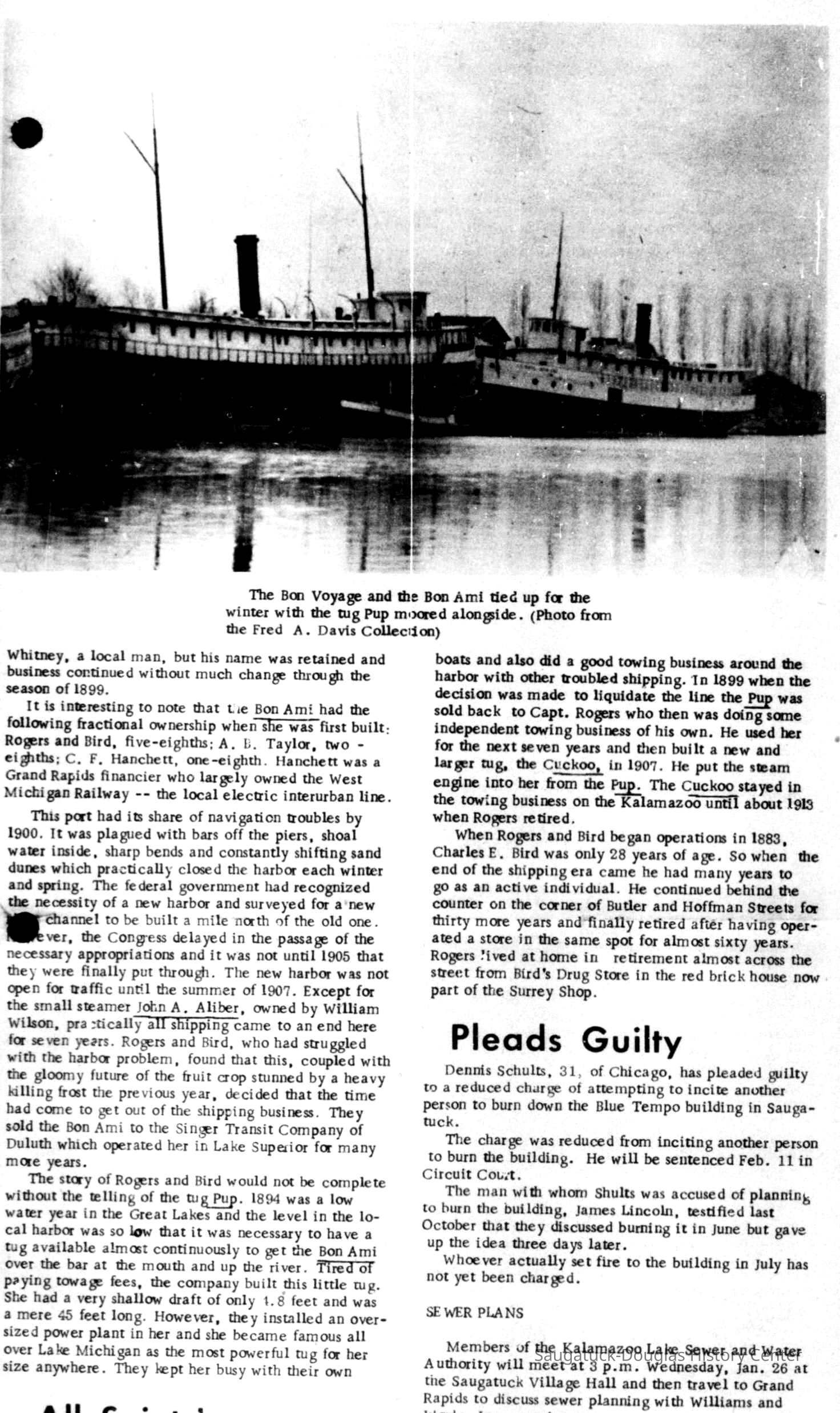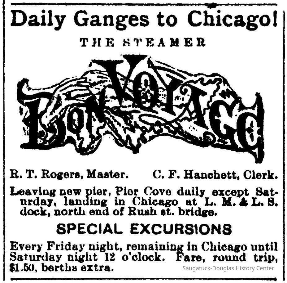 Numerous vessels were built and owned by Rogers and Bird Company from 1882 to 1899. Many were built for others and not operated locally. The steamship line usually operated two or more vessels on passenger and fruit runs between Saugatuck, Pier Cove and Chicago in that period. Rube Rogers sold his interest in the steamship operation in 1896 and the company itself ceased operations by 1900.