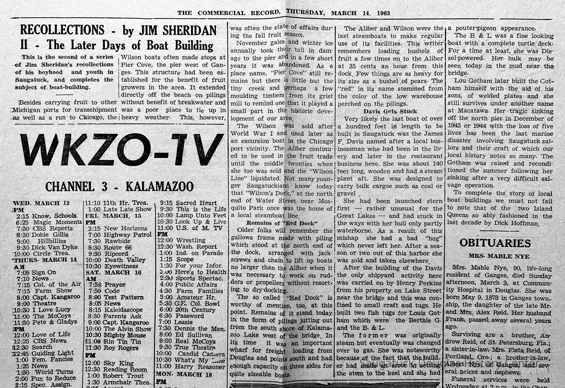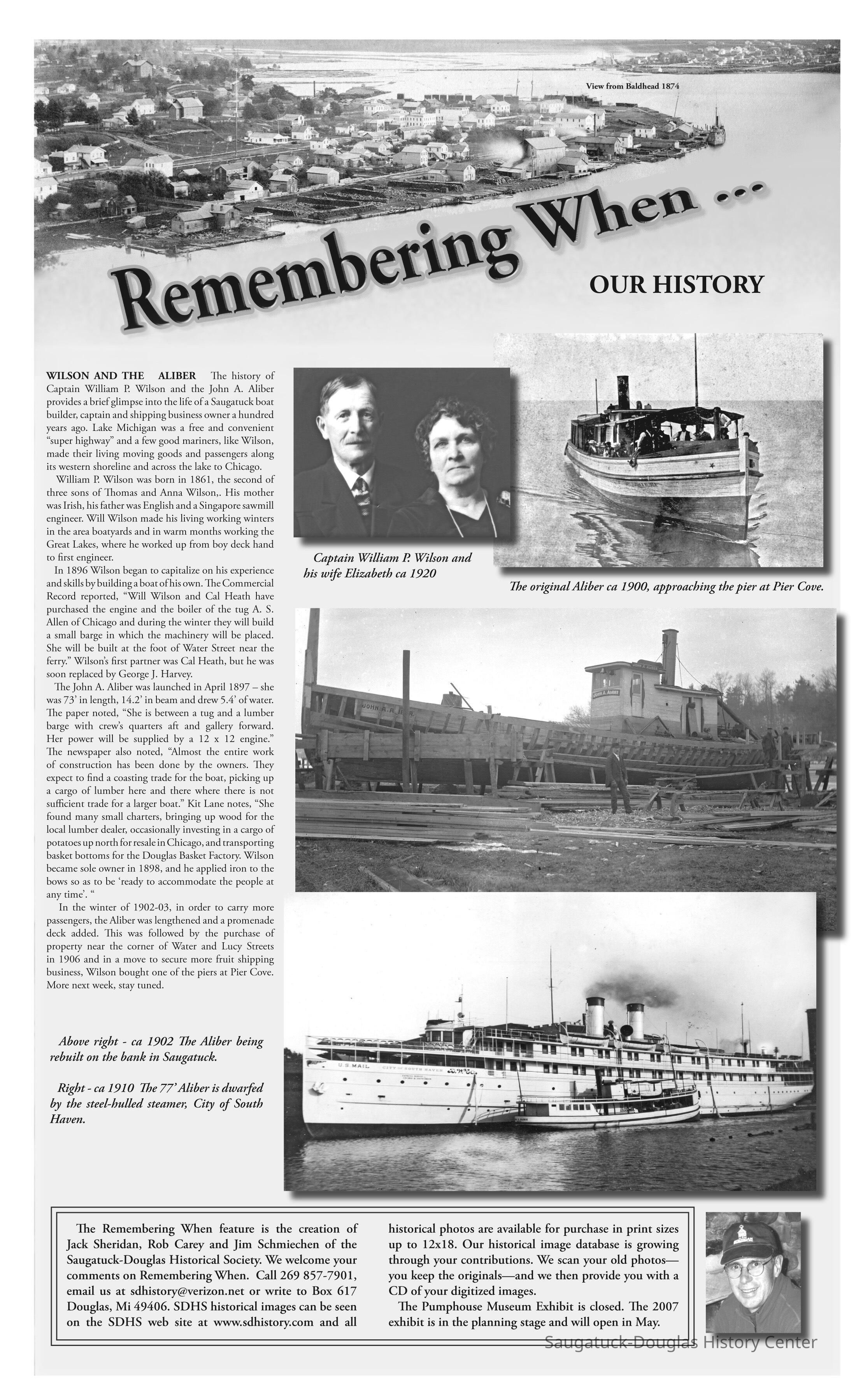 The history of Captain William P. Wilson and the John A. Aliber provides a brief glimpse into the life of a Saugatuck boat builder, captain and shipping business owner a hundred years ago. Lake Michigan was a free and convenient “super highway” and a few good mariners, like Wilson, made their living moving goods and passengers along its western shoreline and across the lake to Chicago.