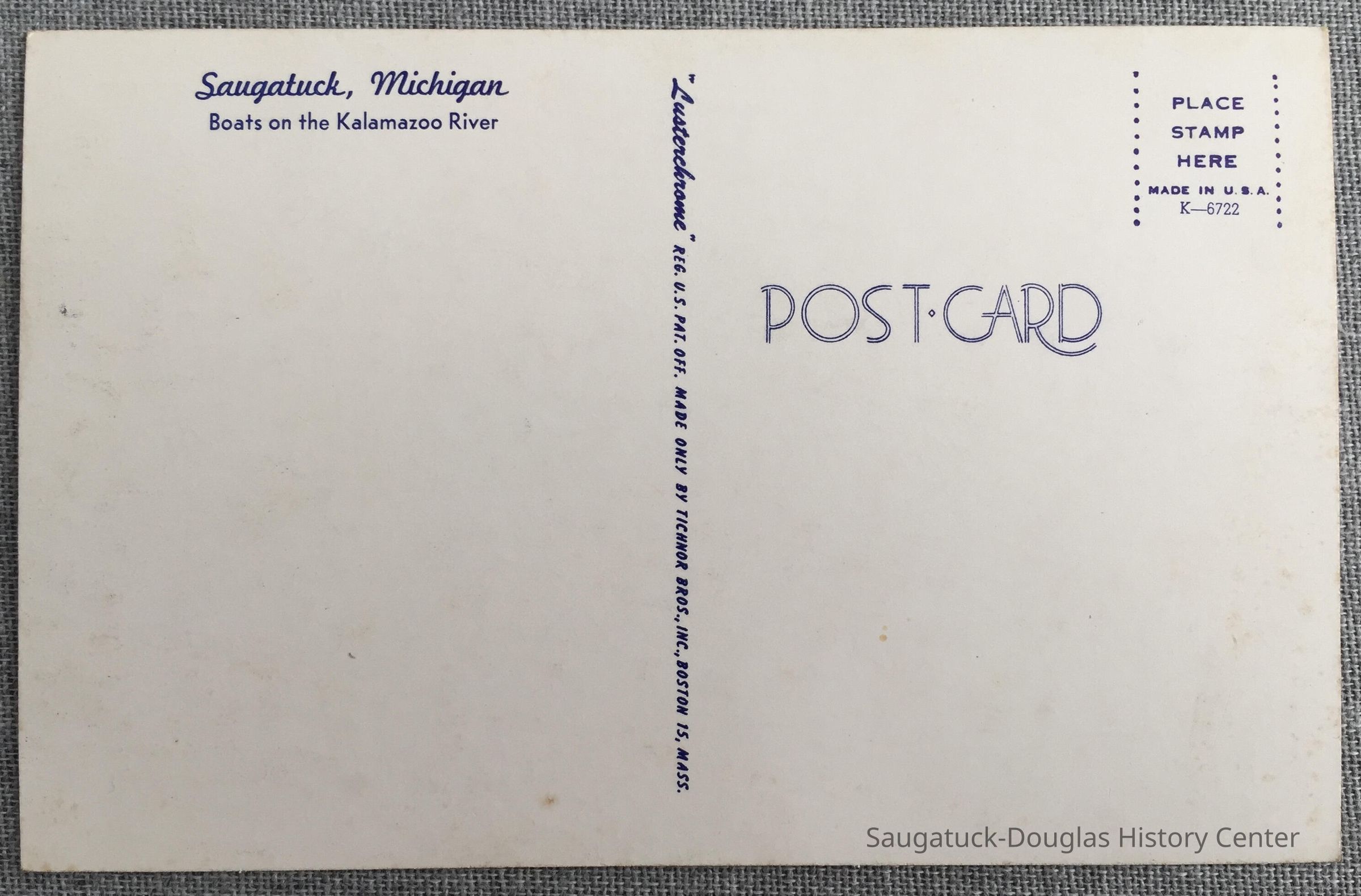 The text -- "Lusterchrome" Reg. U.S. Pat. Off. Made only by Tichnor Bros., Boston 15, Mass. -- divides the address half from the writing half on the back of the card.