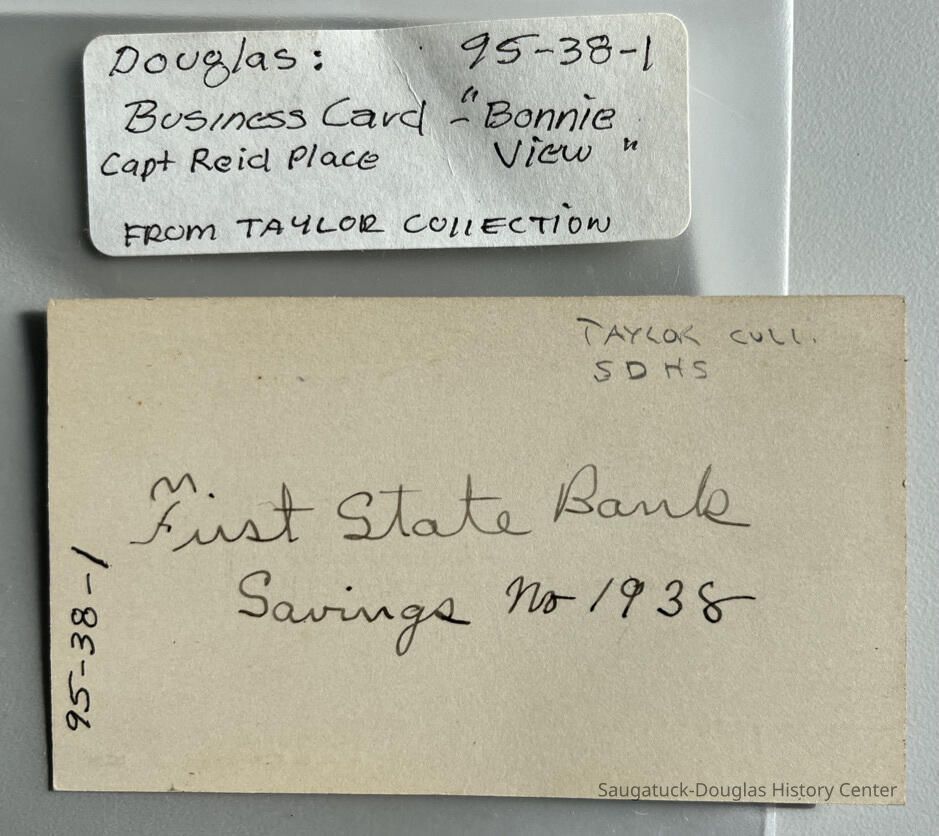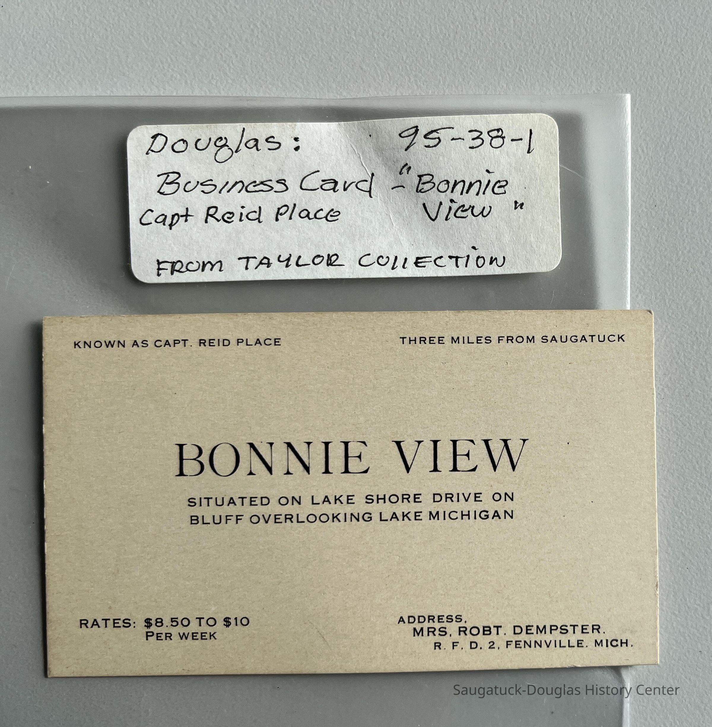 Printed card about the accommodation "Bonnie View" situated on Lake Shore Drive on bluff overlooking Lake Michigan, three miles from Saugatuck, known as Capt. Reid place, offered by Mrs. Robert Dempster of Fennville.