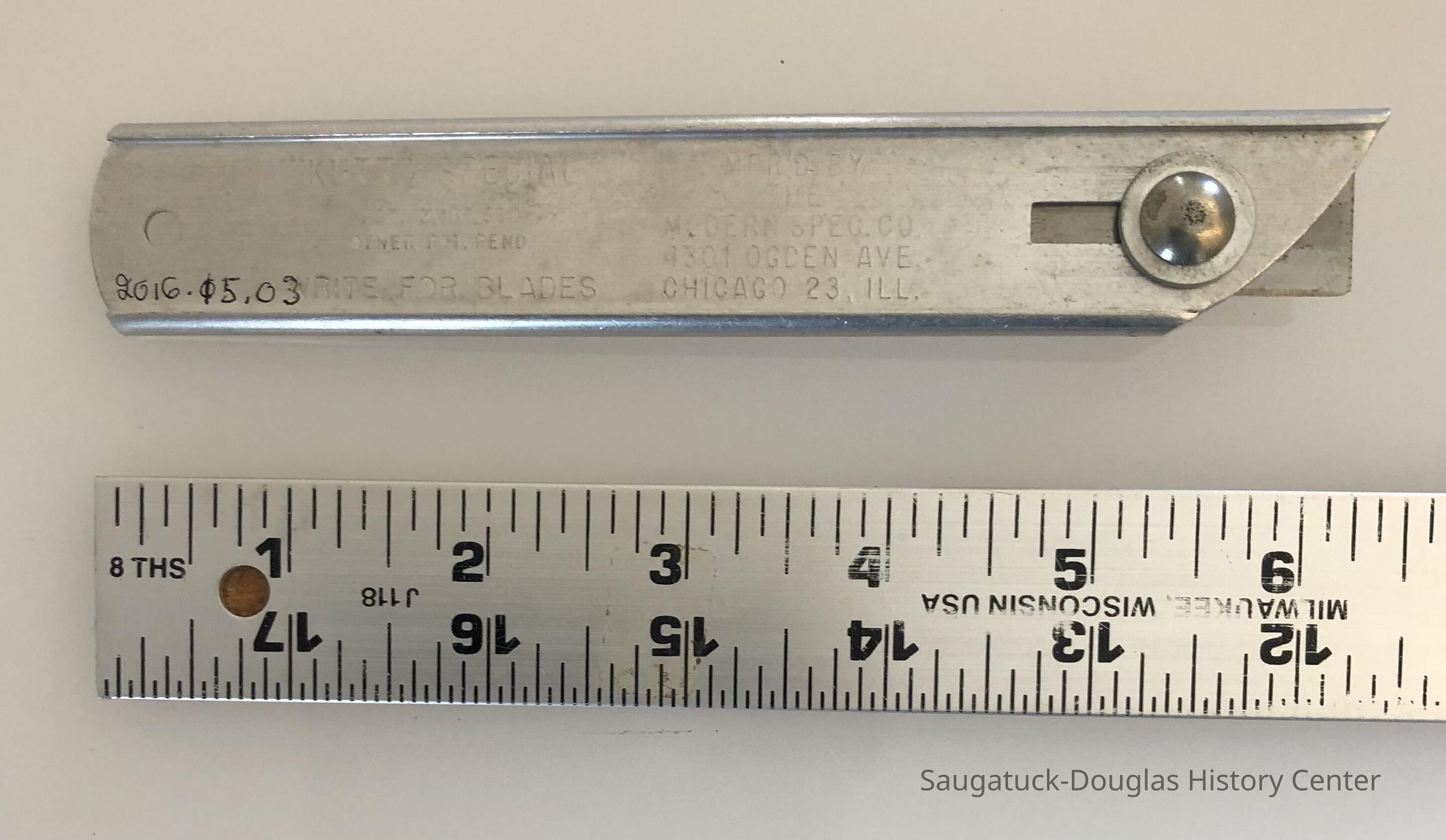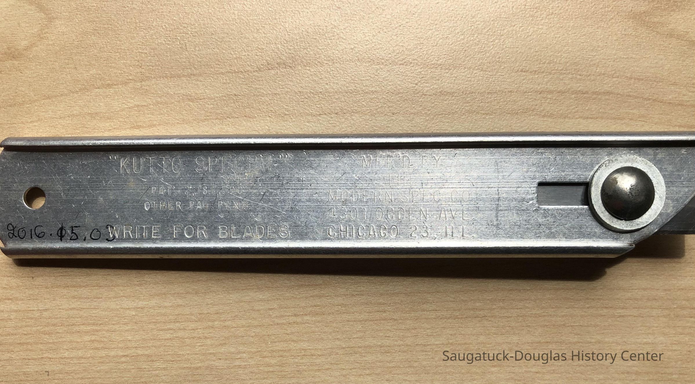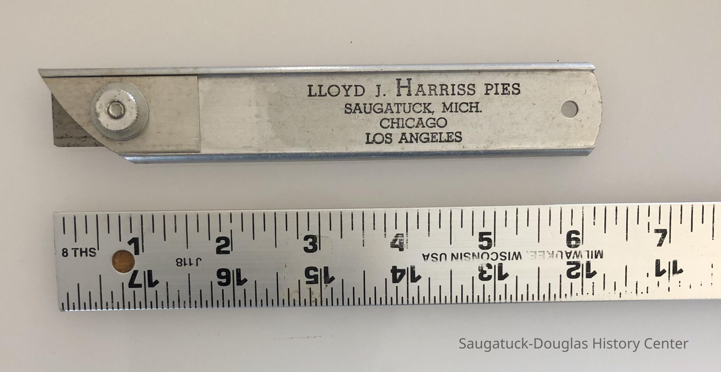 6" aluminum Box Cutter with with the words, Lloyd J. Harris Pies, Saugatuck, Mich, Chicago, Los AngelesCollection