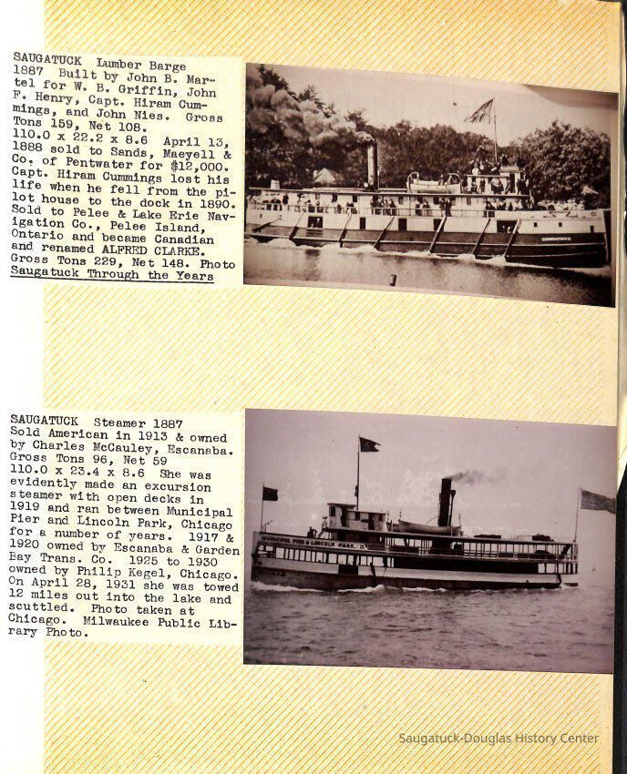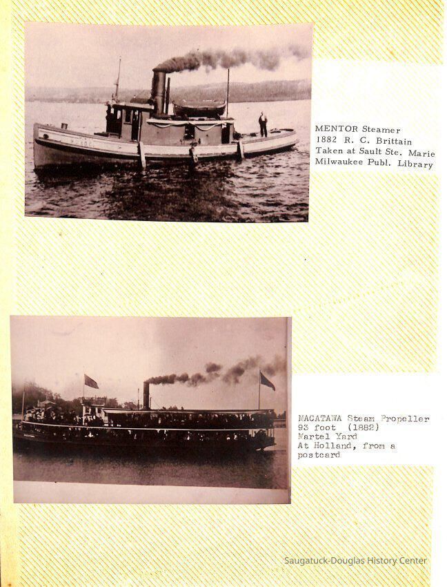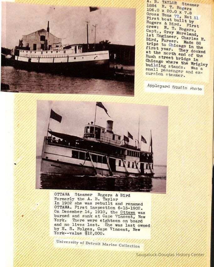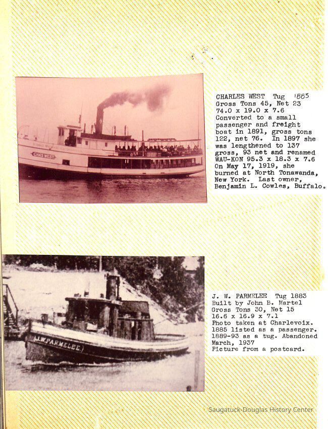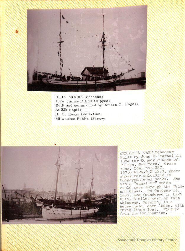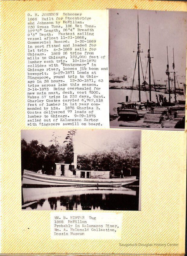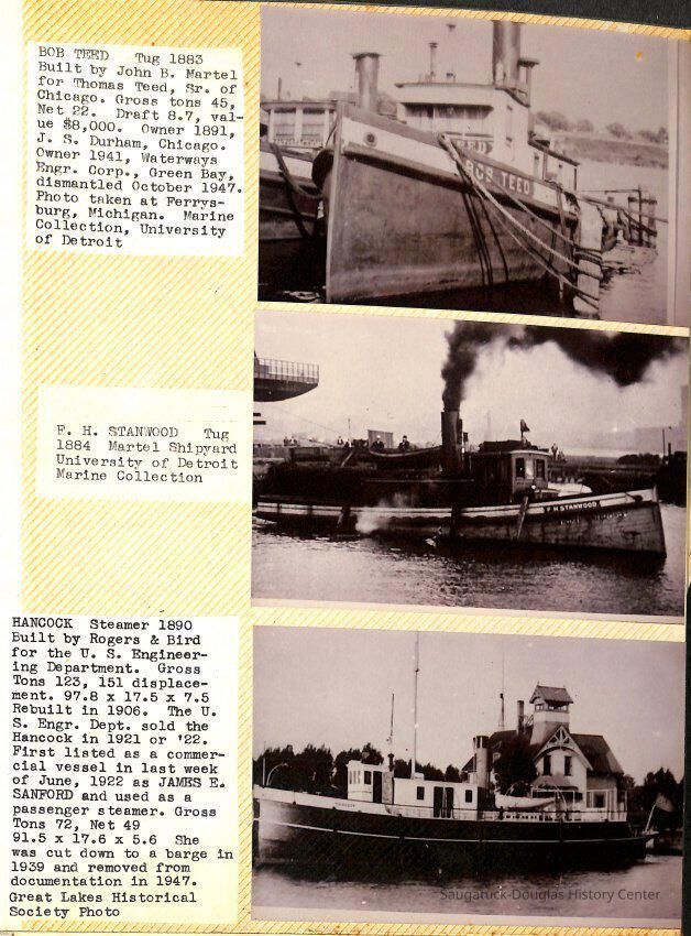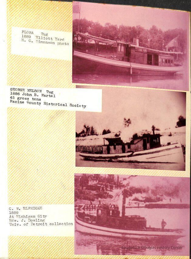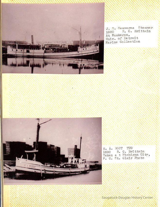 O.R. Johnson (ship), William B. Minter (ship) 1868-1901, F.B. Stockbridge (ship) 1873-1908, H.D. Moore (ship), George M. Case (ship), Saugatuck (tug) 1875-1930, J.S. Seaverns (ship) 1800, H.A. Root (ship) 1800, Douglas (ship) 1882, Mentor (ship) 1882, Macatawa (ship) 1882, A.C. Colborn (ship) 1882-1922, Charles West (ship) 1885 / Wau-Kon 1897 -1919, J.W. Parmelee (ship) 1883-1937, A.B. Taylor (ship) 1884 / Ottawa 1902-1910, Pearl B. Campbell (ship) 1883-1895, Joseph C. Suit (ship), Bob Teed (ship) 1883, F.H. Stanwood (ship) 1884, Hancock (ship) 1890-1947, Kalamazoo (ship) 1888-1892, Saugatuck (ship) 1887, R.C. Brittain (ship), Brittain, Ralph Case 1842-1905, Rogers & Bird Shipyard/Line, Cora A. Sheldon (ship) 1883, Frank Woods (ship) 1888, Charles McVea (ship) 1888-1928, Pilgrim (ship) 1888, R.C. Reid (ship) 1889, Flora (boat) 1889, George Nelson (ship) 1886, Bon Voyage (ship) 1891, Bon Ami (ship) 1894 / Northshore 1920-1945, O.E. Parks (ship) 1891, Ruby (ship) 1891, Pup (boat) 1894-1915 (left Saugatuck in 1907), Mae Martel (ship), John A. Aliber (boat) 1897-c1927, City of Holland (ship) 1893, J.S. Crouse (ship) 1898, A.R. Heath (boat) 1900-c1915, Tuscarora (boat) 1906, Cuckoo (ship) 1907, Anna C. Wilson (ship) 1912-1943, G.P. Heath (ship) 1871-1887, Ira Chaffee (ship) 1867