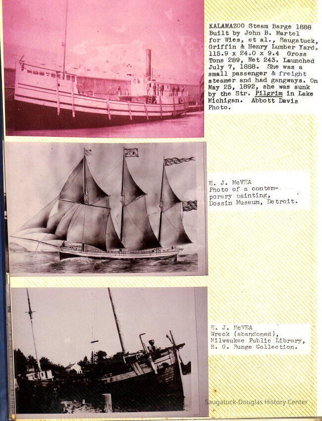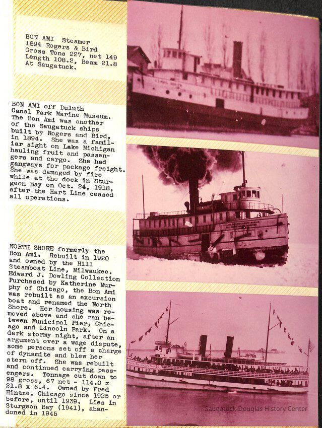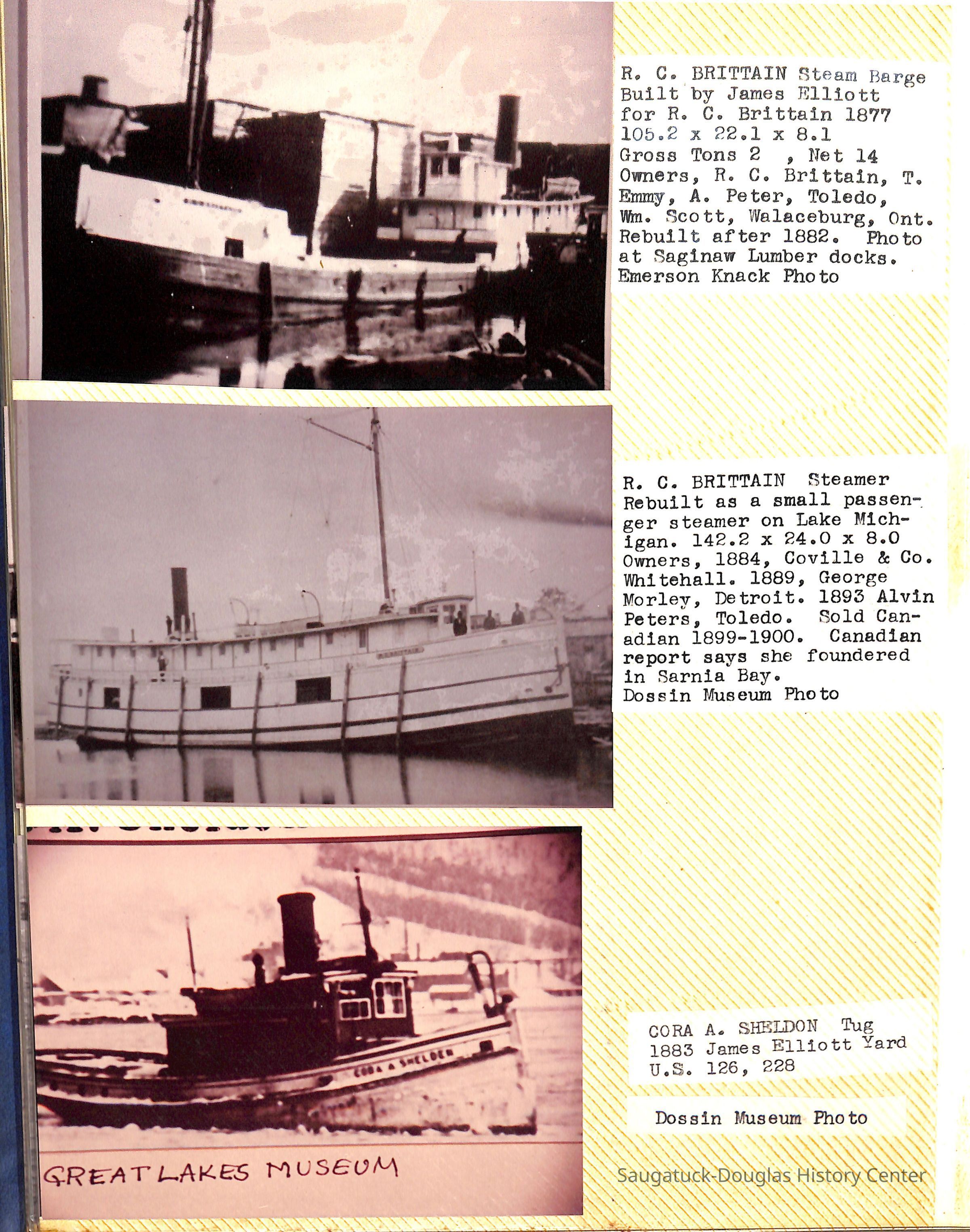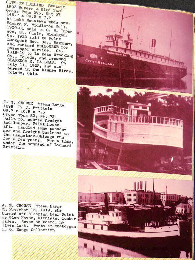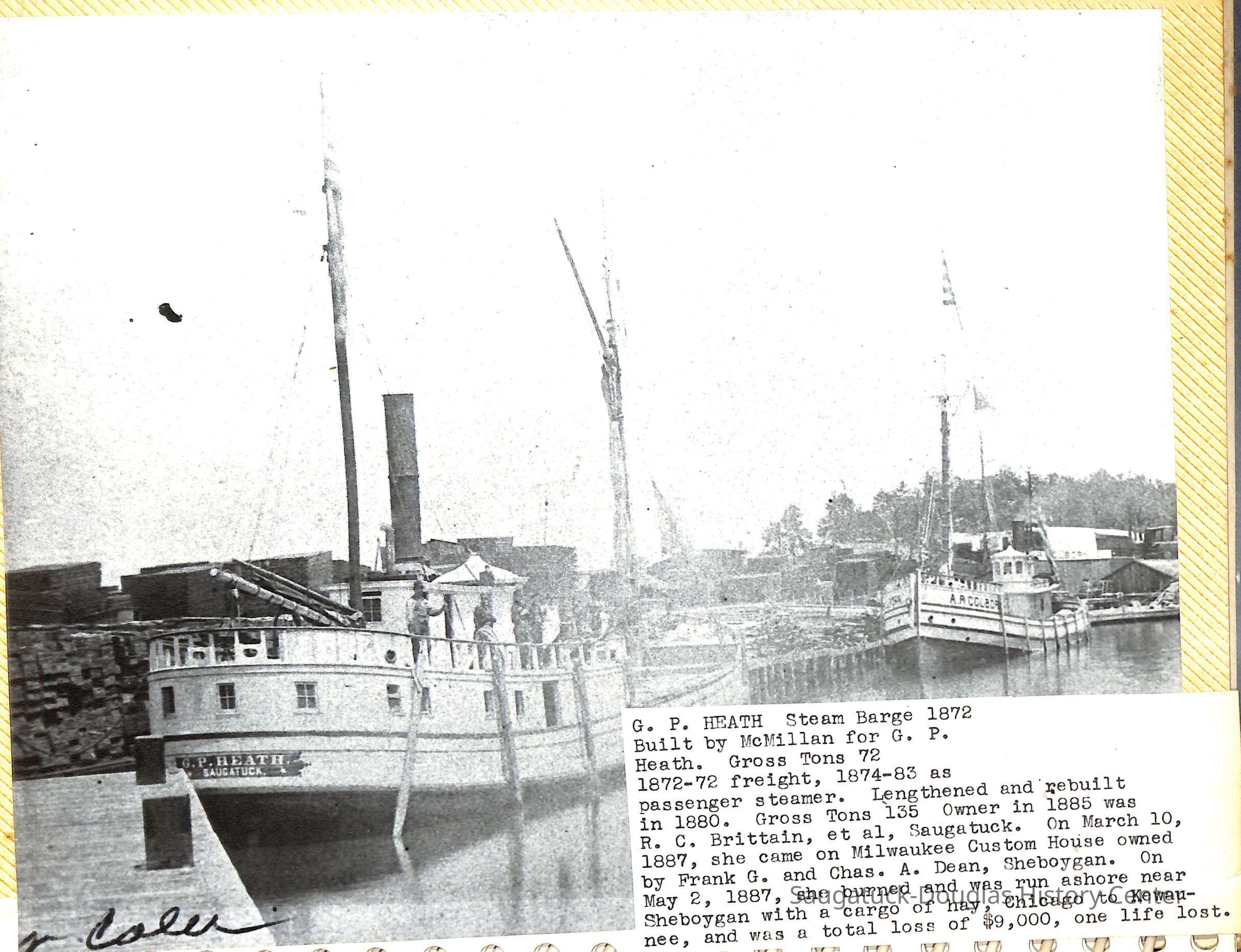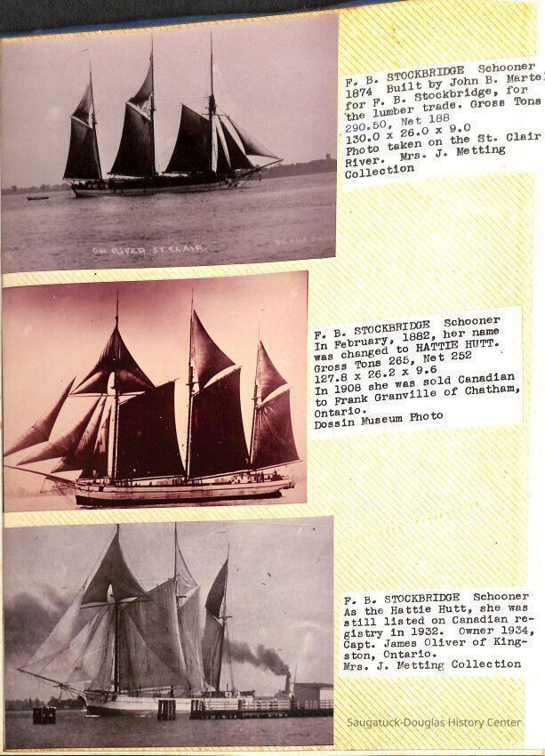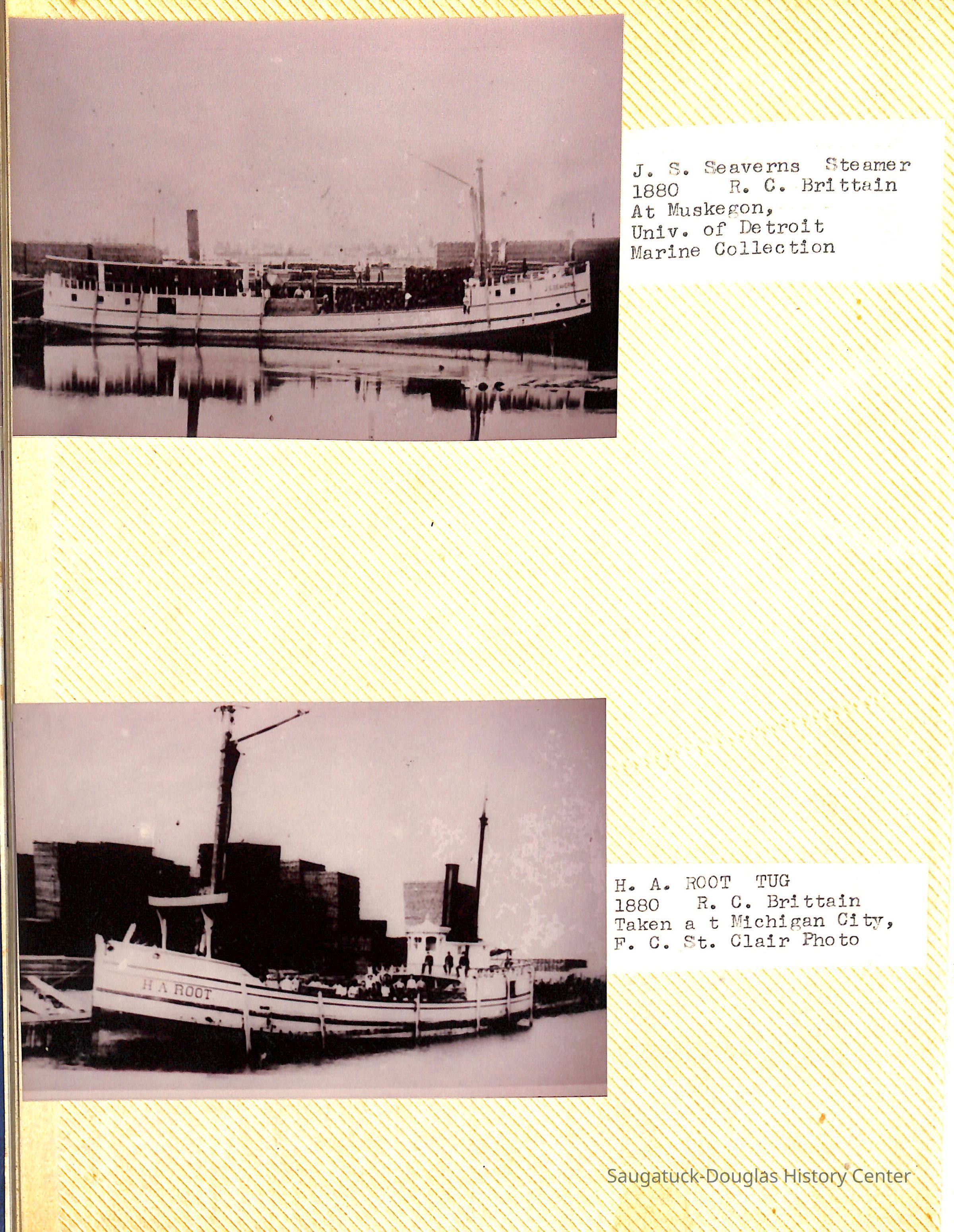 O.R. Johnson (ship), William B. Minter (ship) 1868-1901, F.B. Stockbridge (ship) 1873-1908, H.D. Moore (ship), George M. Case (ship), Saugatuck (tug) 1875-1930, J.S. Seaverns (ship) 1800, H.A. Root (ship) 1800, Douglas (ship) 1882, Mentor (ship) 1882, Macatawa (ship) 1882, A.C. Colborn (ship) 1882-1922, Charles West (ship) 1885 / Wau-Kon 1897 -1919, J.W. Parmelee (ship) 1883-1937, A.B. Taylor (ship) 1884 / Ottawa 1902-1910, Pearl B. Campbell (ship) 1883-1895, Joseph C. Suit (ship), Bob Teed (ship) 1883, F.H. Stanwood (ship) 1884, Hancock (ship) 1890-1947, Kalamazoo (ship) 1888-1892, Saugatuck (ship) 1887, R.C. Brittain (ship), Brittain, Ralph Case 1842-1905, Rogers & Bird Shipyard/Line, Cora A. Sheldon (ship) 1883, Frank Woods (ship) 1888, Charles McVea (ship) 1888-1928, Pilgrim (ship) 1888, R.C. Reid (ship) 1889, Flora (boat) 1889, George Nelson (ship) 1886, Bon Voyage (ship) 1891, Bon Ami (ship) 1894 / Northshore 1920-1945, O.E. Parks (ship) 1891, Ruby (ship) 1891, Pup (boat) 1894-1915 (left Saugatuck in 1907), Mae Martel (ship), John A. Aliber (boat) 1897-c1927, City of Holland (ship) 1893, J.S. Crouse (ship) 1898, A.R. Heath (boat) 1900-c1915, Tuscarora (boat) 1906, Cuckoo (ship) 1907, Anna C. Wilson (ship) 1912-1943, G.P. Heath (ship) 1871-1887, Ira Chaffee (ship) 1867
