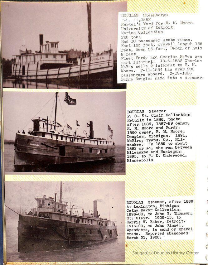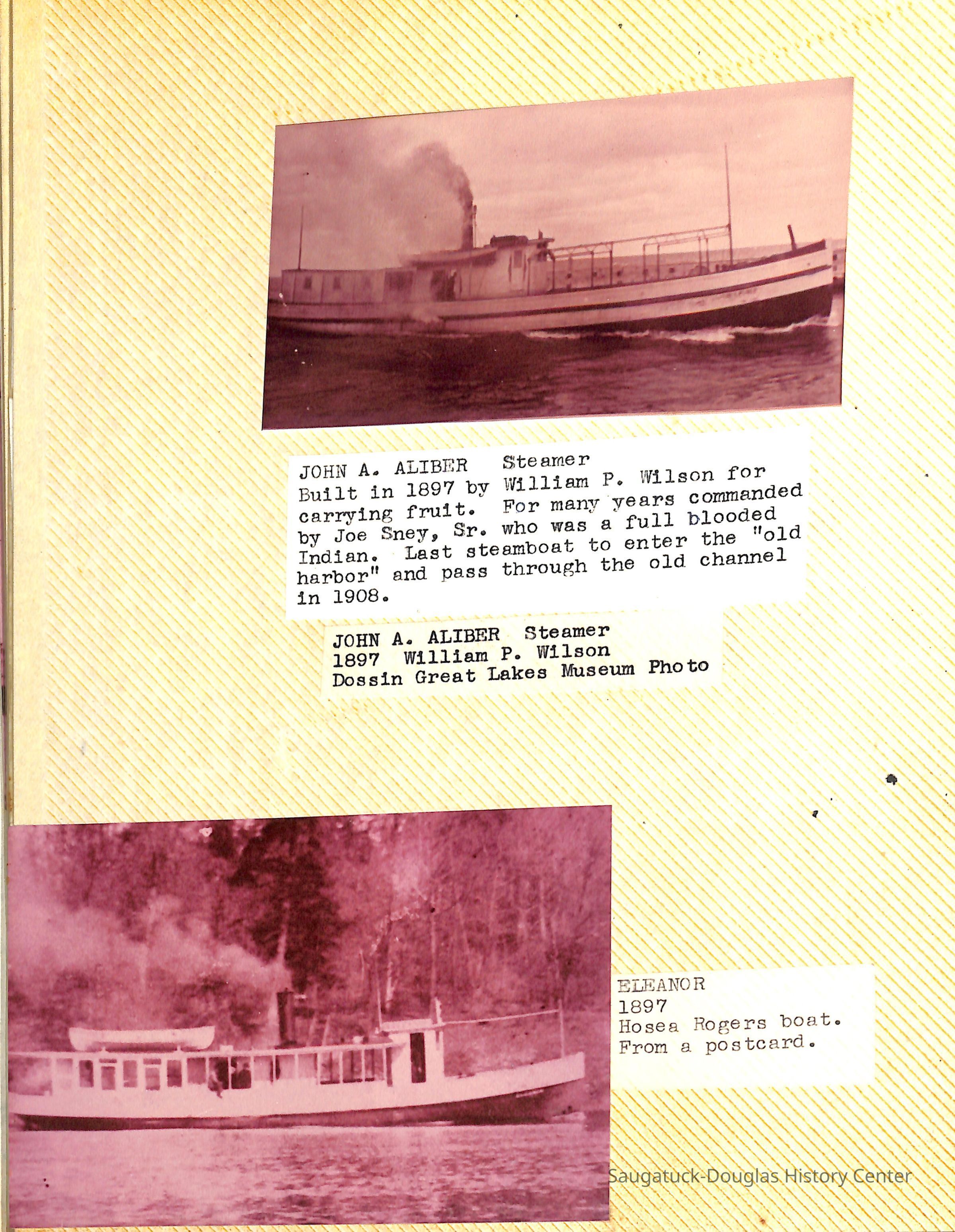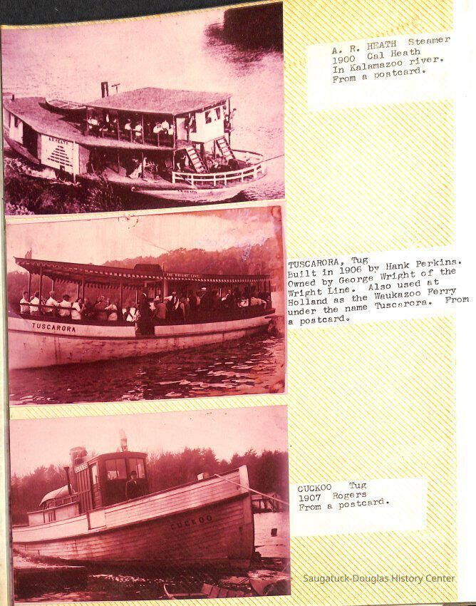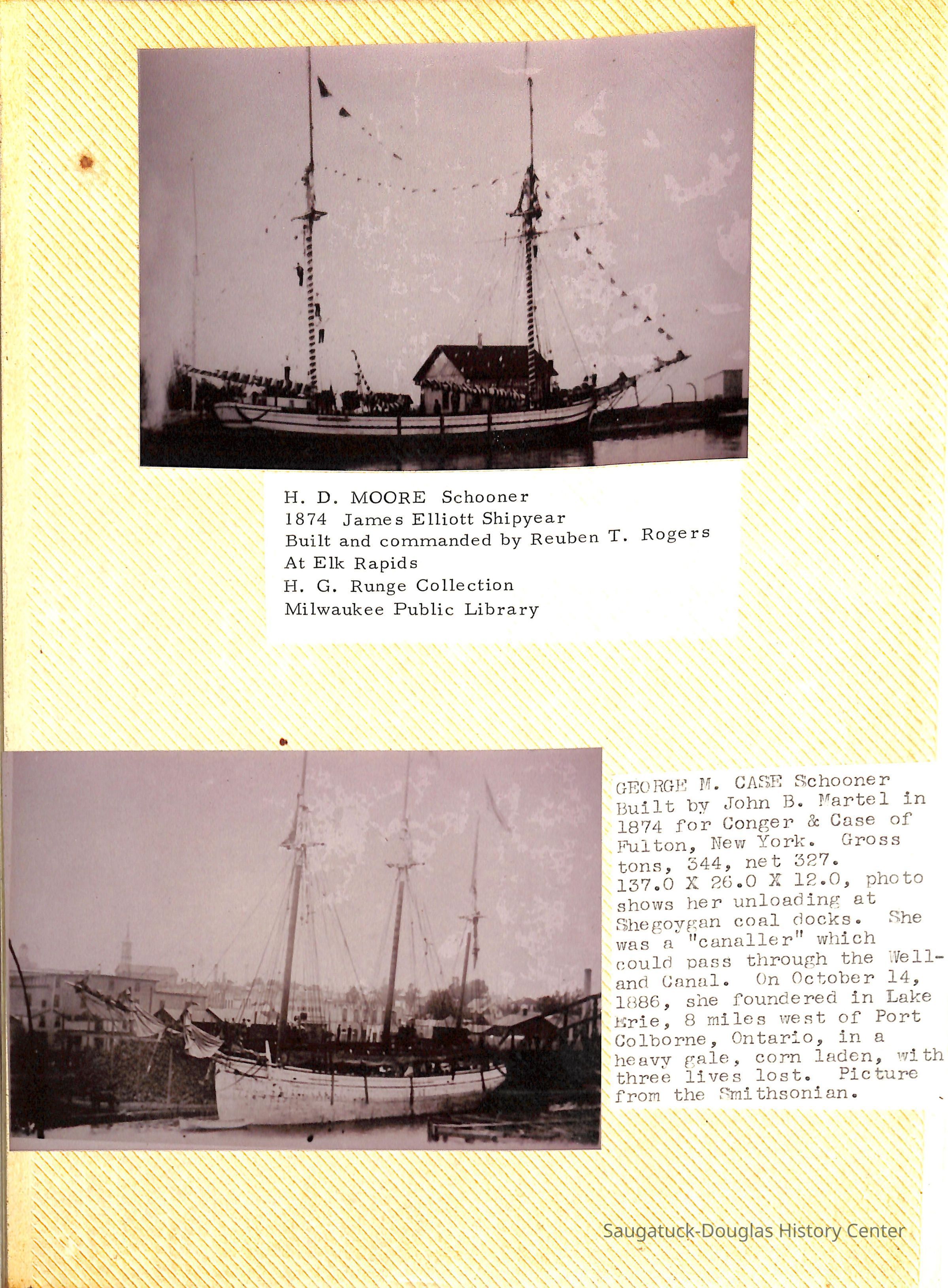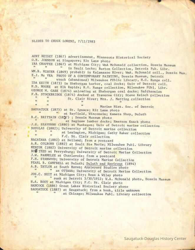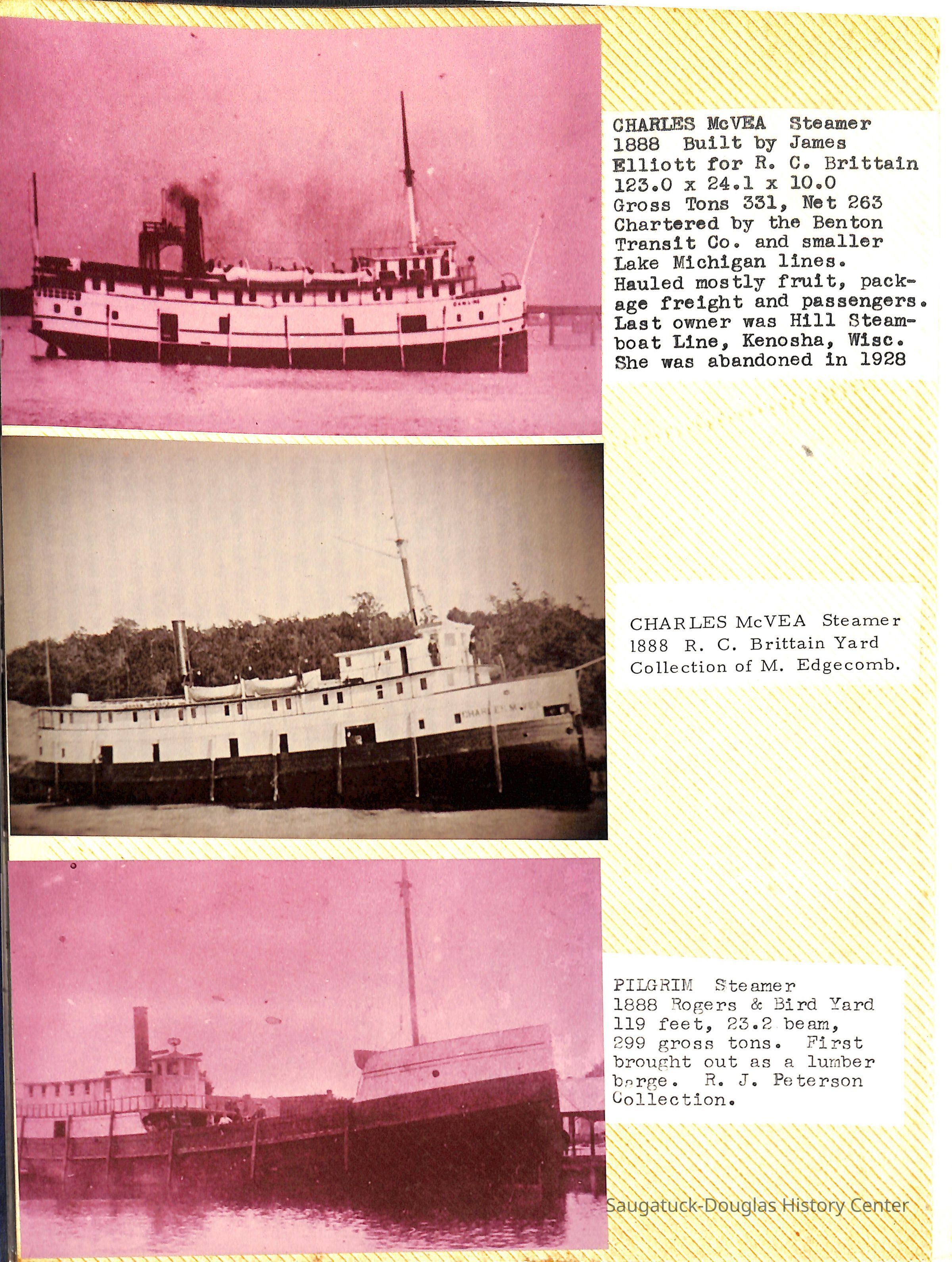 O.R. Johnson (ship), William B. Minter (ship) 1868-1901, F.B. Stockbridge (ship) 1873-1908, H.D. Moore (ship), George M. Case (ship), Saugatuck (tug) 1875-1930, J.S. Seaverns (ship) 1800, H.A. Root (ship) 1800, Douglas (ship) 1882, Mentor (ship) 1882, Macatawa (ship) 1882, A.C. Colborn (ship) 1882-1922, Charles West (ship) 1885 / Wau-Kon 1897 -1919, J.W. Parmelee (ship) 1883-1937, A.B. Taylor (ship) 1884 / Ottawa 1902-1910, Pearl B. Campbell (ship) 1883-1895, Joseph C. Suit (ship), Bob Teed (ship) 1883, F.H. Stanwood (ship) 1884, Hancock (ship) 1890-1947, Kalamazoo (ship) 1888-1892, Saugatuck (ship) 1887, R.C. Brittain (ship), Brittain, Ralph Case 1842-1905, Rogers & Bird Shipyard/Line, Cora A. Sheldon (ship) 1883, Frank Woods (ship) 1888, Charles McVea (ship) 1888-1928, Pilgrim (ship) 1888, R.C. Reid (ship) 1889, Flora (boat) 1889, George Nelson (ship) 1886, Bon Voyage (ship) 1891, Bon Ami (ship) 1894 / Northshore 1920-1945, O.E. Parks (ship) 1891, Ruby (ship) 1891, Pup (boat) 1894-1915 (left Saugatuck in 1907), Mae Martel (ship), John A. Aliber (boat) 1897-c1927, City of Holland (ship) 1893, J.S. Crouse (ship) 1898, A.R. Heath (boat) 1900-c1915, Tuscarora (boat) 1906, Cuckoo (ship) 1907, Anna C. Wilson (ship) 1912-1943, G.P. Heath (ship) 1871-1887, Ira Chaffee (ship) 1867