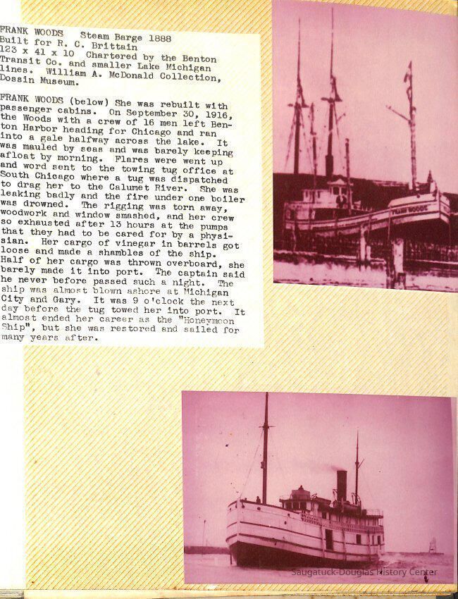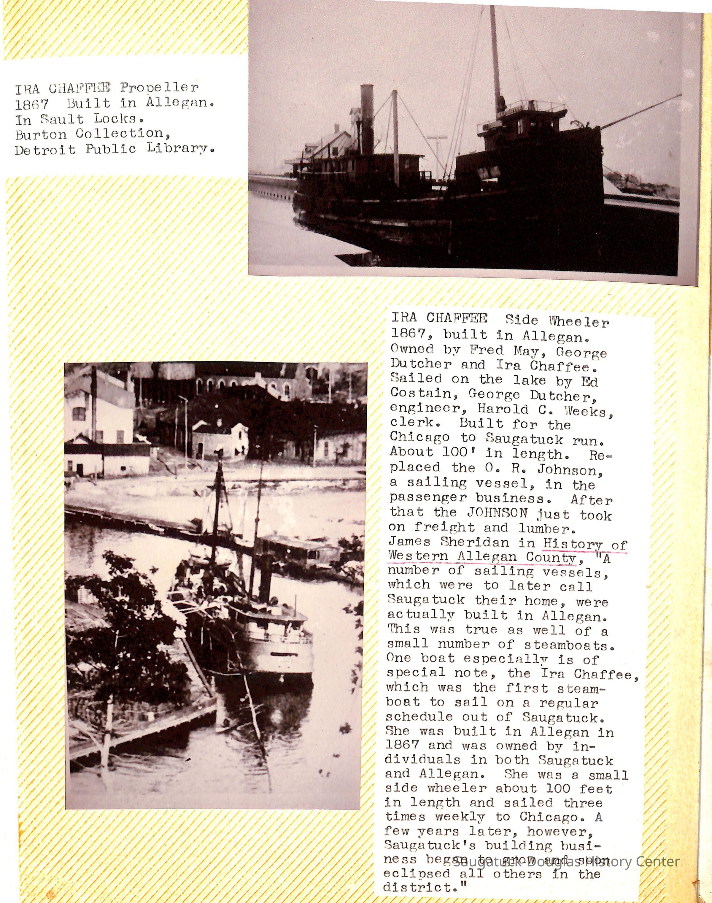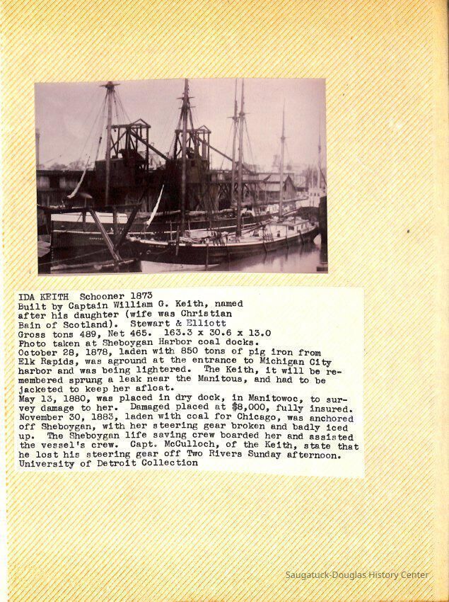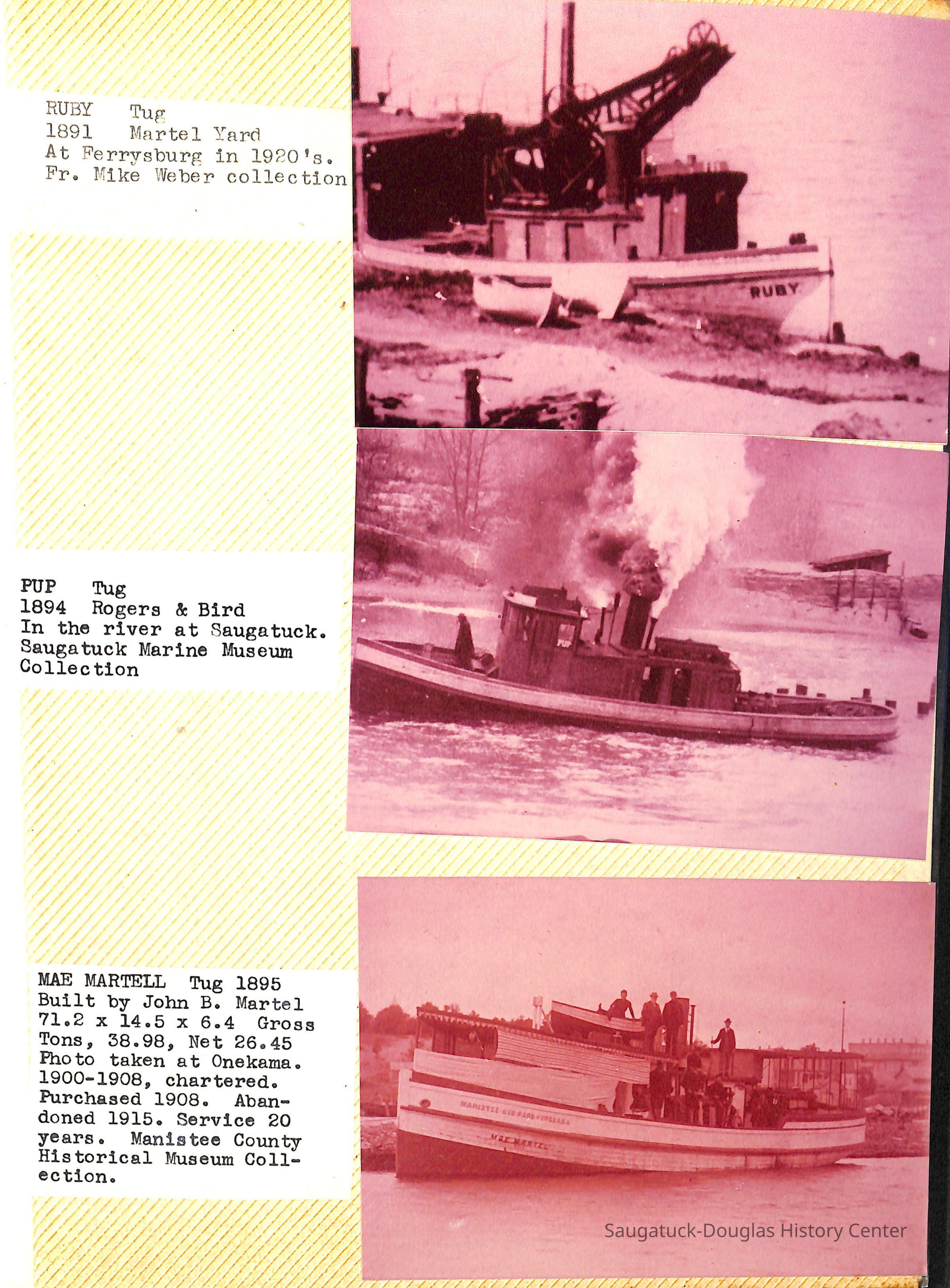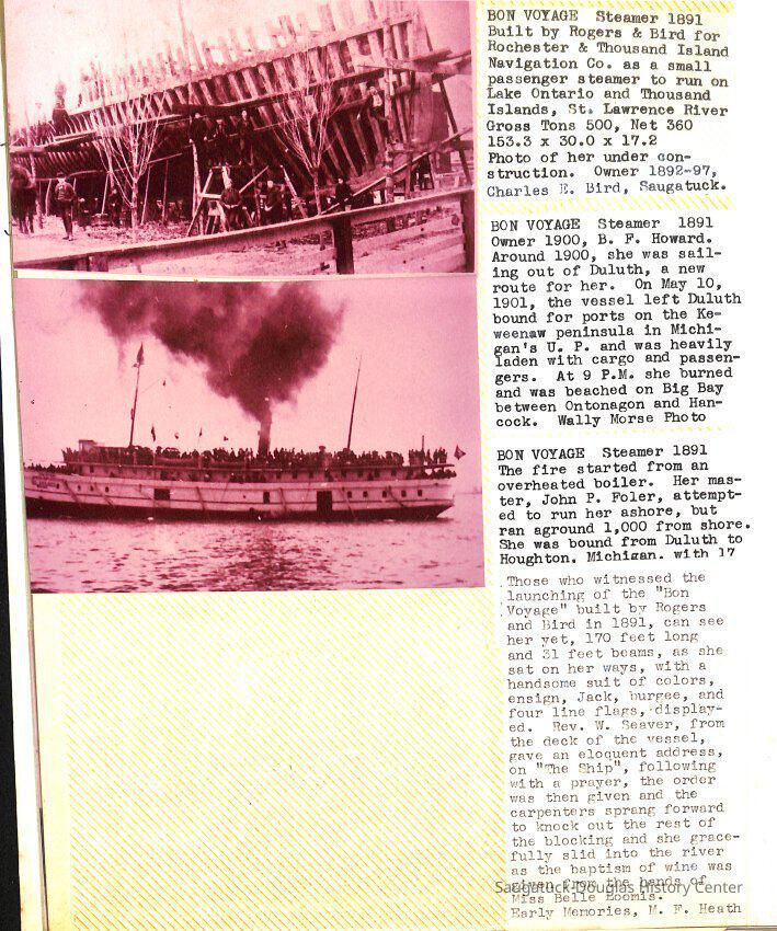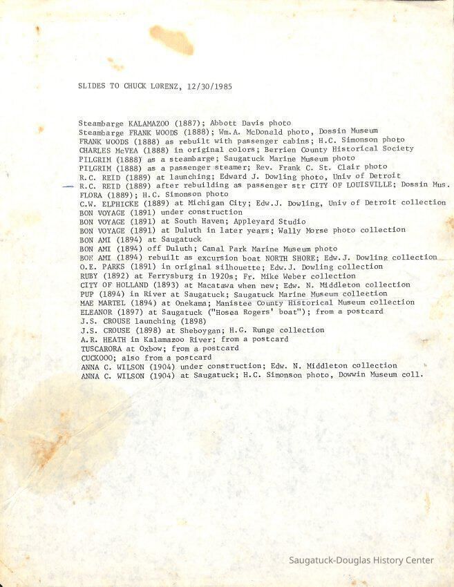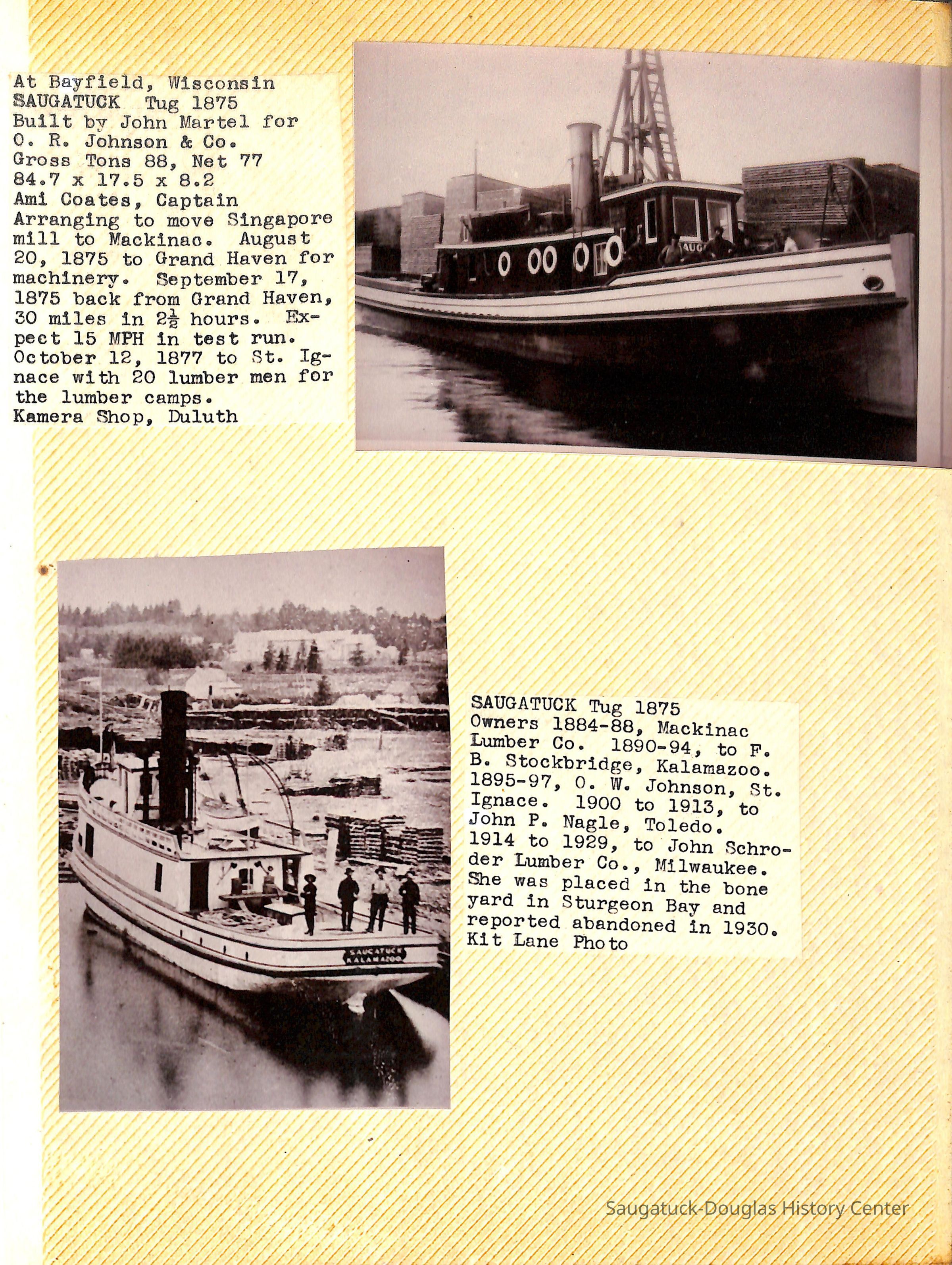 O.R. Johnson (ship), William B. Minter (ship) 1868-1901, F.B. Stockbridge (ship) 1873-1908, H.D. Moore (ship), George M. Case (ship), Saugatuck (tug) 1875-1930, J.S. Seaverns (ship) 1800, H.A. Root (ship) 1800, Douglas (ship) 1882, Mentor (ship) 1882, Macatawa (ship) 1882, A.C. Colborn (ship) 1882-1922, Charles West (ship) 1885 / Wau-Kon 1897 -1919, J.W. Parmelee (ship) 1883-1937, A.B. Taylor (ship) 1884 / Ottawa 1902-1910, Pearl B. Campbell (ship) 1883-1895, Joseph C. Suit (ship), Bob Teed (ship) 1883, F.H. Stanwood (ship) 1884, Hancock (ship) 1890-1947, Kalamazoo (ship) 1888-1892, Saugatuck (ship) 1887, R.C. Brittain (ship), Brittain, Ralph Case 1842-1905, Rogers & Bird Shipyard/Line, Cora A. Sheldon (ship) 1883, Frank Woods (ship) 1888, Charles McVea (ship) 1888-1928, Pilgrim (ship) 1888, R.C. Reid (ship) 1889, Flora (boat) 1889, George Nelson (ship) 1886, Bon Voyage (ship) 1891, Bon Ami (ship) 1894 / Northshore 1920-1945, O.E. Parks (ship) 1891, Ruby (ship) 1891, Pup (boat) 1894-1915 (left Saugatuck in 1907), Mae Martel (ship), John A. Aliber (boat) 1897-c1927, City of Holland (ship) 1893, J.S. Crouse (ship) 1898, A.R. Heath (boat) 1900-c1915, Tuscarora (boat) 1906, Cuckoo (ship) 1907, Anna C. Wilson (ship) 1912-1943, G.P. Heath (ship) 1871-1887, Ira Chaffee (ship) 1867