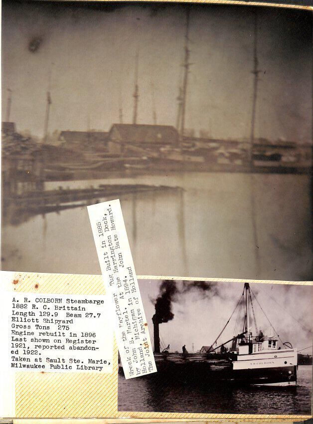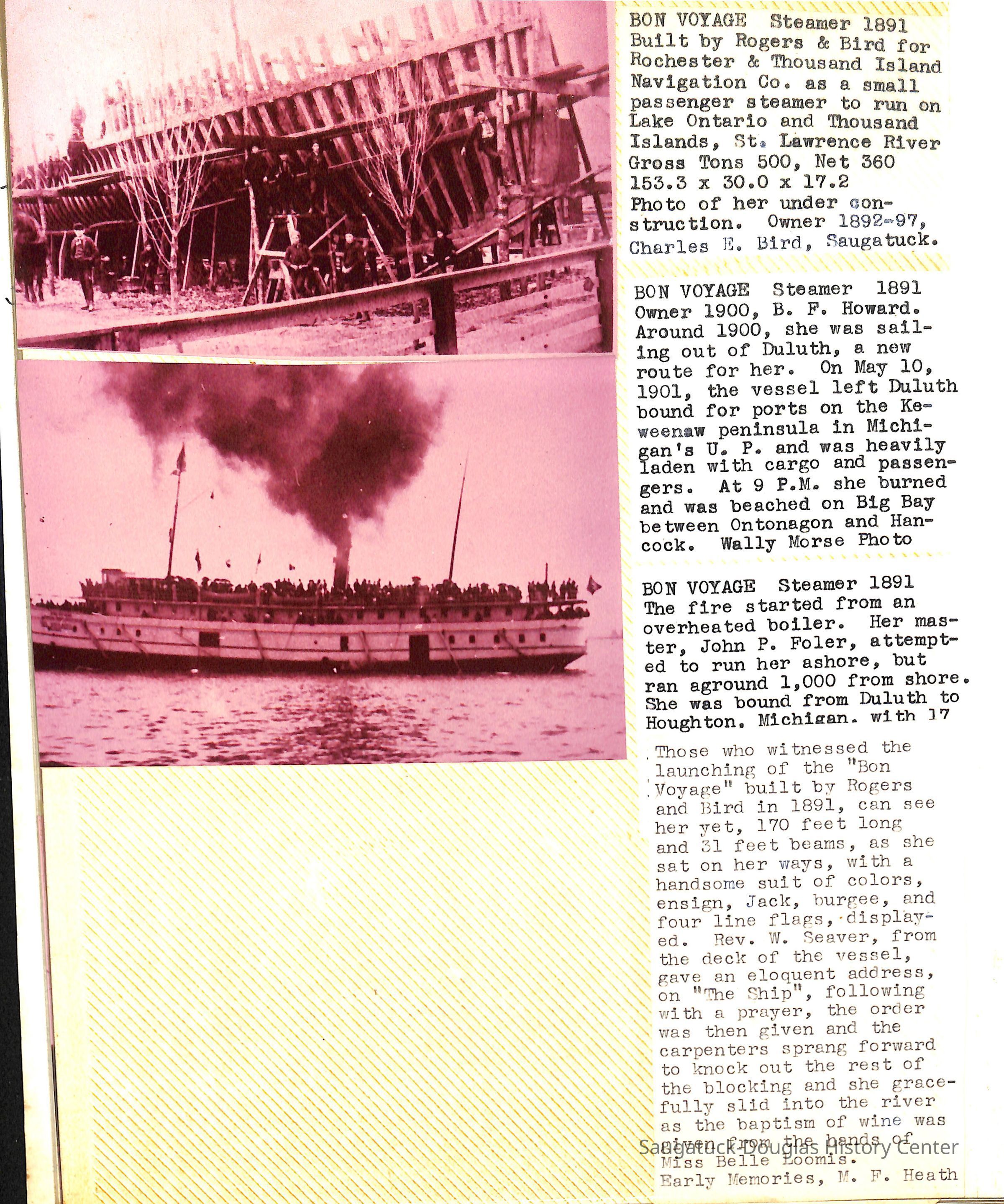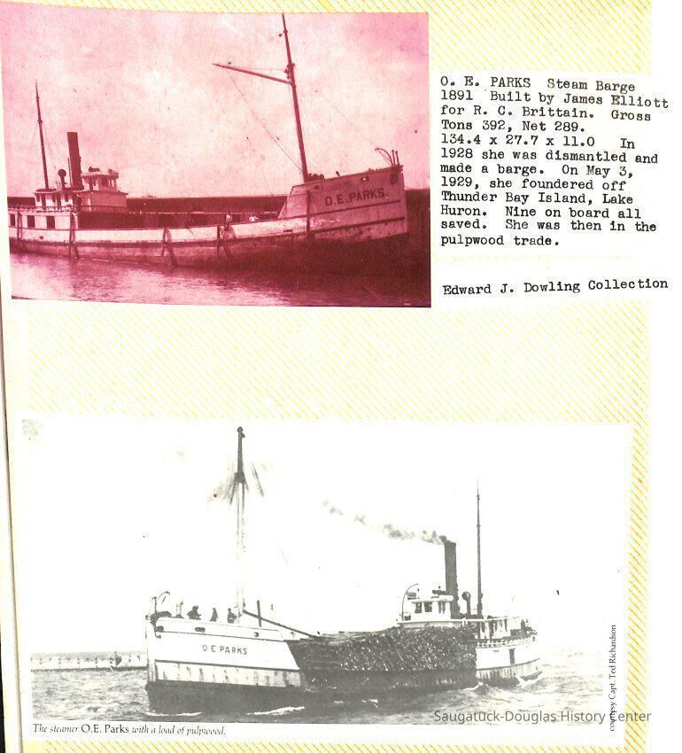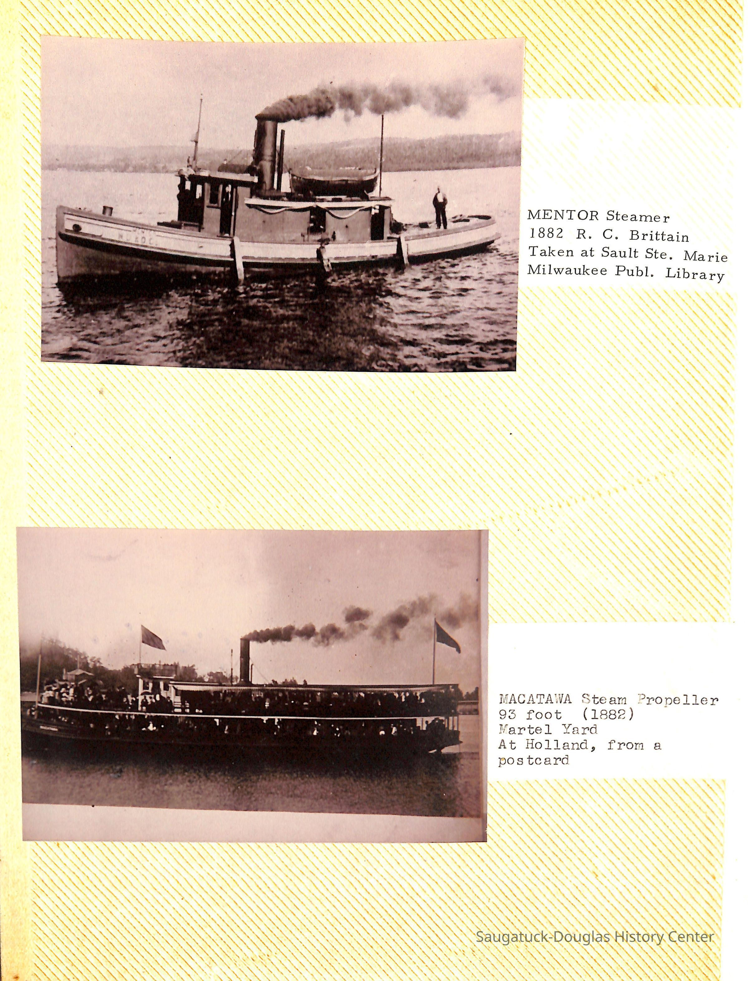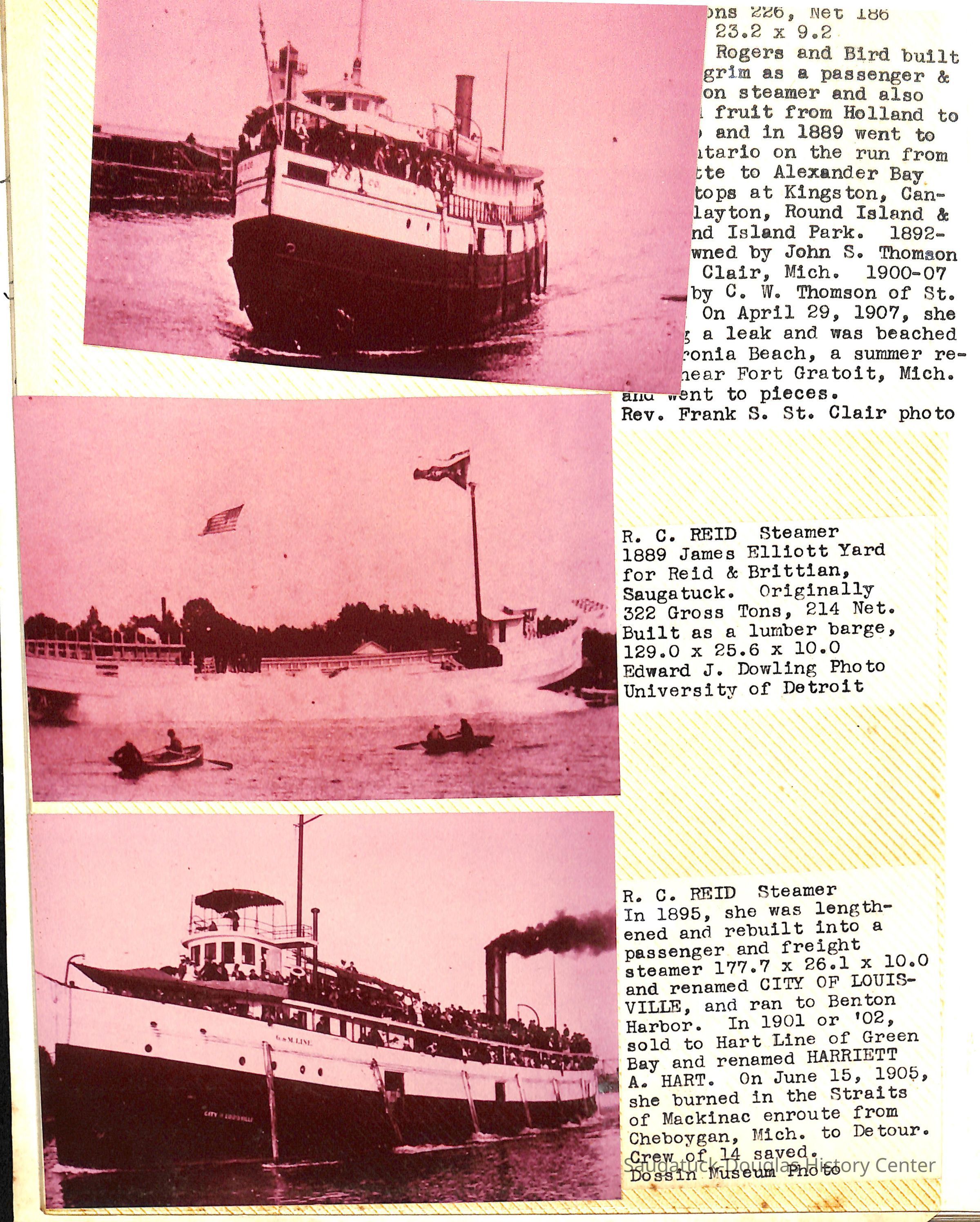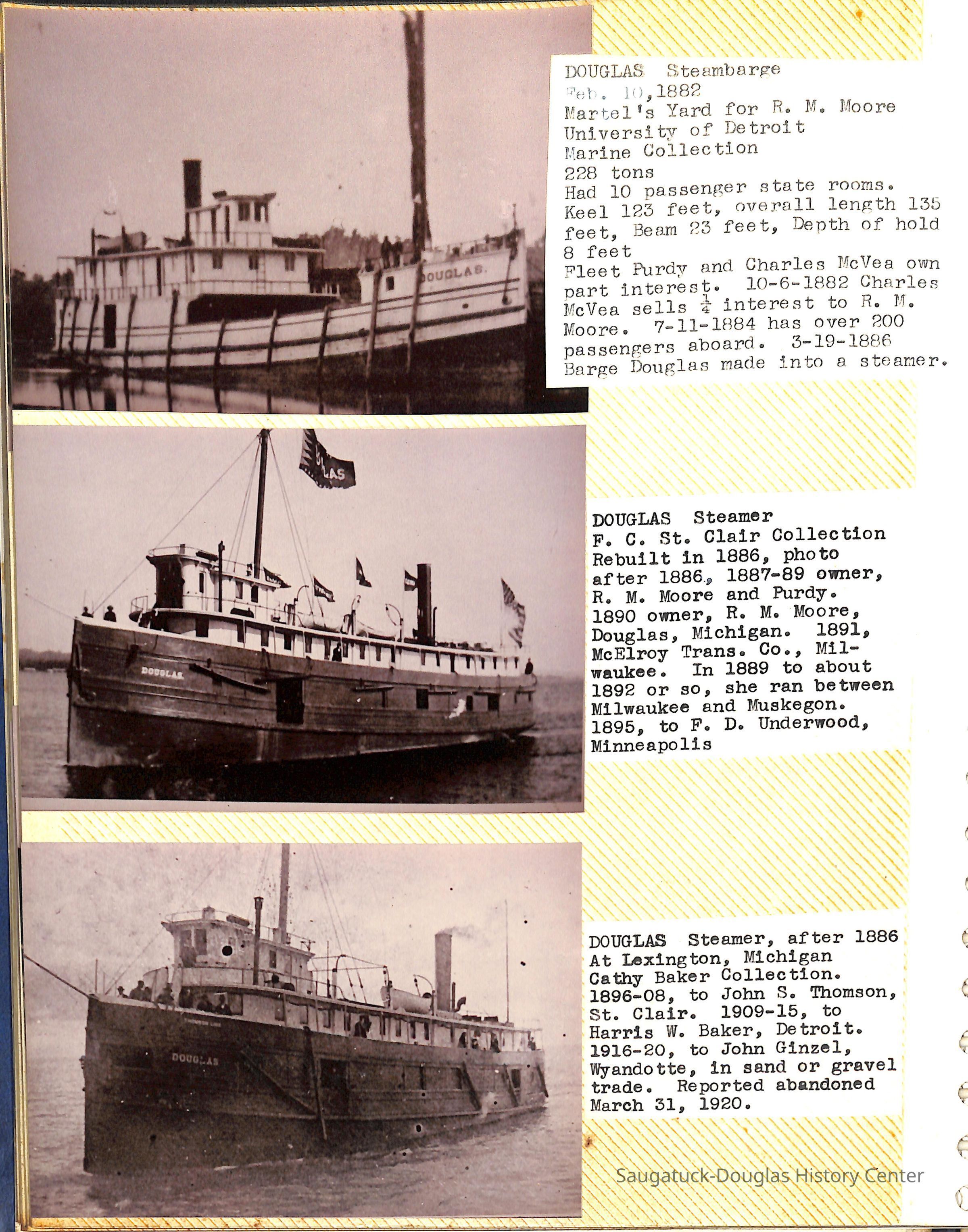 O.R. Johnson (ship), William B. Minter (ship) 1868-1901, F.B. Stockbridge (ship) 1873-1908, H.D. Moore (ship), George M. Case (ship), Saugatuck (tug) 1875-1930, J.S. Seaverns (ship) 1800, H.A. Root (ship) 1800, Douglas (ship) 1882, Mentor (ship) 1882, Macatawa (ship) 1882, A.C. Colborn (ship) 1882-1922, Charles West (ship) 1885 / Wau-Kon 1897 -1919, J.W. Parmelee (ship) 1883-1937, A.B. Taylor (ship) 1884 / Ottawa 1902-1910, Pearl B. Campbell (ship) 1883-1895, Joseph C. Suit (ship), Bob Teed (ship) 1883, F.H. Stanwood (ship) 1884, Hancock (ship) 1890-1947, Kalamazoo (ship) 1888-1892, Saugatuck (ship) 1887, R.C. Brittain (ship), Brittain, Ralph Case 1842-1905, Rogers & Bird Shipyard/Line, Cora A. Sheldon (ship) 1883, Frank Woods (ship) 1888, Charles McVea (ship) 1888-1928, Pilgrim (ship) 1888, R.C. Reid (ship) 1889, Flora (boat) 1889, George Nelson (ship) 1886, Bon Voyage (ship) 1891, Bon Ami (ship) 1894 / Northshore 1920-1945, O.E. Parks (ship) 1891, Ruby (ship) 1891, Pup (boat) 1894-1915 (left Saugatuck in 1907), Mae Martel (ship), John A. Aliber (boat) 1897-c1927, City of Holland (ship) 1893, J.S. Crouse (ship) 1898, A.R. Heath (boat) 1900-c1915, Tuscarora (boat) 1906, Cuckoo (ship) 1907, Anna C. Wilson (ship) 1912-1943, G.P. Heath (ship) 1871-1887, Ira Chaffee (ship) 1867