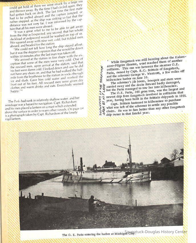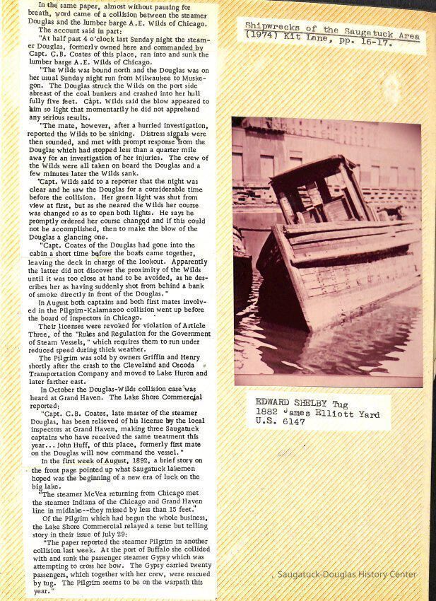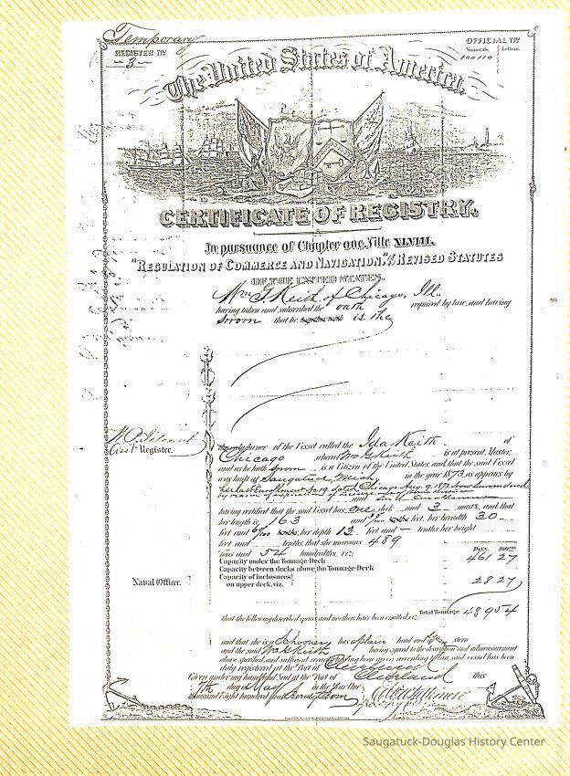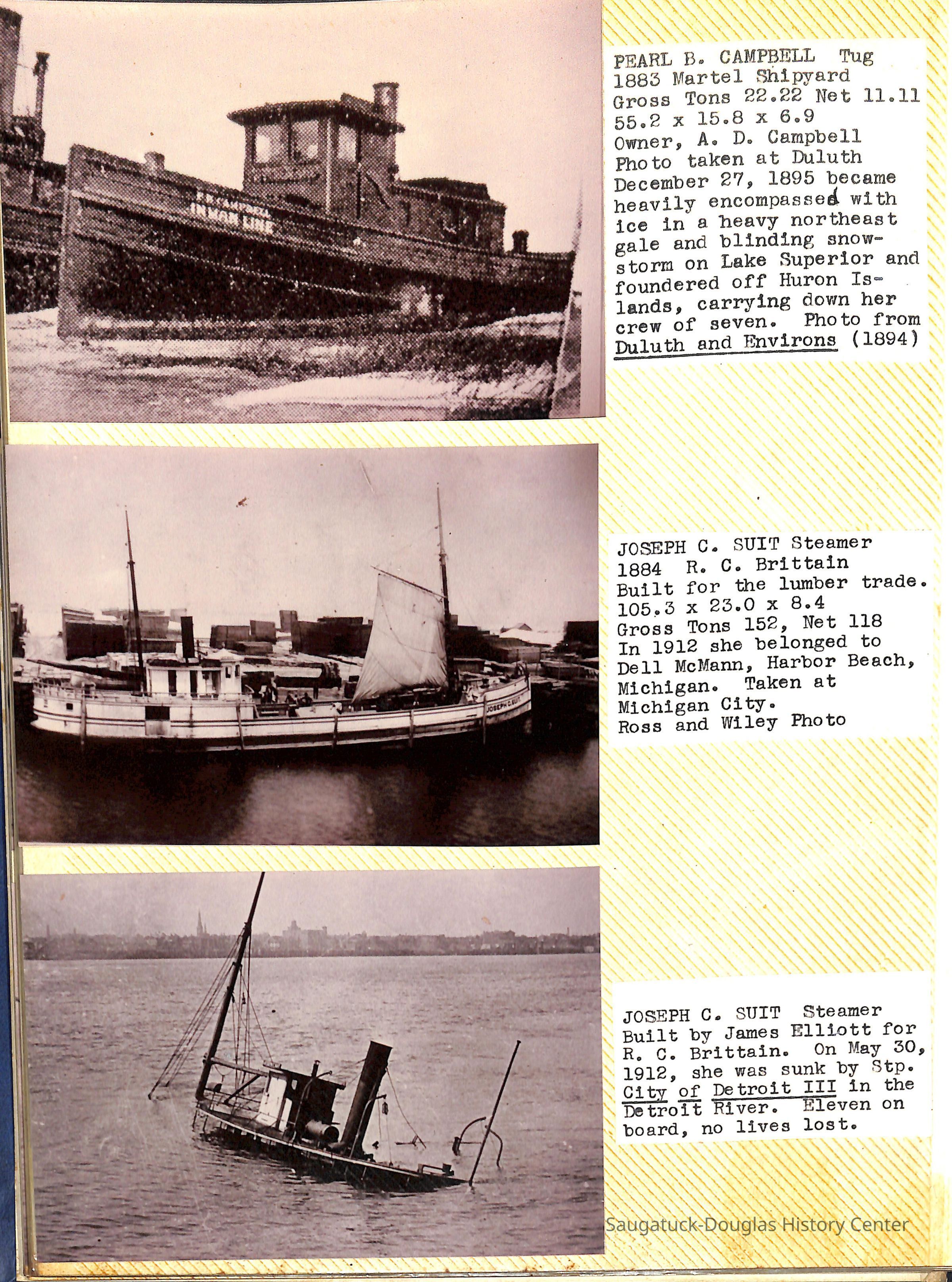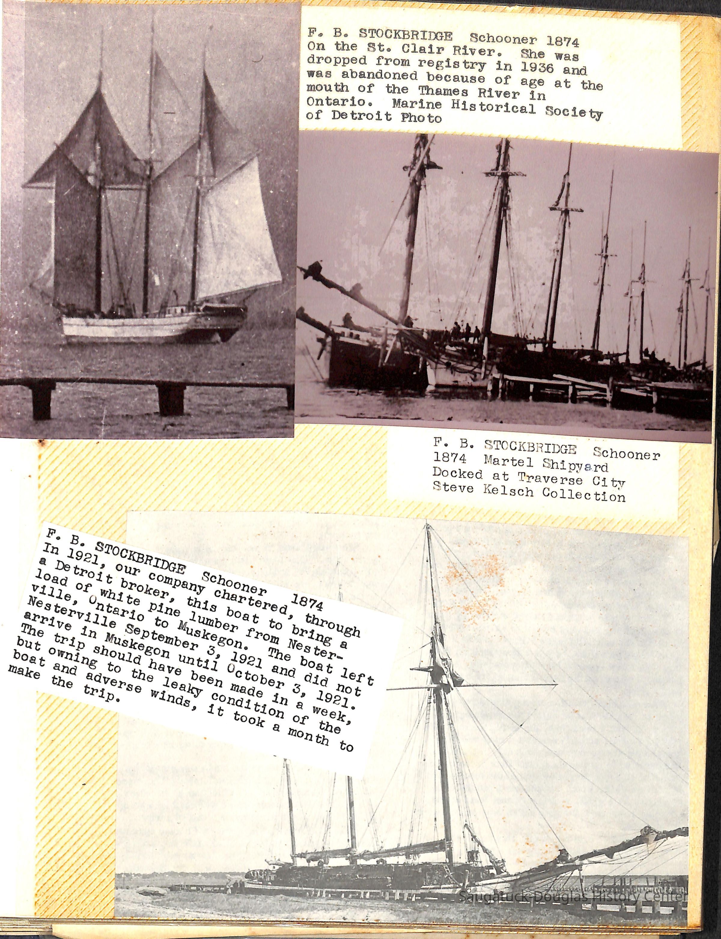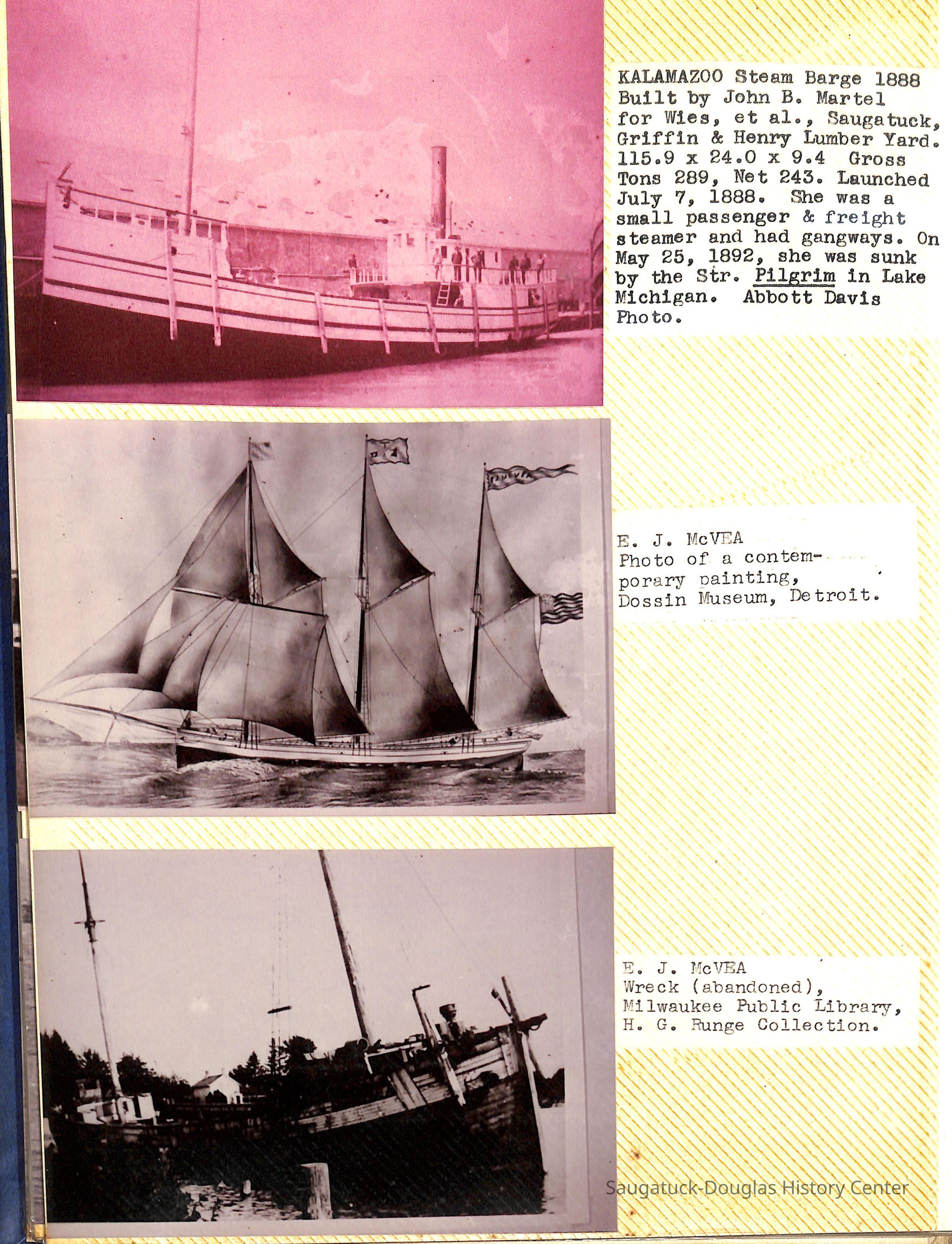 O.R. Johnson (ship), William B. Minter (ship) 1868-1901, F.B. Stockbridge (ship) 1873-1908, H.D. Moore (ship), George M. Case (ship), Saugatuck (tug) 1875-1930, J.S. Seaverns (ship) 1800, H.A. Root (ship) 1800, Douglas (ship) 1882, Mentor (ship) 1882, Macatawa (ship) 1882, A.C. Colborn (ship) 1882-1922, Charles West (ship) 1885 / Wau-Kon 1897 -1919, J.W. Parmelee (ship) 1883-1937, A.B. Taylor (ship) 1884 / Ottawa 1902-1910, Pearl B. Campbell (ship) 1883-1895, Joseph C. Suit (ship), Bob Teed (ship) 1883, F.H. Stanwood (ship) 1884, Hancock (ship) 1890-1947, Kalamazoo (ship) 1888-1892, Saugatuck (ship) 1887, R.C. Brittain (ship), Brittain, Ralph Case 1842-1905, Rogers & Bird Shipyard/Line, Cora A. Sheldon (ship) 1883, Frank Woods (ship) 1888, Charles McVea (ship) 1888-1928, Pilgrim (ship) 1888, R.C. Reid (ship) 1889, Flora (boat) 1889, George Nelson (ship) 1886, Bon Voyage (ship) 1891, Bon Ami (ship) 1894 / Northshore 1920-1945, O.E. Parks (ship) 1891, Ruby (ship) 1891, Pup (boat) 1894-1915 (left Saugatuck in 1907), Mae Martel (ship), John A. Aliber (boat) 1897-c1927, City of Holland (ship) 1893, J.S. Crouse (ship) 1898, A.R. Heath (boat) 1900-c1915, Tuscarora (boat) 1906, Cuckoo (ship) 1907, Anna C. Wilson (ship) 1912-1943, G.P. Heath (ship) 1871-1887, Ira Chaffee (ship) 1867