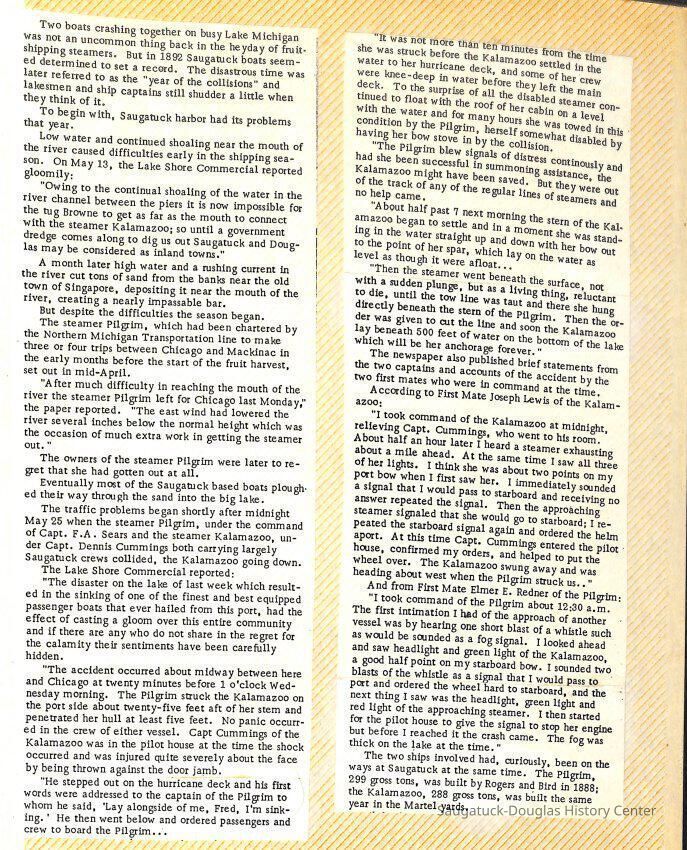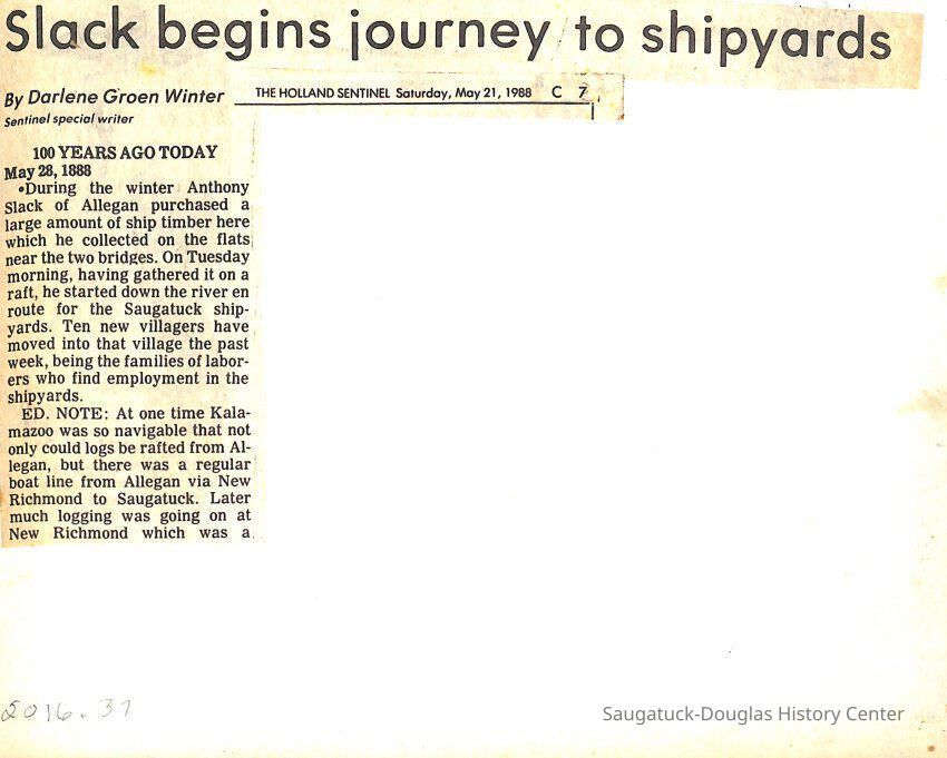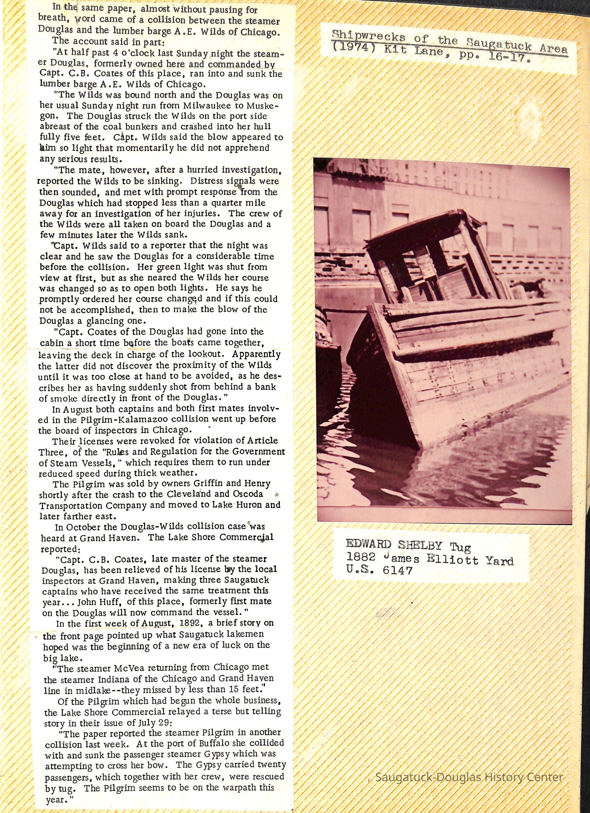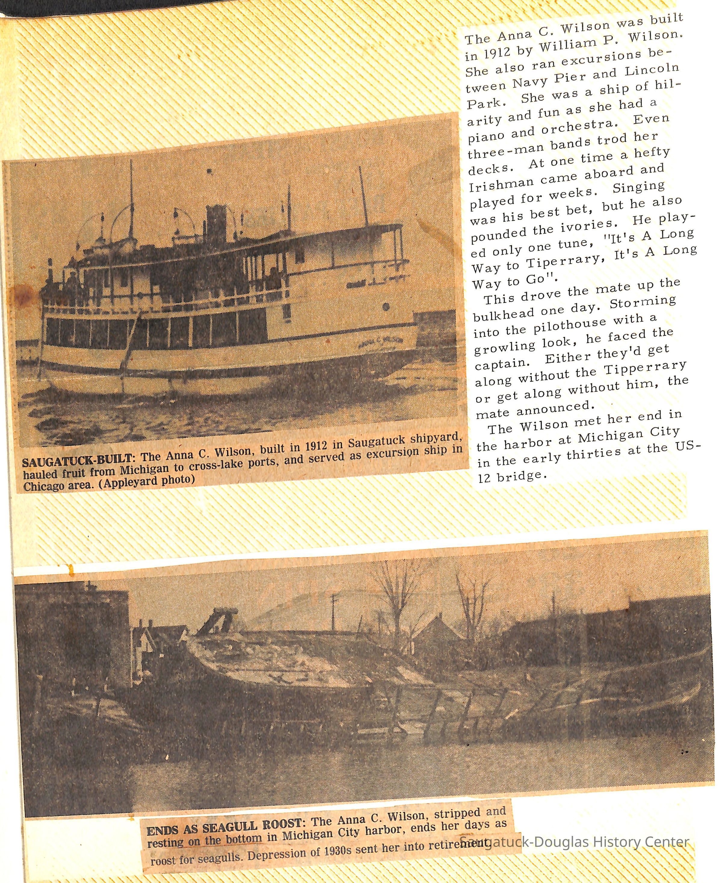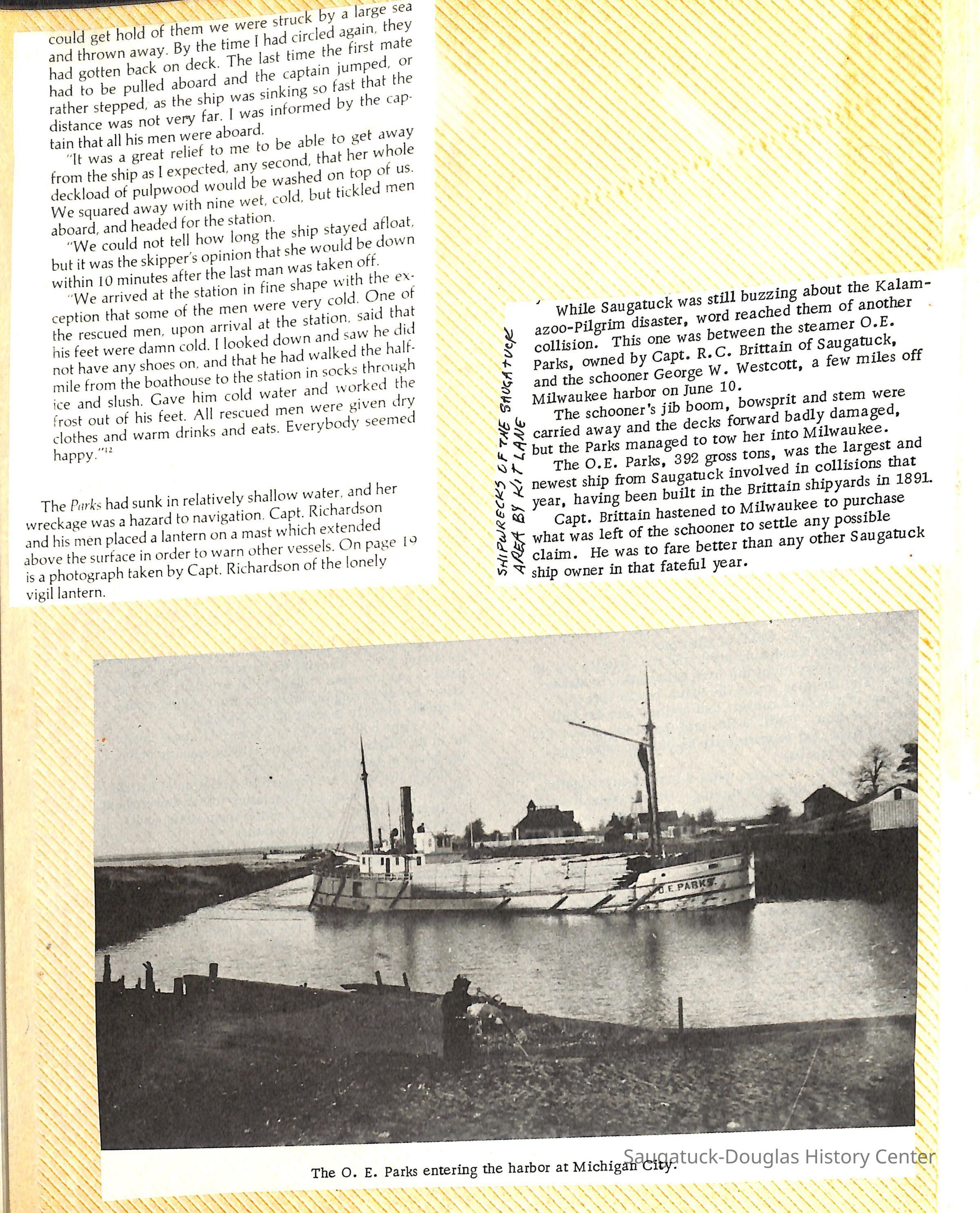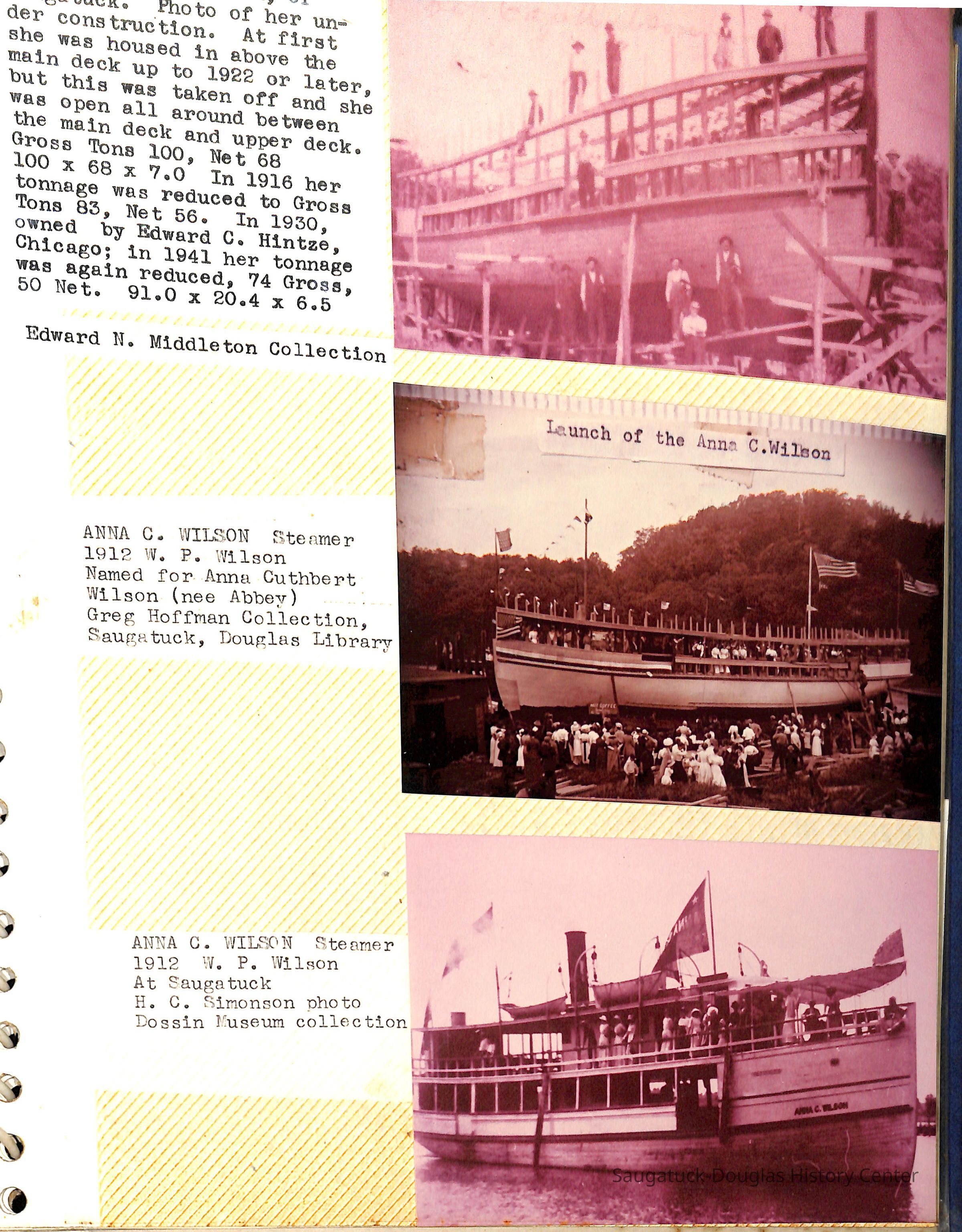 O.R. Johnson (ship), William B. Minter (ship) 1868-1901, F.B. Stockbridge (ship) 1873-1908, H.D. Moore (ship), George M. Case (ship), Saugatuck (tug) 1875-1930, J.S. Seaverns (ship) 1800, H.A. Root (ship) 1800, Douglas (ship) 1882, Mentor (ship) 1882, Macatawa (ship) 1882, A.C. Colborn (ship) 1882-1922, Charles West (ship) 1885 / Wau-Kon 1897 -1919, J.W. Parmelee (ship) 1883-1937, A.B. Taylor (ship) 1884 / Ottawa 1902-1910, Pearl B. Campbell (ship) 1883-1895, Joseph C. Suit (ship), Bob Teed (ship) 1883, F.H. Stanwood (ship) 1884, Hancock (ship) 1890-1947, Kalamazoo (ship) 1888-1892, Saugatuck (ship) 1887, R.C. Brittain (ship), Brittain, Ralph Case 1842-1905, Rogers & Bird Shipyard/Line, Cora A. Sheldon (ship) 1883, Frank Woods (ship) 1888, Charles McVea (ship) 1888-1928, Pilgrim (ship) 1888, R.C. Reid (ship) 1889, Flora (boat) 1889, George Nelson (ship) 1886, Bon Voyage (ship) 1891, Bon Ami (ship) 1894 / Northshore 1920-1945, O.E. Parks (ship) 1891, Ruby (ship) 1891, Pup (boat) 1894-1915 (left Saugatuck in 1907), Mae Martel (ship), John A. Aliber (boat) 1897-c1927, City of Holland (ship) 1893, J.S. Crouse (ship) 1898, A.R. Heath (boat) 1900-c1915, Tuscarora (boat) 1906, Cuckoo (ship) 1907, Anna C. Wilson (ship) 1912-1943, G.P. Heath (ship) 1871-1887, Ira Chaffee (ship) 1867