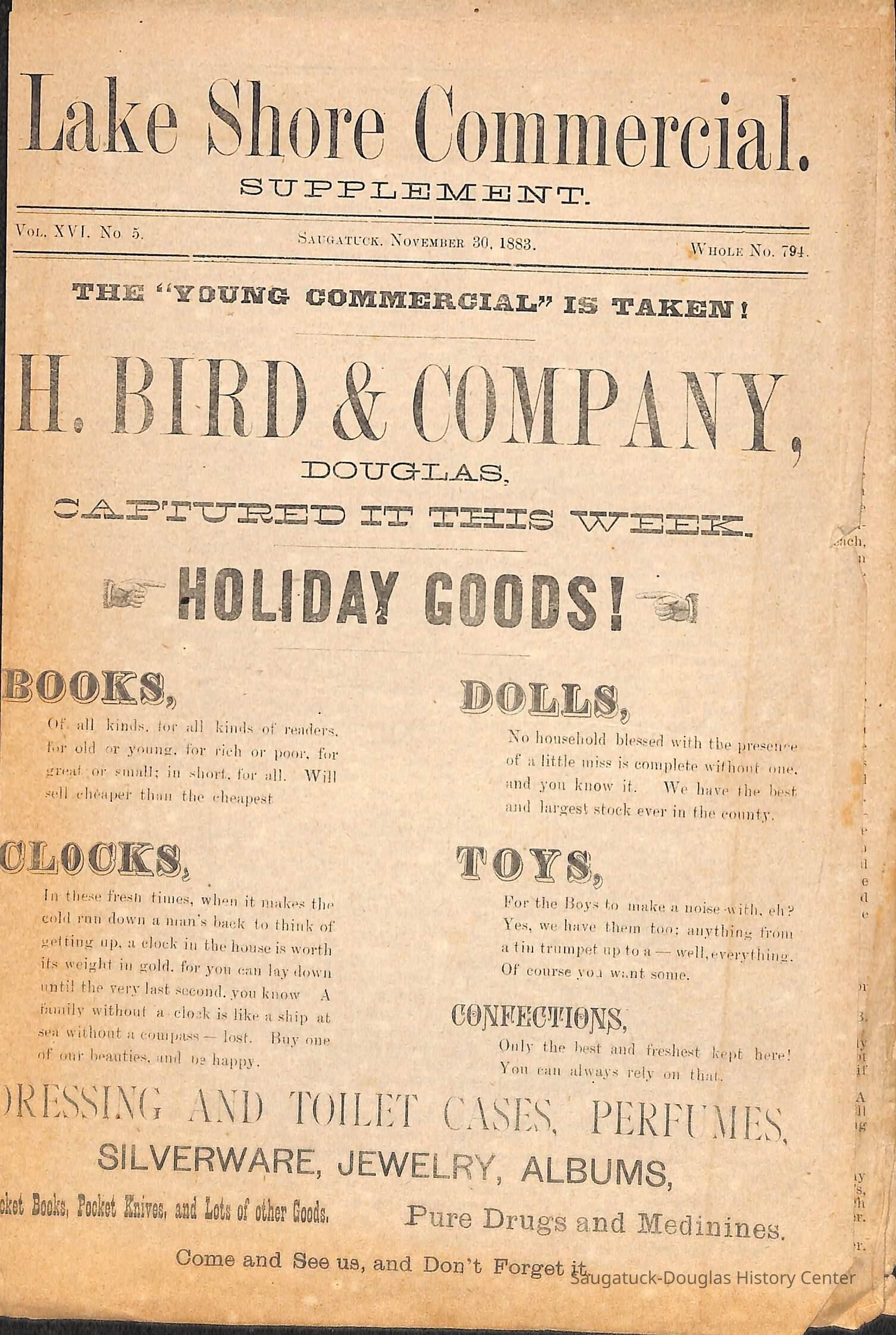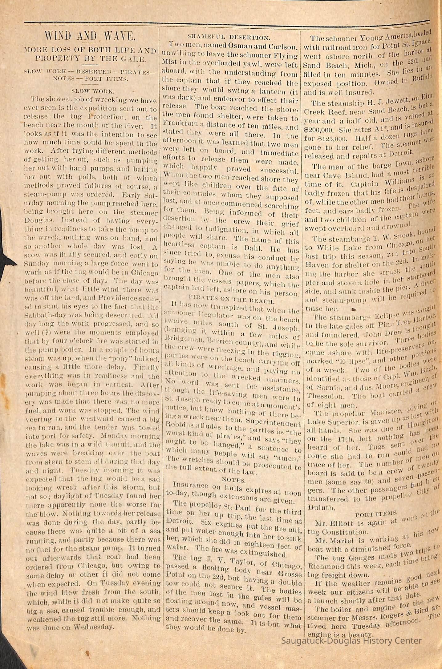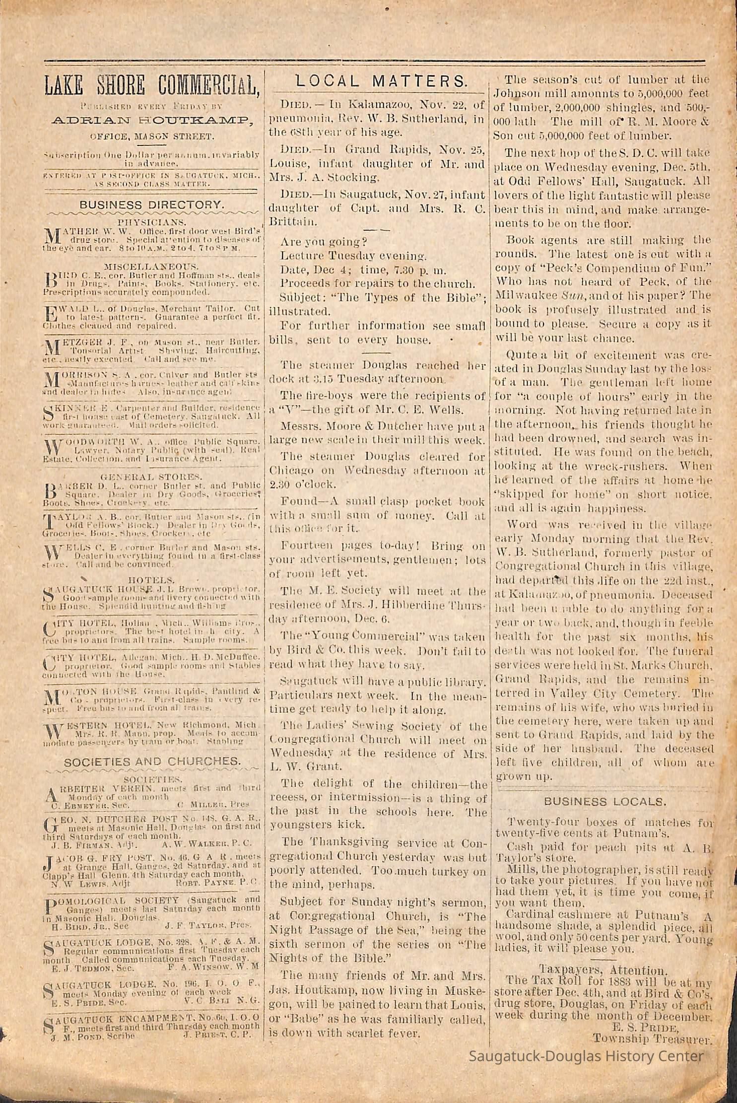 Typewritten transcriptions from the Lakeshore Commercial, which is known as the Commercial Record today. The documents contain transcriptions of excerpts from the Lakeshore Commercial from the years 1868-1897. Each excerpt is seperated by month and year which is usually noted at the top of the page. The transcriptions vary in length, but are never longer than a few sentences. There are no long articles, which may indicate that these are simply titles from articles or possibly ads from the paper. Some of the transcriptions contain information on people in the town or specific events. While the majority of the documents are typewritten transcriptions, there is one original document. It is a supplement to the November 30th 1883 Lakeshore Commercial edition. This supplement is the only original document. These notes began when the paper was still the Saugatuck Commercial and continued into its name change to the Lakeshore Commercial. They are arranged chronologically by year.
