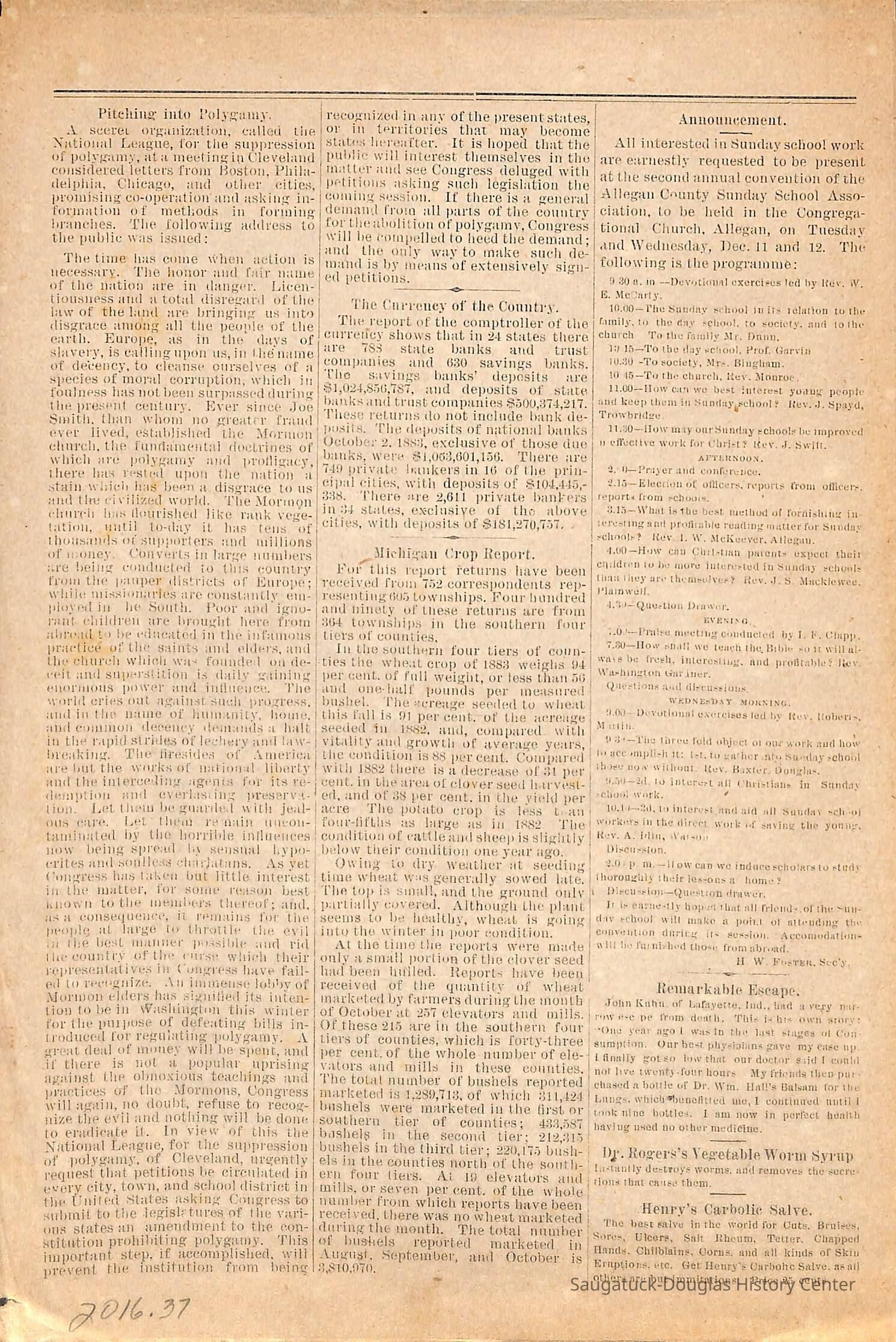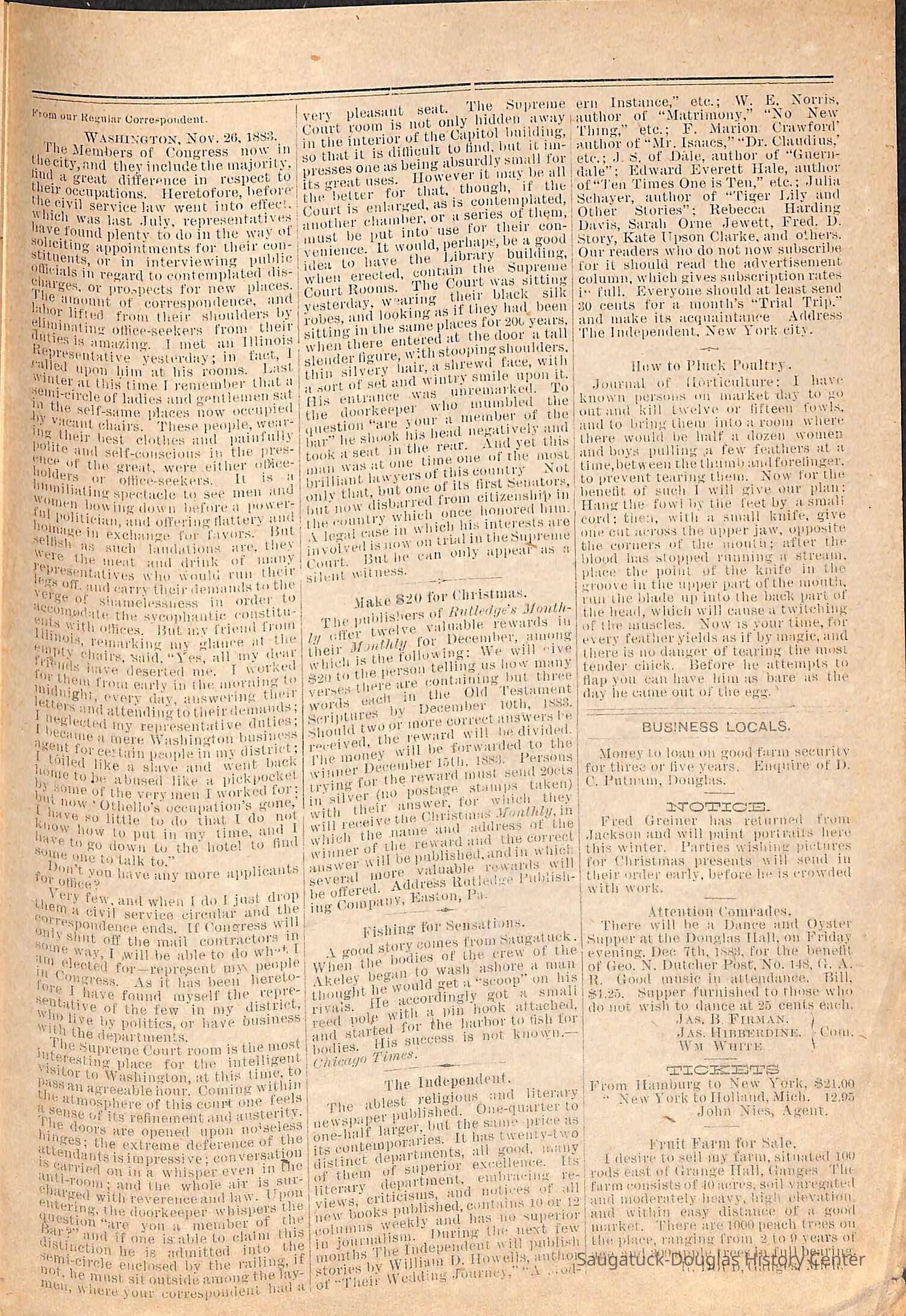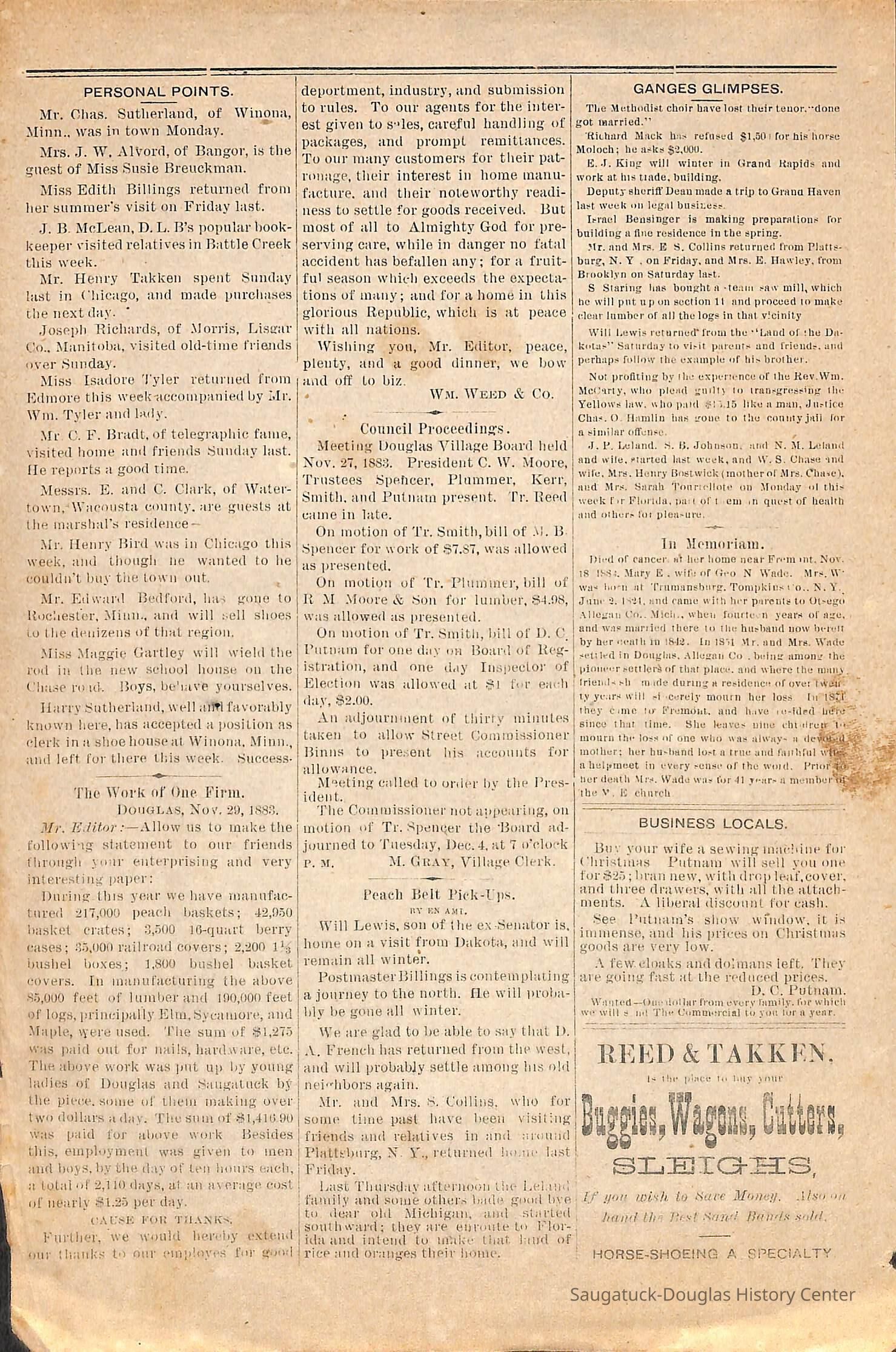 Typewritten transcriptions from the Lakeshore Commercial, which is known as the Commercial Record today. The documents contain transcriptions of excerpts from the Lakeshore Commercial from the years 1868-1897. Each excerpt is seperated by month and year which is usually noted at the top of the page. The transcriptions vary in length, but are never longer than a few sentences. There are no long articles, which may indicate that these are simply titles from articles or possibly ads from the paper. Some of the transcriptions contain information on people in the town or specific events. While the majority of the documents are typewritten transcriptions, there is one original document. It is a supplement to the November 30th 1883 Lakeshore Commercial edition. This supplement is the only original document. These notes began when the paper was still the Saugatuck Commercial and continued into its name change to the Lakeshore Commercial. They are arranged chronologically by year.