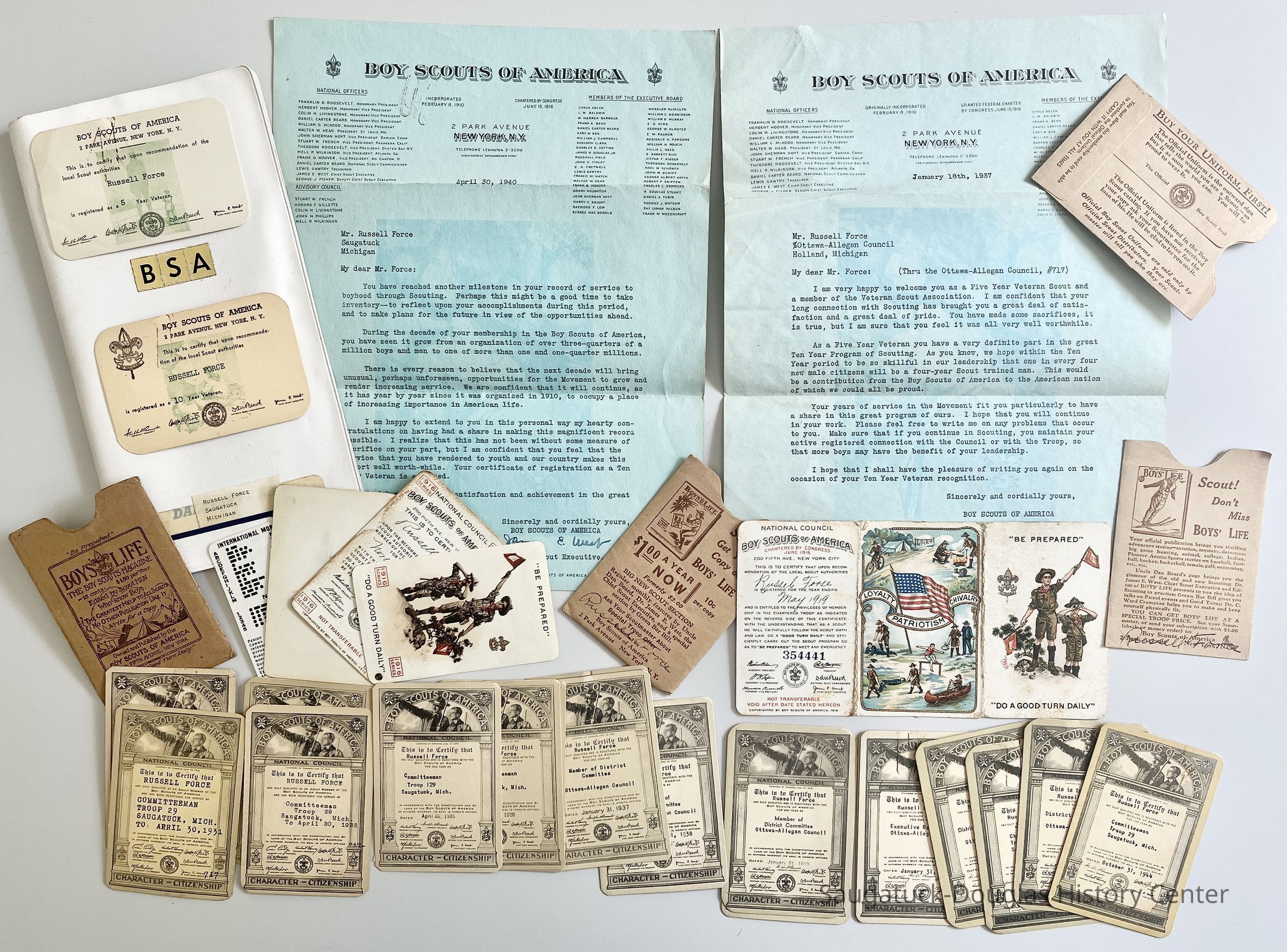 Items accumulated by Russel Force from 1916 to 1944 including membership cards, committeeman cards, 5- and 10-year veteran cards, two letters (1937 and 1940) and a white, plastic document folder.
