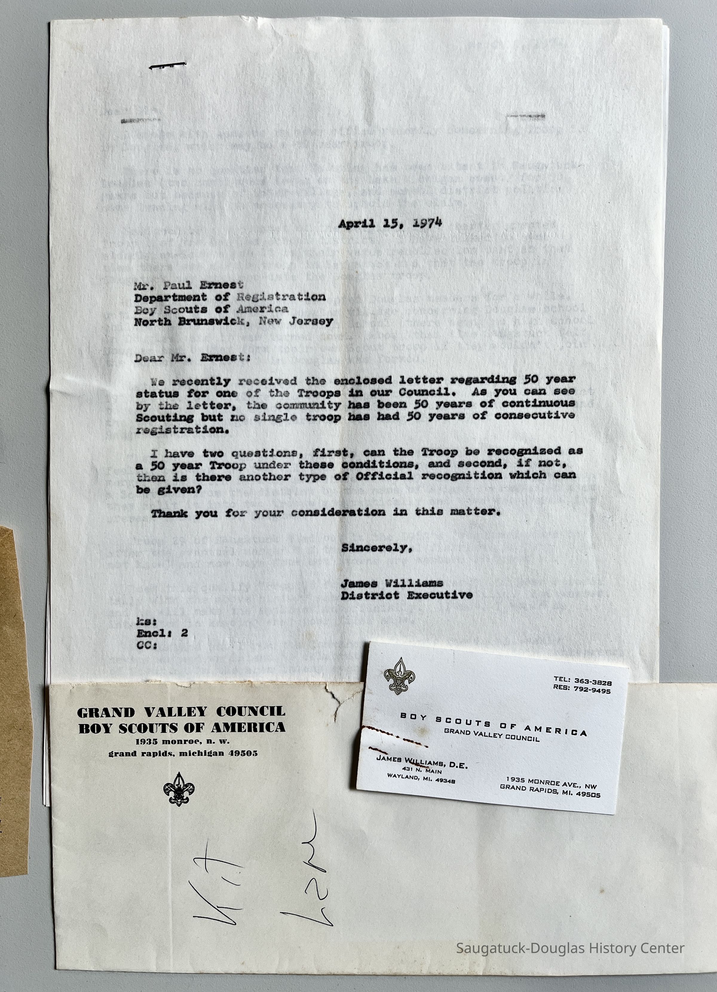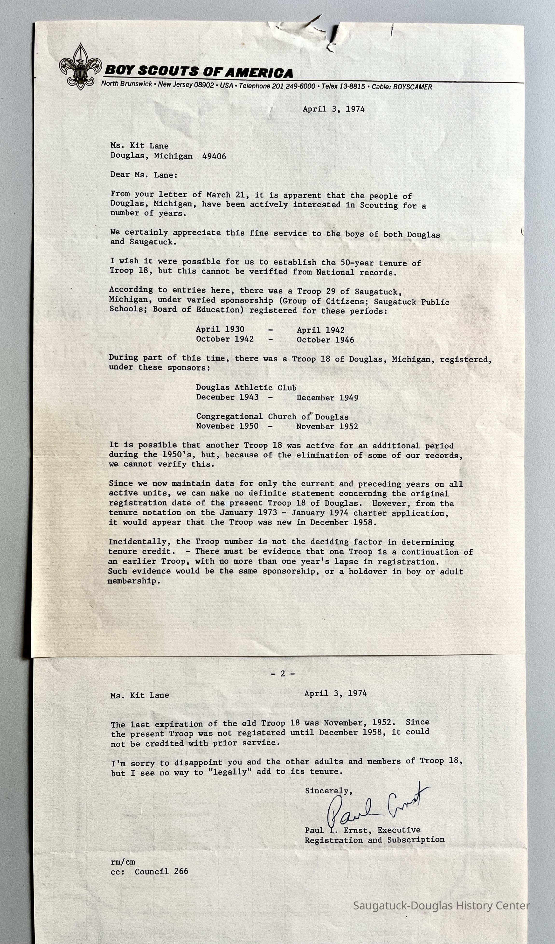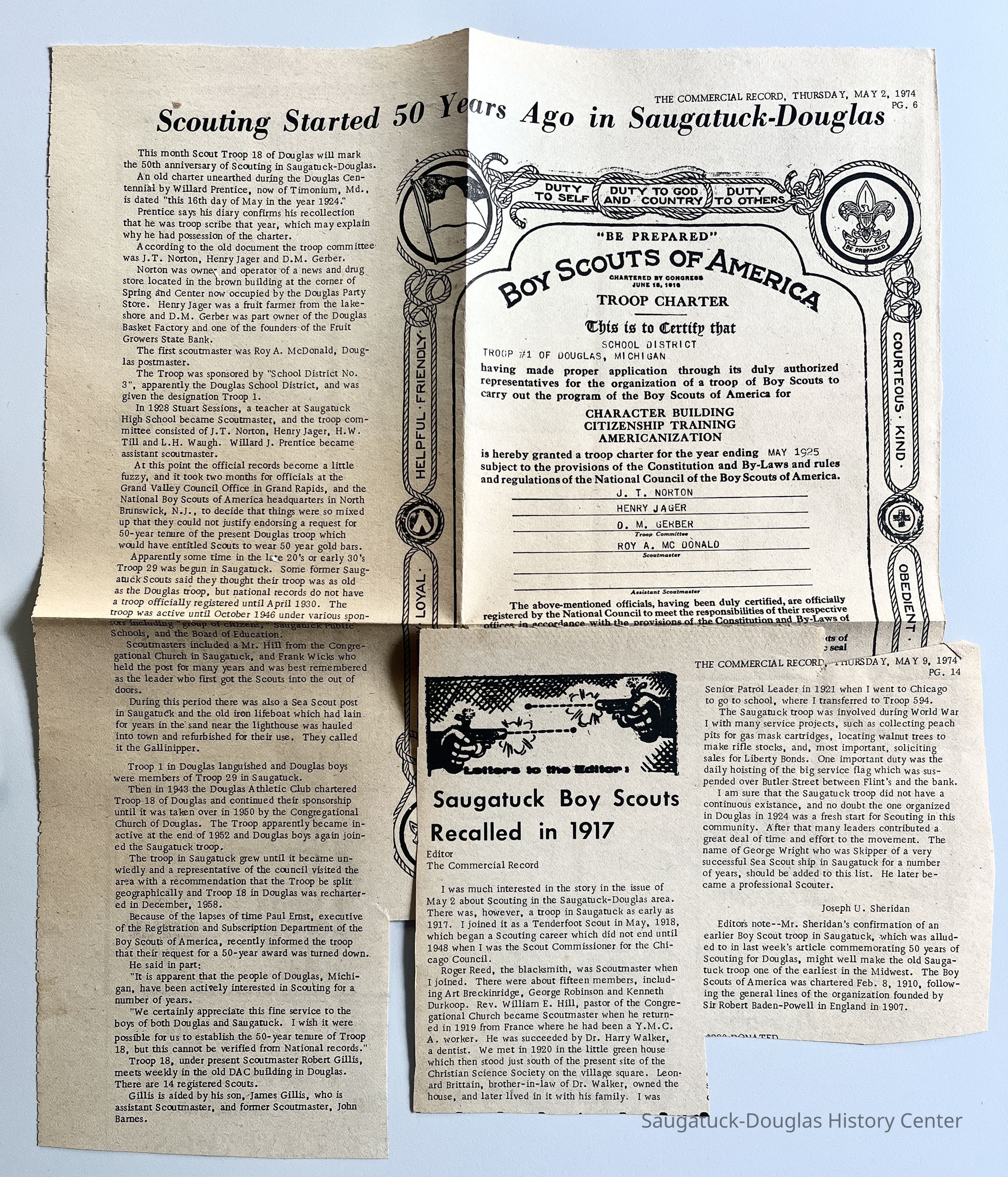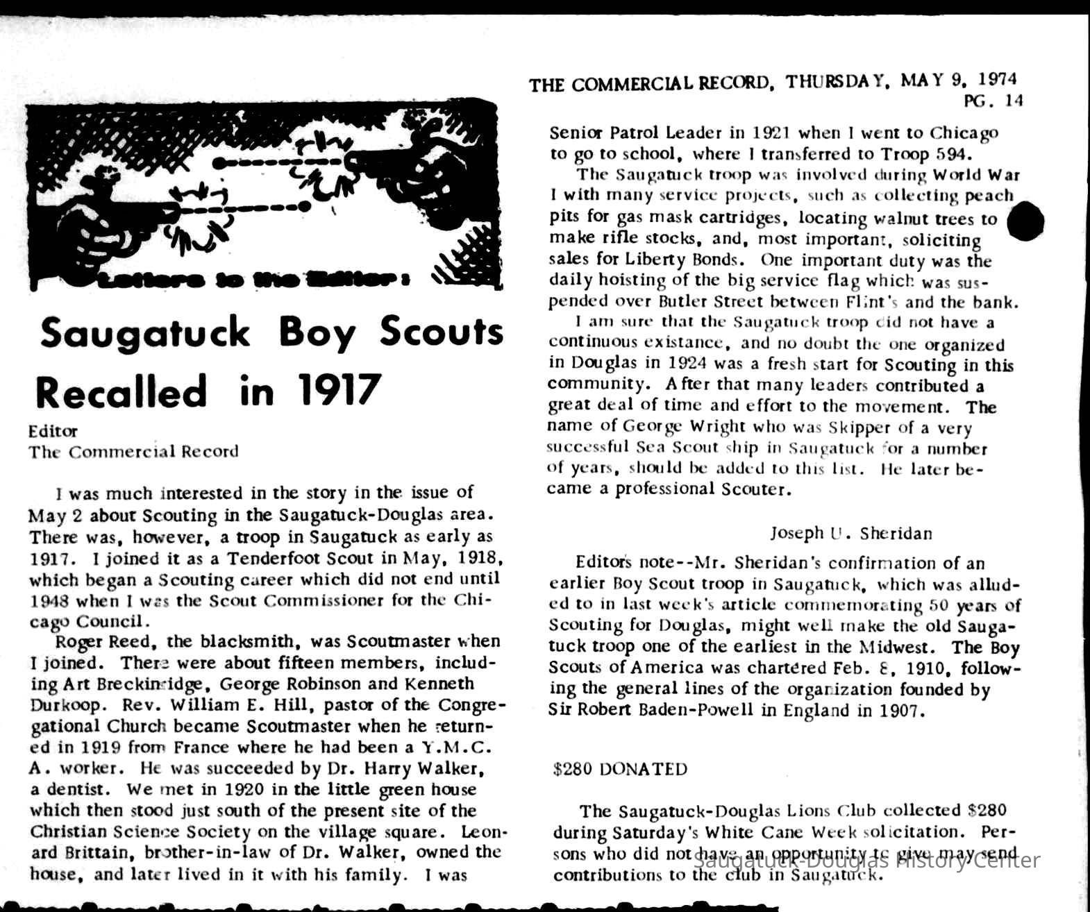 Commercial Record newspaper clippings from May 2, 1974 about the history of the Boy Scouts in Douglas and Saugatuck plus a letter to the editor in reply by Joseph U. Sheridan in the following May 9 issue.Context