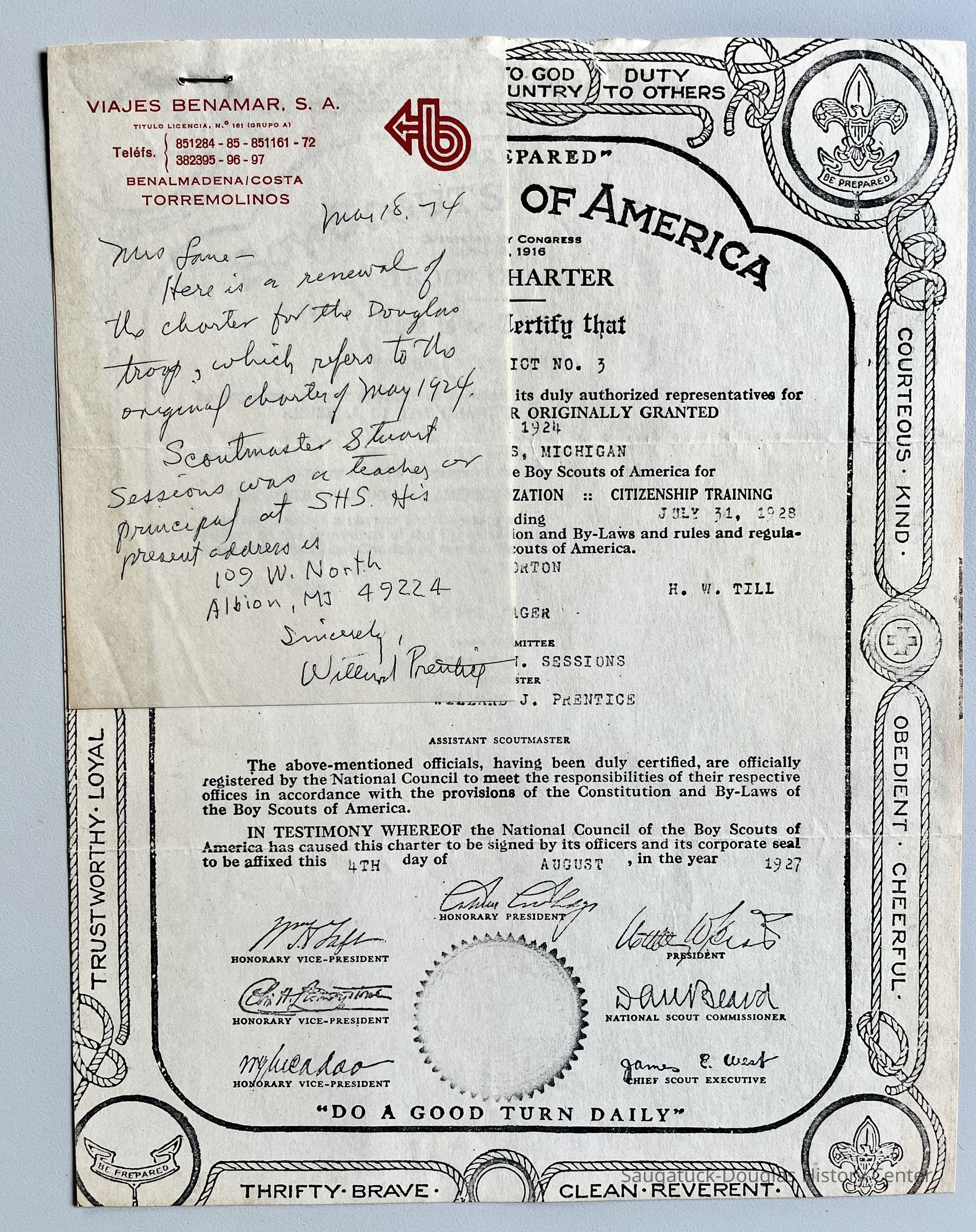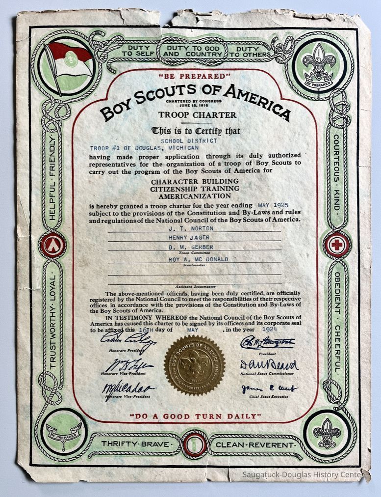 Boy Scouts of America Troop #1 of Douglas, Michigan Charter, May 1925