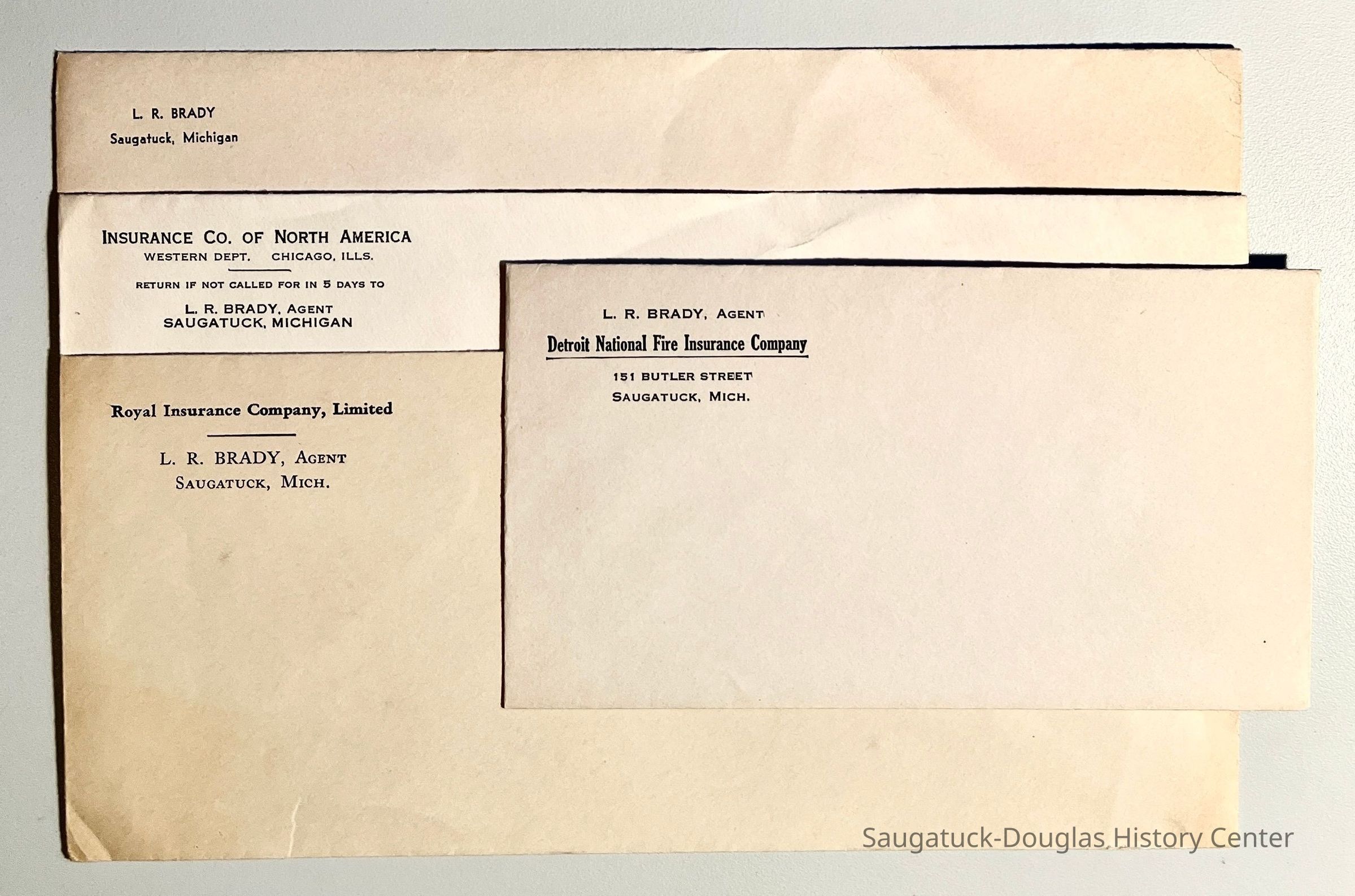 Four L.B. Brady business envelopes for his agency, co-branded for the Insurance Co. of North America, the Royal Insurance Company, Limited and the Detroit National Fire Insurance Company with the address 151 Butler Street. These items were originally given the accession number 95-90-6abc.Context