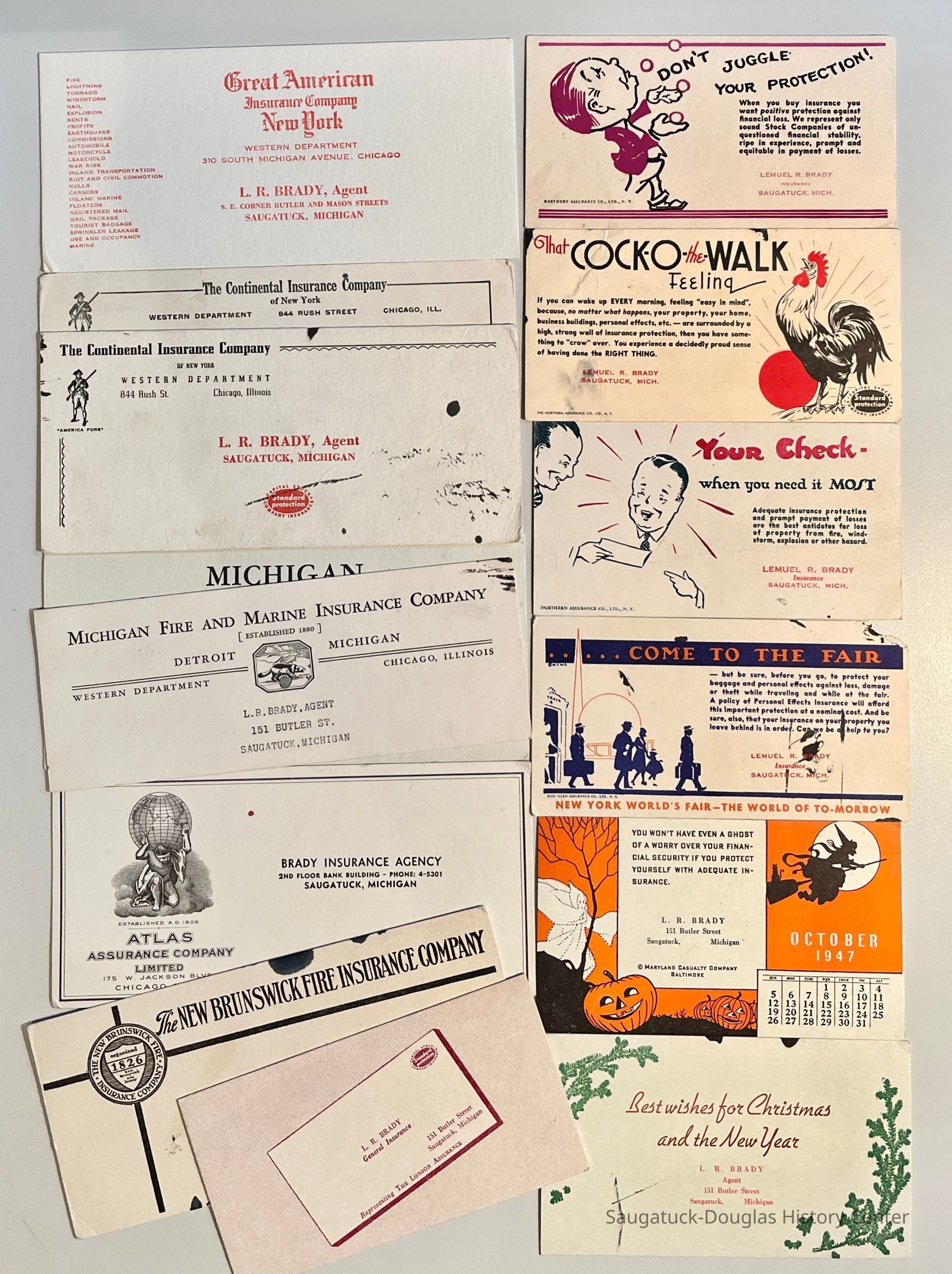 Fourteen advertising ink blotters from the Brady Insurance agency.