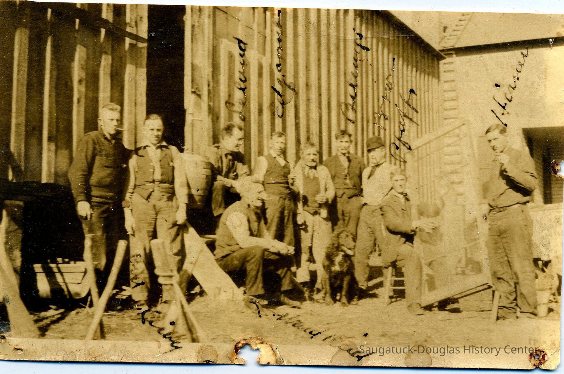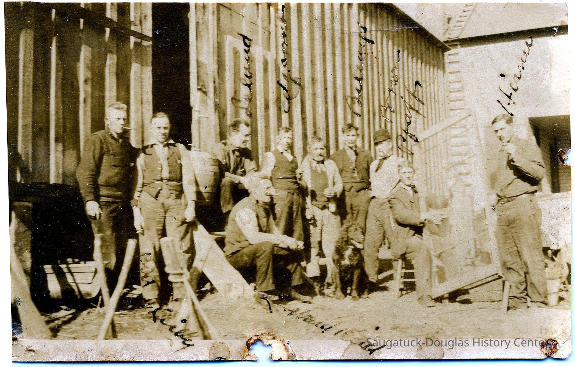 A gathering of work men outside a mill building. Note the ladder to the roof. One man appears to be playing a screen door like a harp.
