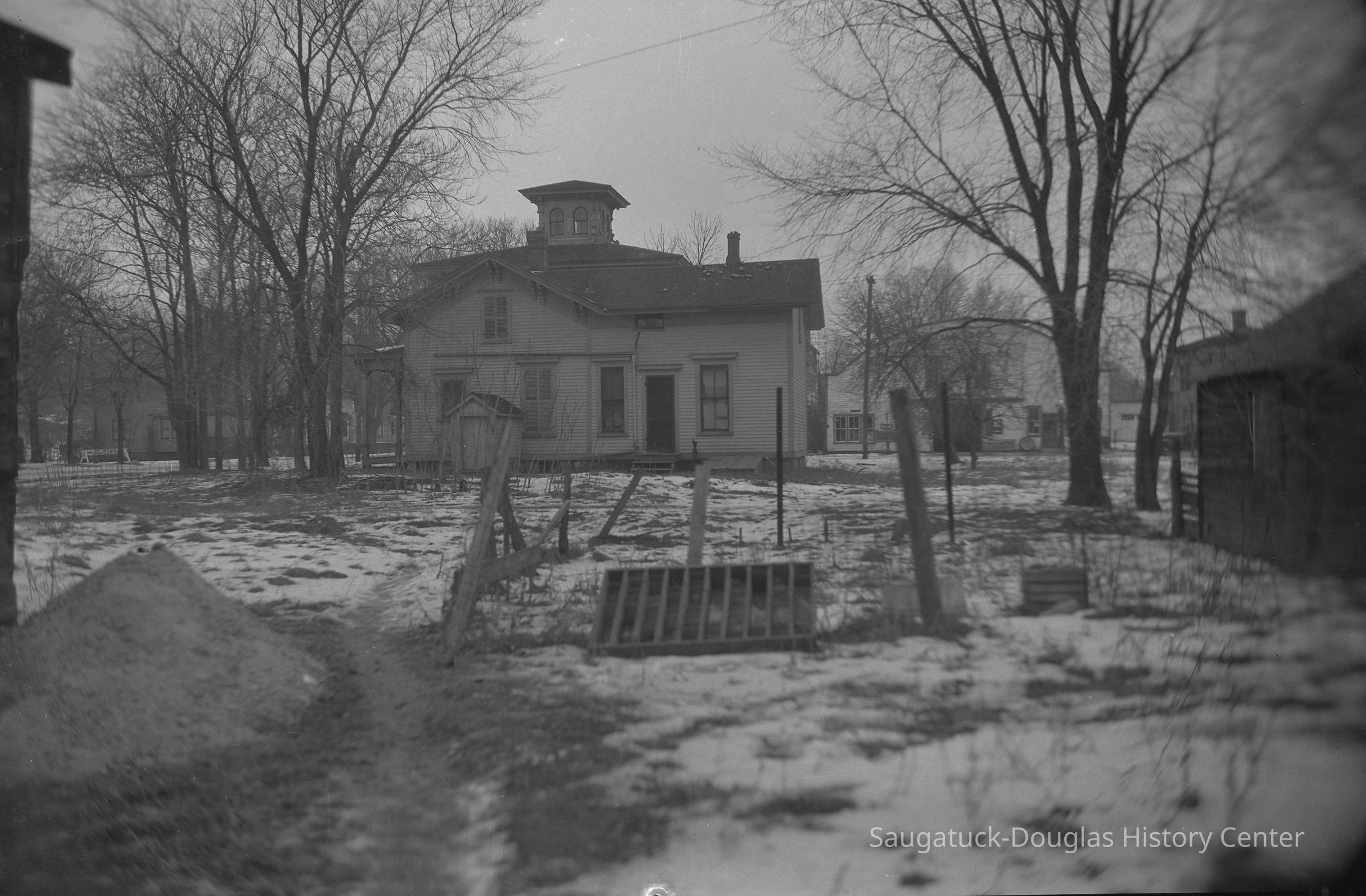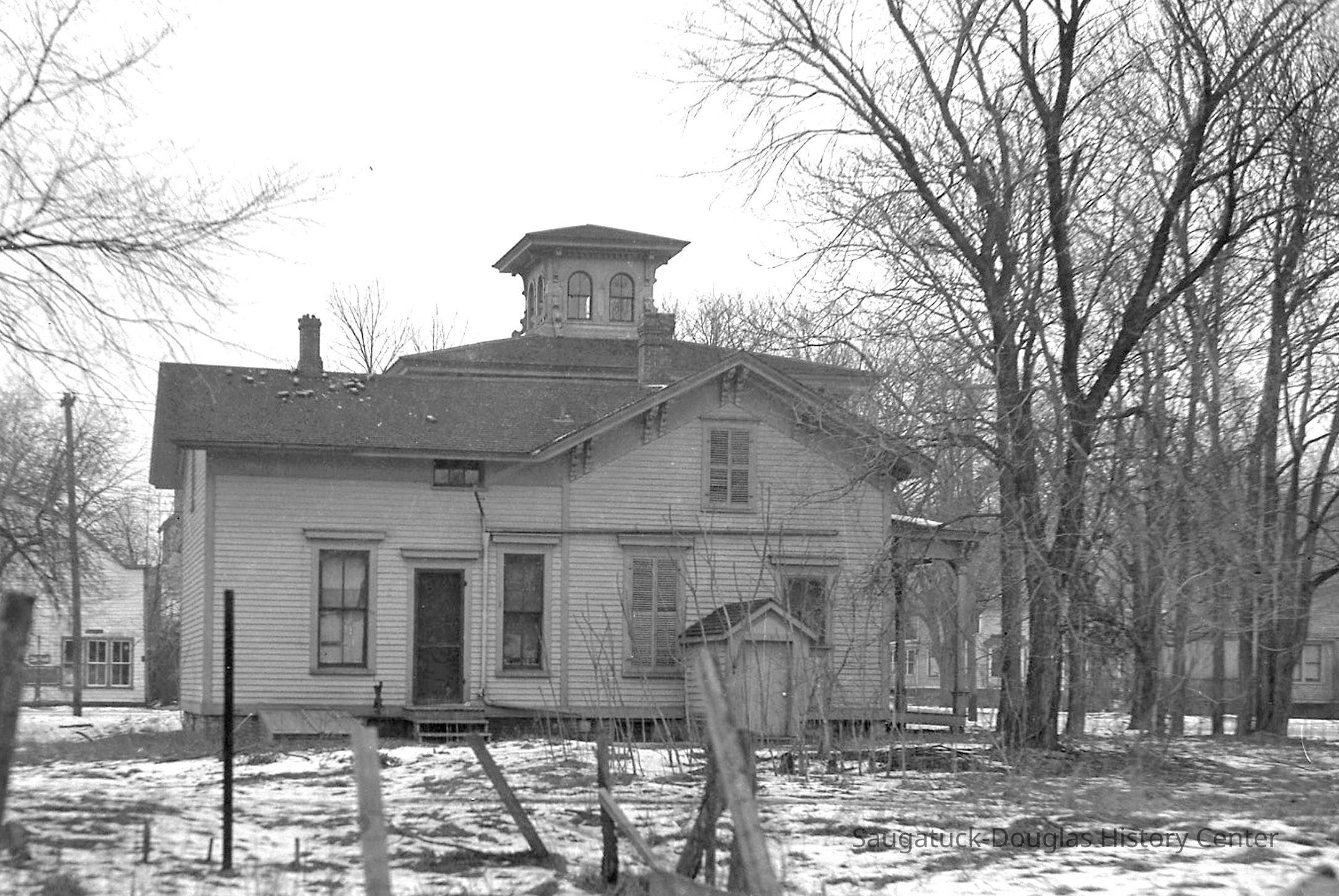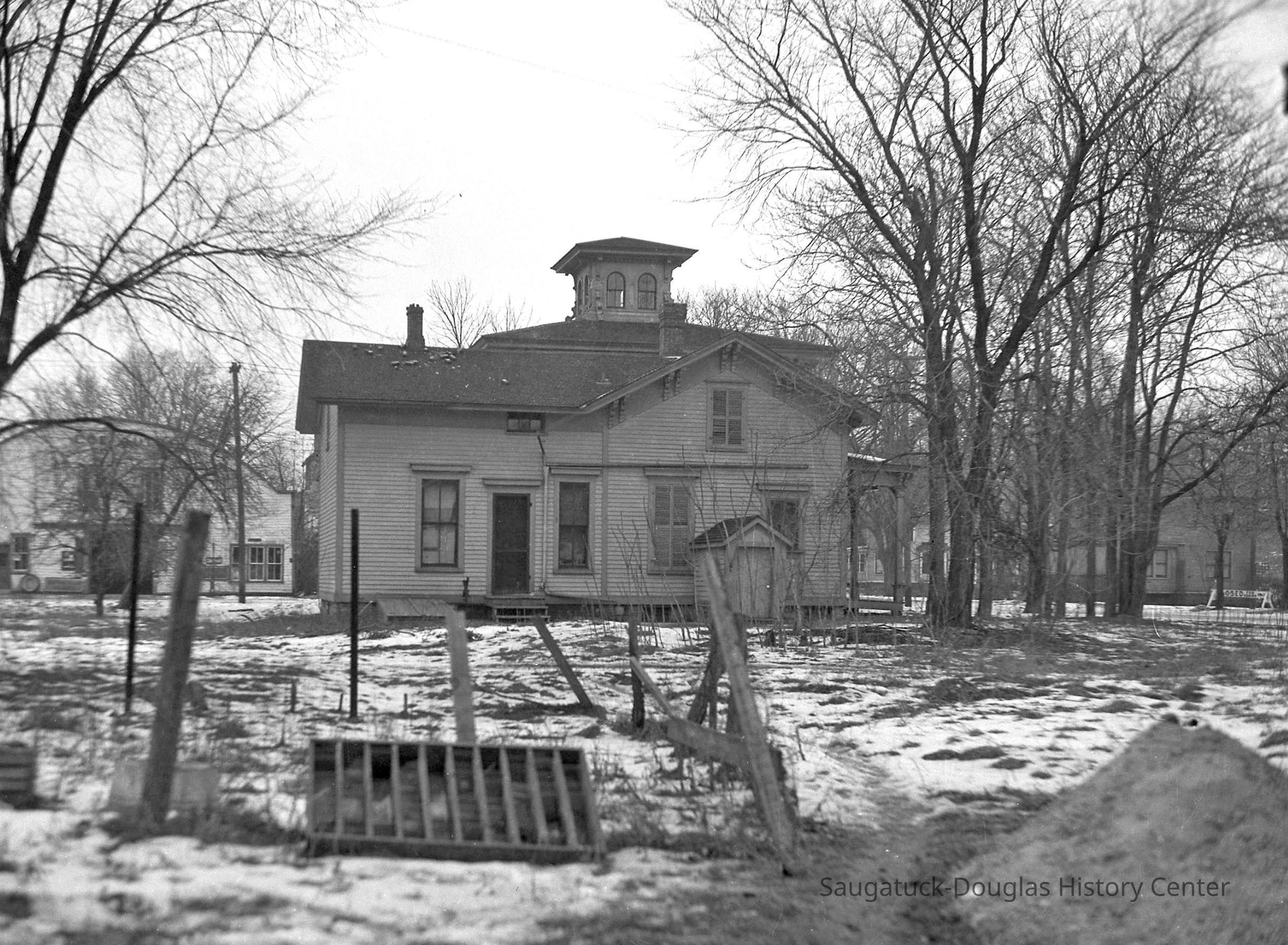 Ornate clapboard home with cupola that once stood on the SW corner of Mason and Griffith Streets. The bare yard is patchy with snow. Behind the house, a building with a curved roof, possibly the back of the Ford dealership building on Culver Street, is visible.