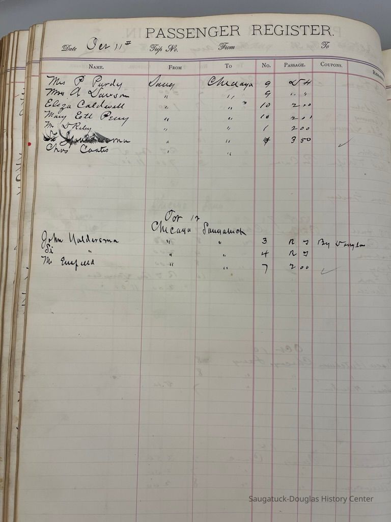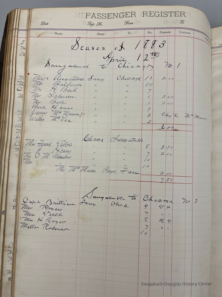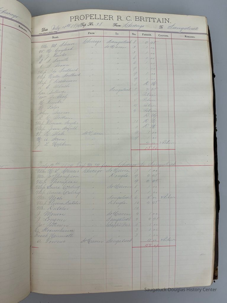 The locally-built R.C. Brittain was a steam barge that usually traveled between Saugatuck and Chicago. She likely carried cargo as well as people.Collection