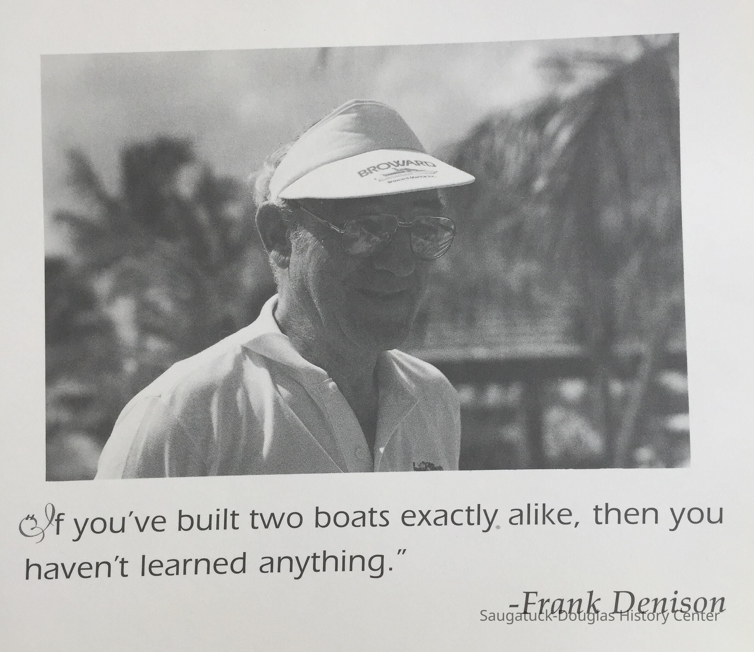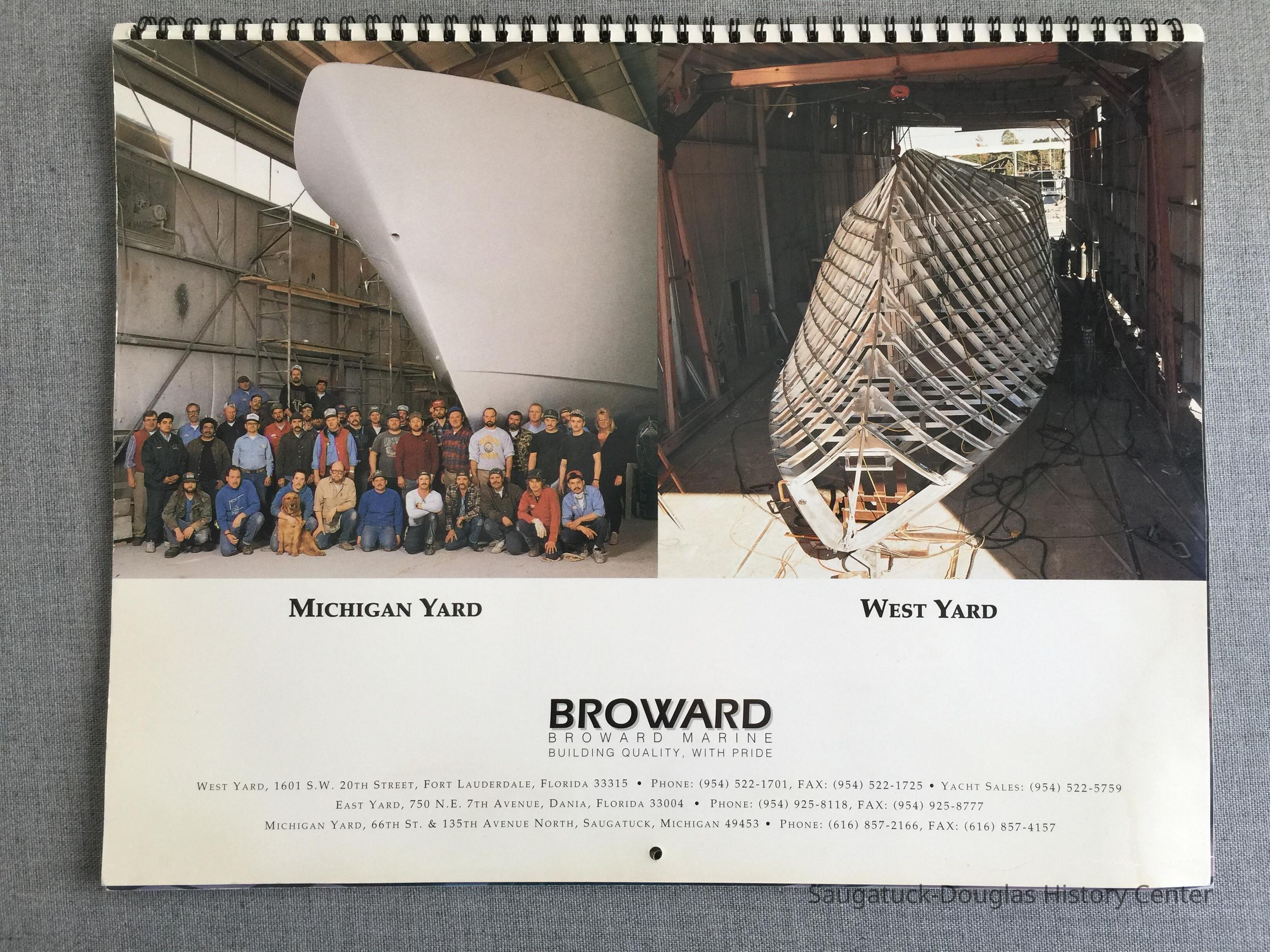 "Seeing is Believing" 1998 Broward Marine Shipyards calendar with 12 large color photos of luxury yachts, a listing of all hulls built in Florida (from 1974-1997) and Michigan (1982-1998) plus a photo and quote by Frank Denison. The Michigan yard was located at 66th x 135th Avenue North, Saugatuck, MI 49453.Context