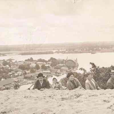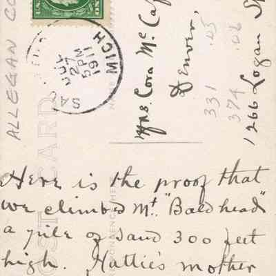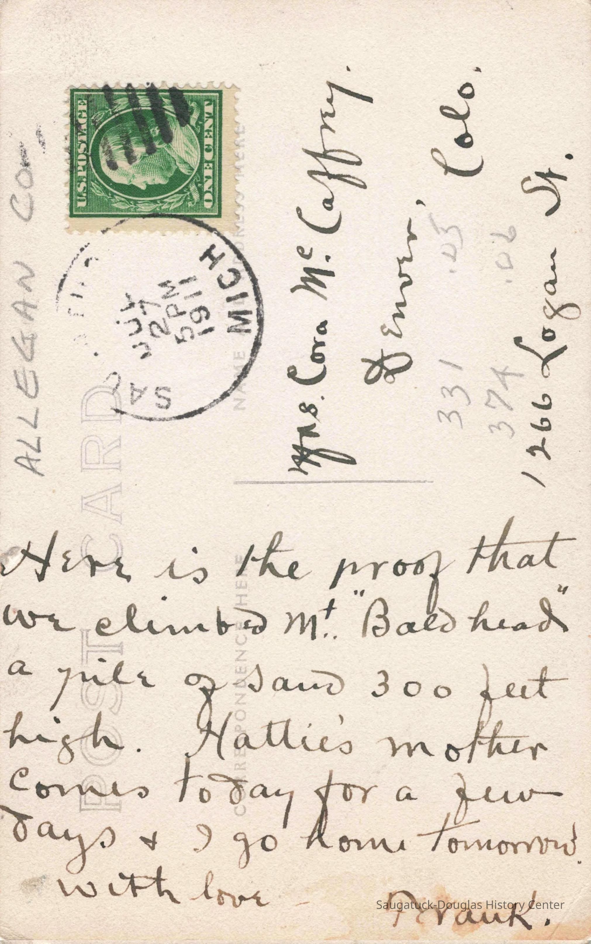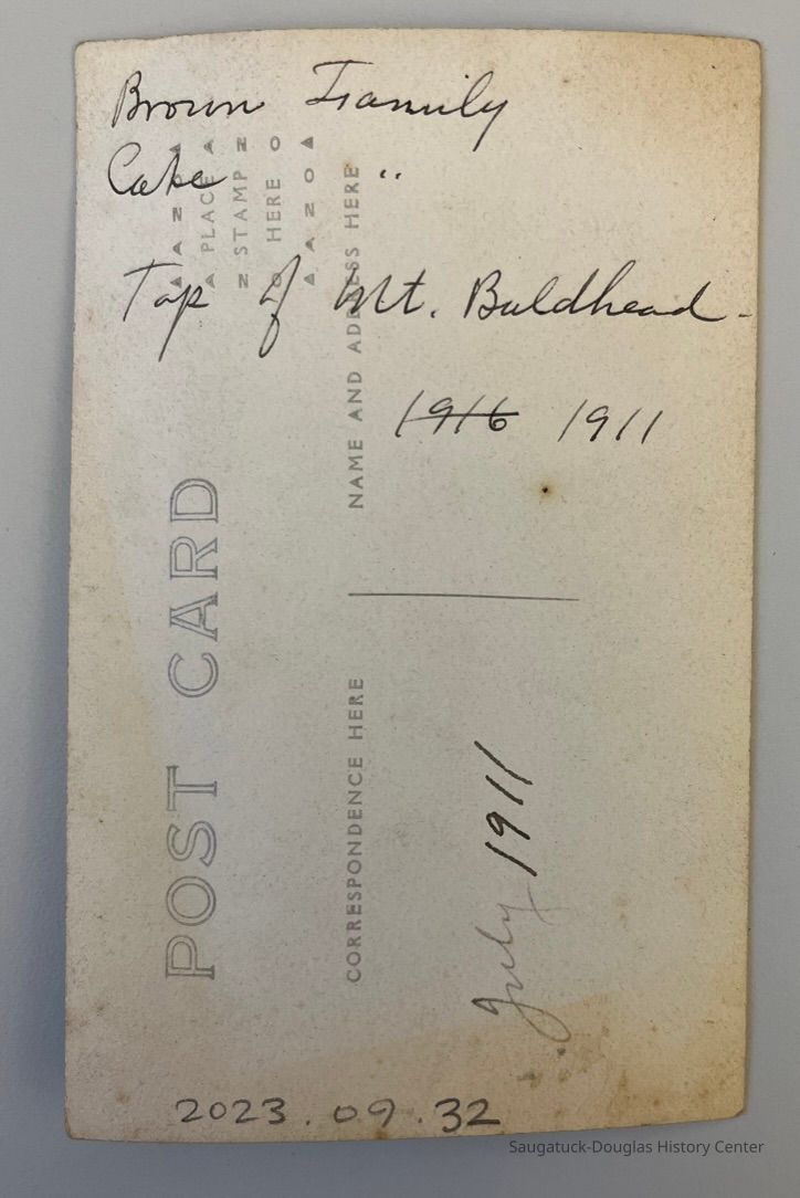 Real photo postcard of unidentified group of people on top of Mt. Baldhead. Photo is taken facing east, with Lake Kalamaoo and the Big Pavilion in the background.Photograph Details