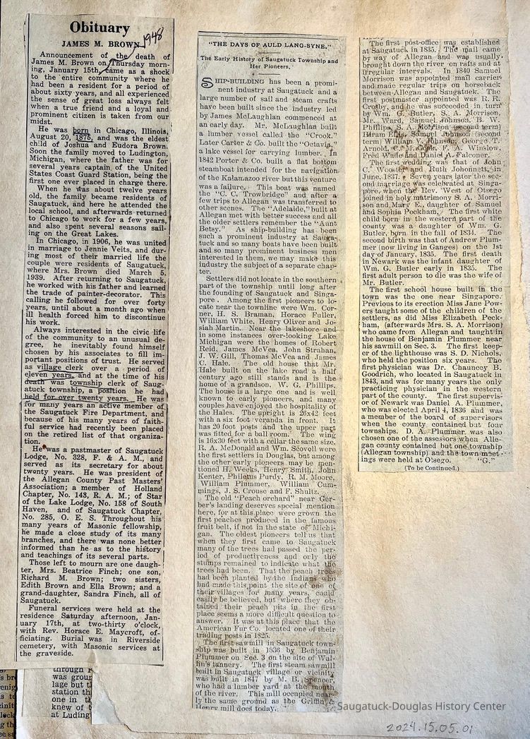 01 front - Obituary of James M. Brown 1875-1948 and "The Days of Auld Lang-syne, The early history of Saugatuck Township and her pioneers."
