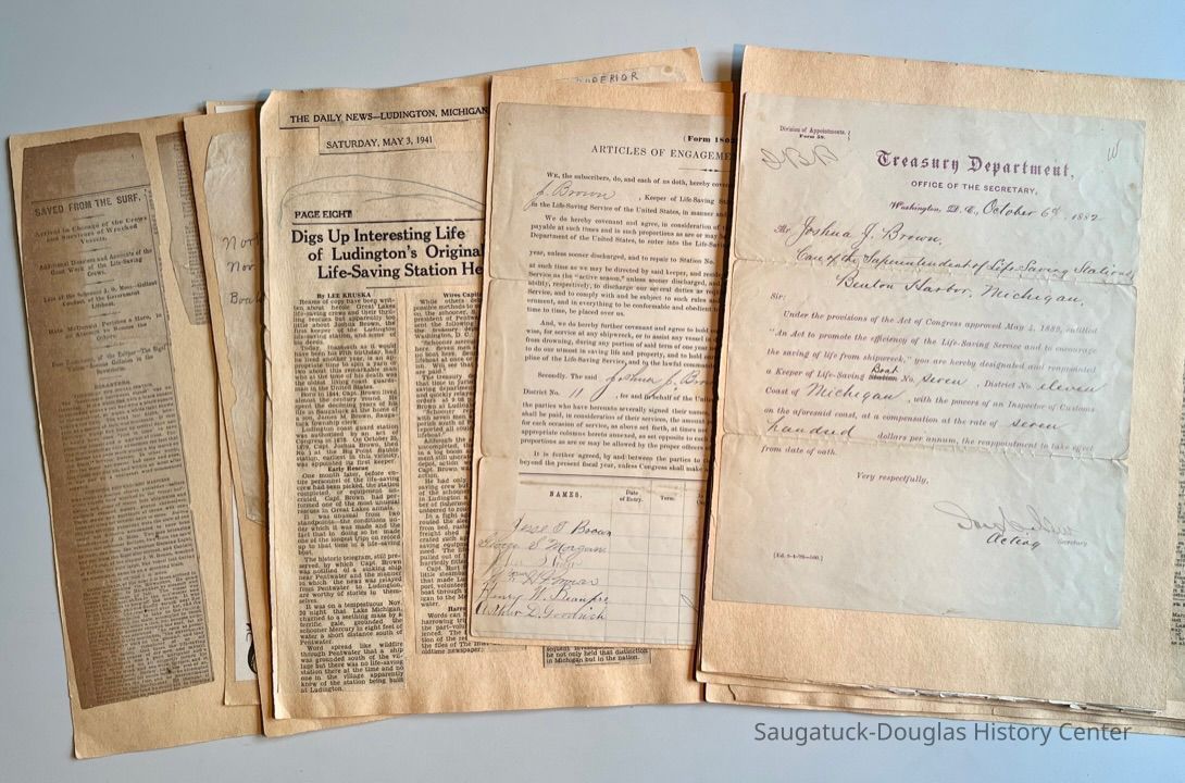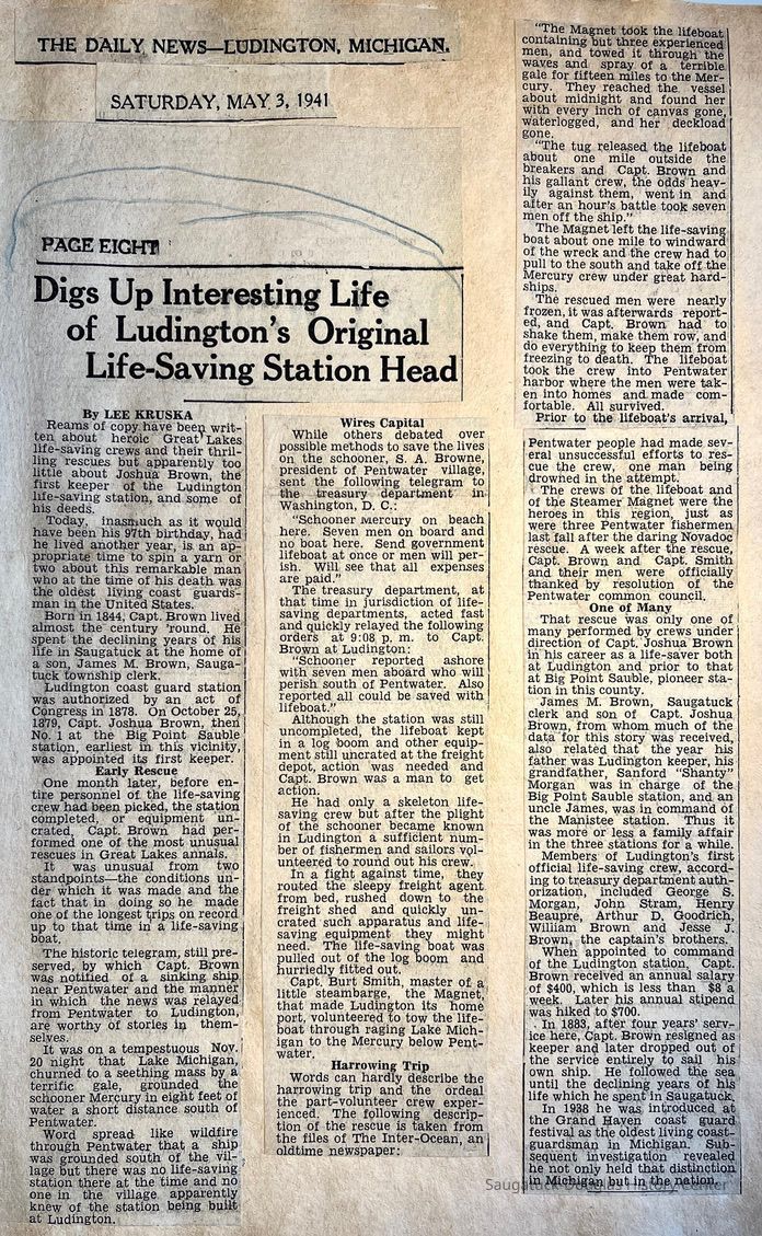 02 front - Newspaper clipping: "Digs Up Interesting Life of Ludington's Original Life-Station Head", The Daily News, Ludington, Michigan, 3 May 1941 - story about Captain Joshua Brown's service and the 1879 saving of the schooner Mercury that was grounded near Pentwater with the help of Captain Burt Smith of the steambarge Magnet.
