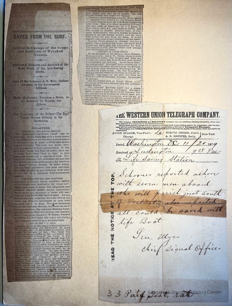 06 back - Newspaper clipping: "Saved from the Surf" no date, mentions Schooner J.O. Moss and gallant conduct of the government lifeboat; Western Union Telegraph from Washington, D.C., Nov. 20, 1879, to Ludington life-saving station "Schooner reported ashore with seven men aboard who will perish just south of Pentwater also spotted all could be saved with life boat. [?] Chief signal officer"