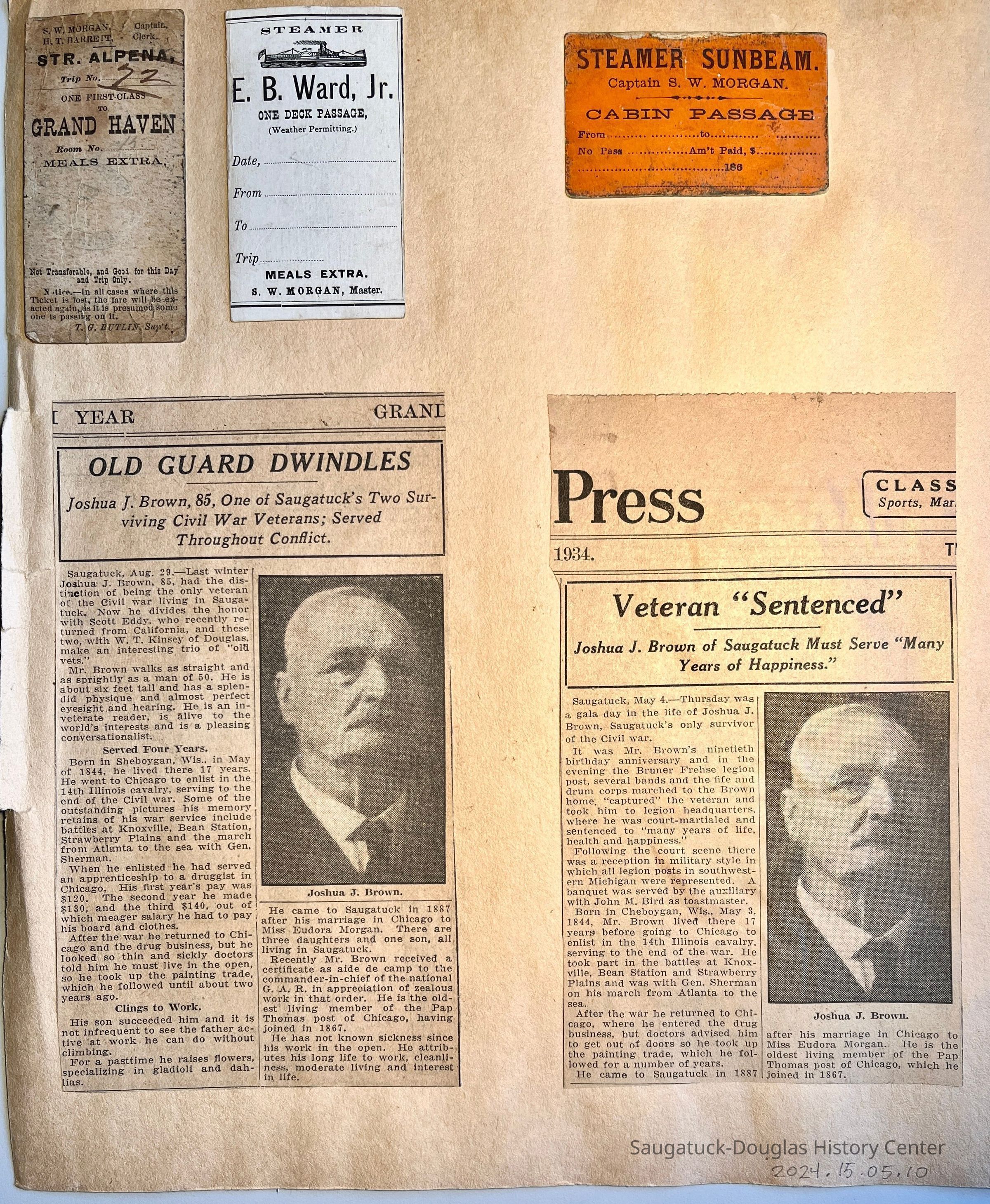 10 back - Two newspaper clippings about Joshua J. Brown, three tickets for passage on steamers Alpena, E.B. Ward, Jr. and Sunbeam, all captained or mastered by S.W. Morgan.