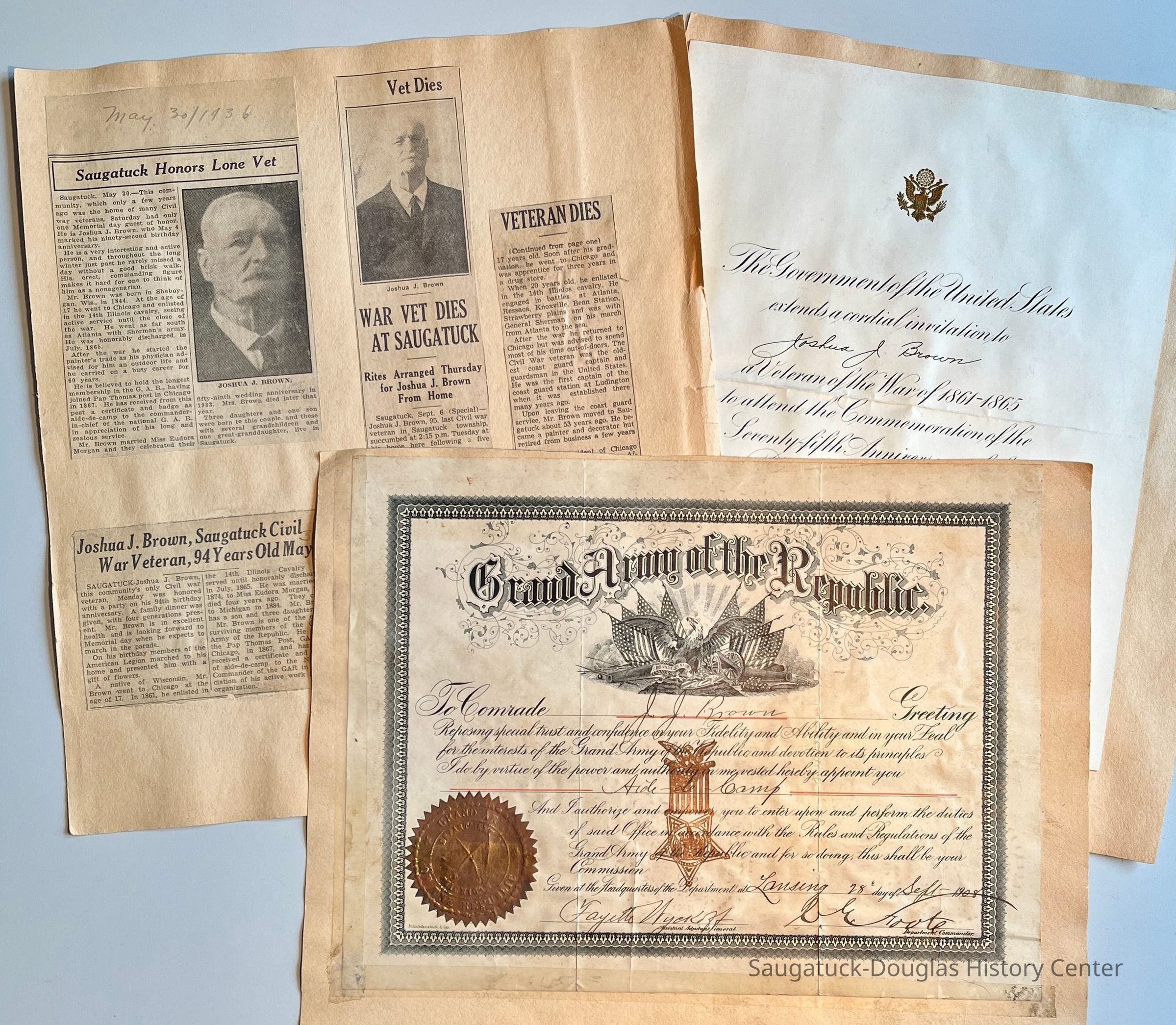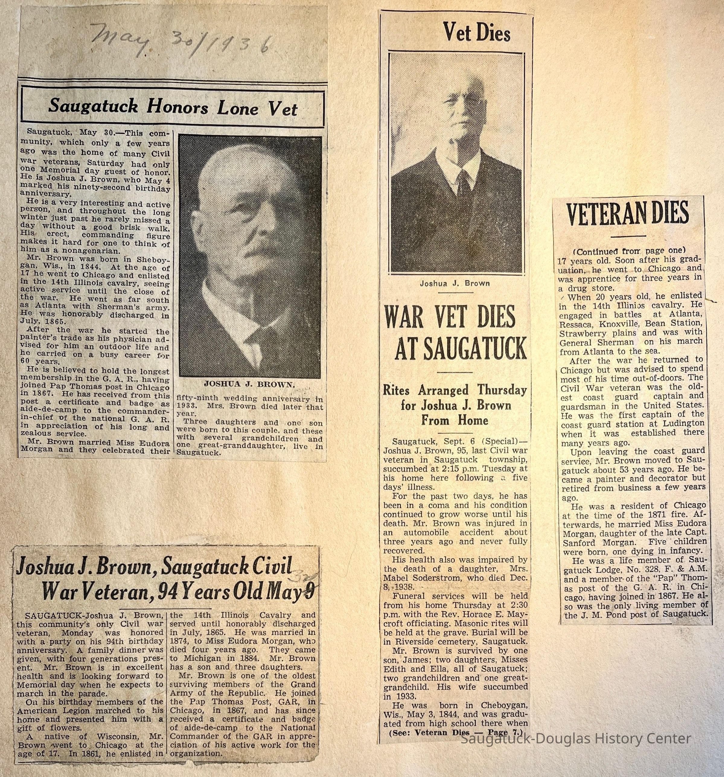 10 front - Three newspaper clippings about Joshua J. Brown, the community's last Civil War veteran, including obituary that mentions his life-saving service after the war.
