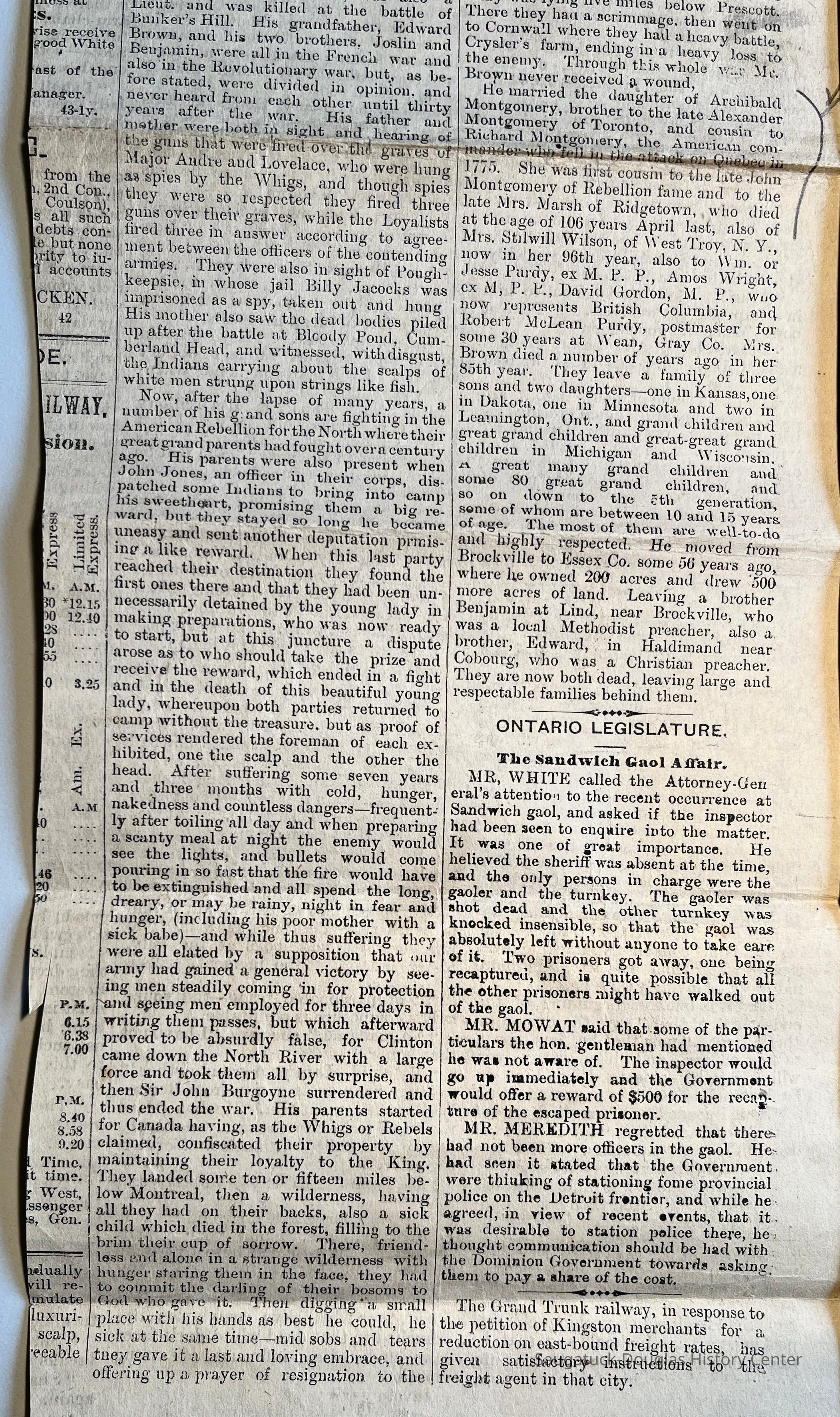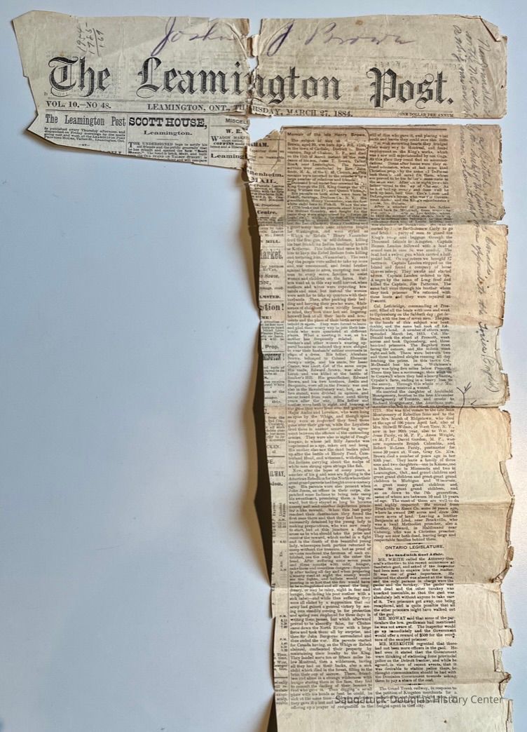 11 front - Newspaper clipping from the March 27, 1884 Leamington Post, Ontario, "Memoir of the late Henry Brown" who was born 1785 and died 11 March at residence of son Jesse T. Brown, near Leamington. The article describes the mayhem of the war of 1770 in Fiskill, Duchess County, New York and other conflicts as well as Henry Brown's ancestry. One photocopy of the clipping is pasted to the scrapbook pages, the other is loose.Collection