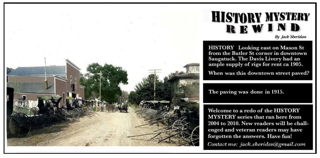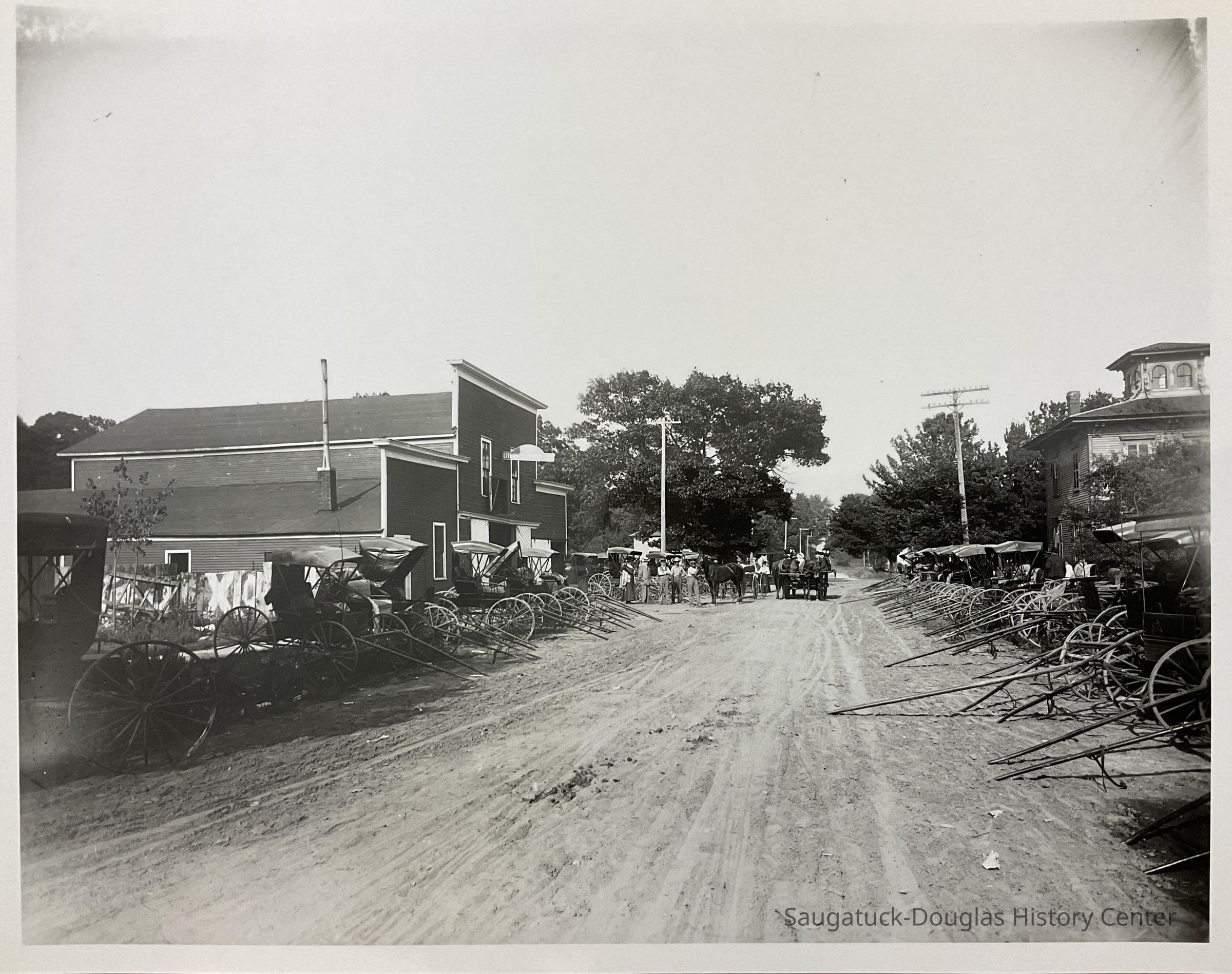 Mason Street looking east from Butler Street before the Methodist Church was moved down the hill... or when the street was paved in 1915 (according to Jack Sheridan). The cupola of the Brittain house is visible on the far right. The Davis livery on the left became the site of the Saugatuck Methodist Church.Photograph Details