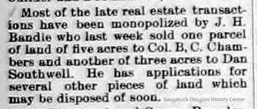 12-28-1894 Most of the late real estate transactions have been monopolized by J. H Bandle who last week sold one parcel of land of five acres to Col. B.C. Chambers and another of three acres to Dan Southwell. He has applications for several other pieces of land which may be disposed of soon.