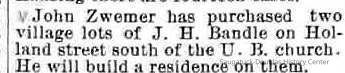 01-25-89 John Zwemer has purchased two village lots of J. H. Bandle on Holland street south of the U. B. church. he will build a residence on them