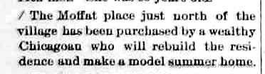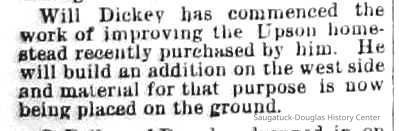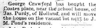 3-25-87 Geo Crawford has bought the Coates place, near the school house, of Jas Purdy, of Holland, and will move the house on the vacant lot next to J.M. Pond's residence.