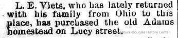 @-6-89 L. E. Viets, who has lately returned with his family from Ohio to this place, has purchased the old Adams homestead on Lucy Street .