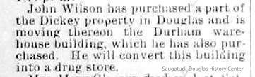 05-30-90 John Wilson has purchased a part of the Dickey property in Douglas and is moving thereon the Durham warehouse building, which he has also purchased. He will convert this building into a drug store.