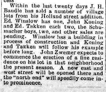 4-5-89 Within the last twenty days J. H. Bandle has sold a number of village lots from his Holland street addition. Ed Winslow has one, John Koning and Ed Takken, each two, and other sales are pending. Winslow has a building in process of construction and Koning and Takken will follow his example before long. John Zwemer expects to commence the erection of a fine residence on his lot in that neighborhood the present season. A new east and west street will be opened there and the "north end" will speedily come into prominence .