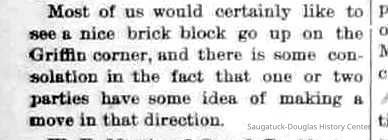 5-23-90 Mr D. Gerber, went to Ferrysburg yesterday and contracted for brick to build a two story building 48 x 60 feet in size, double store, which he will erect on the southeast corner of the Dickey lot in Douglas. One of the stores will be occupied by Corneil Gerber as a hardware store. The other will be rented .