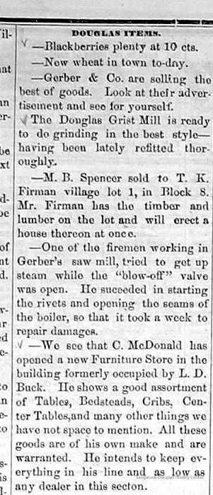 4-22-71 Stephen D Nichols lately started a meat market in the store formerly occupied by L. D. Buck, and later by C. McDonald and Co., as a Furniture Store --- Douglas