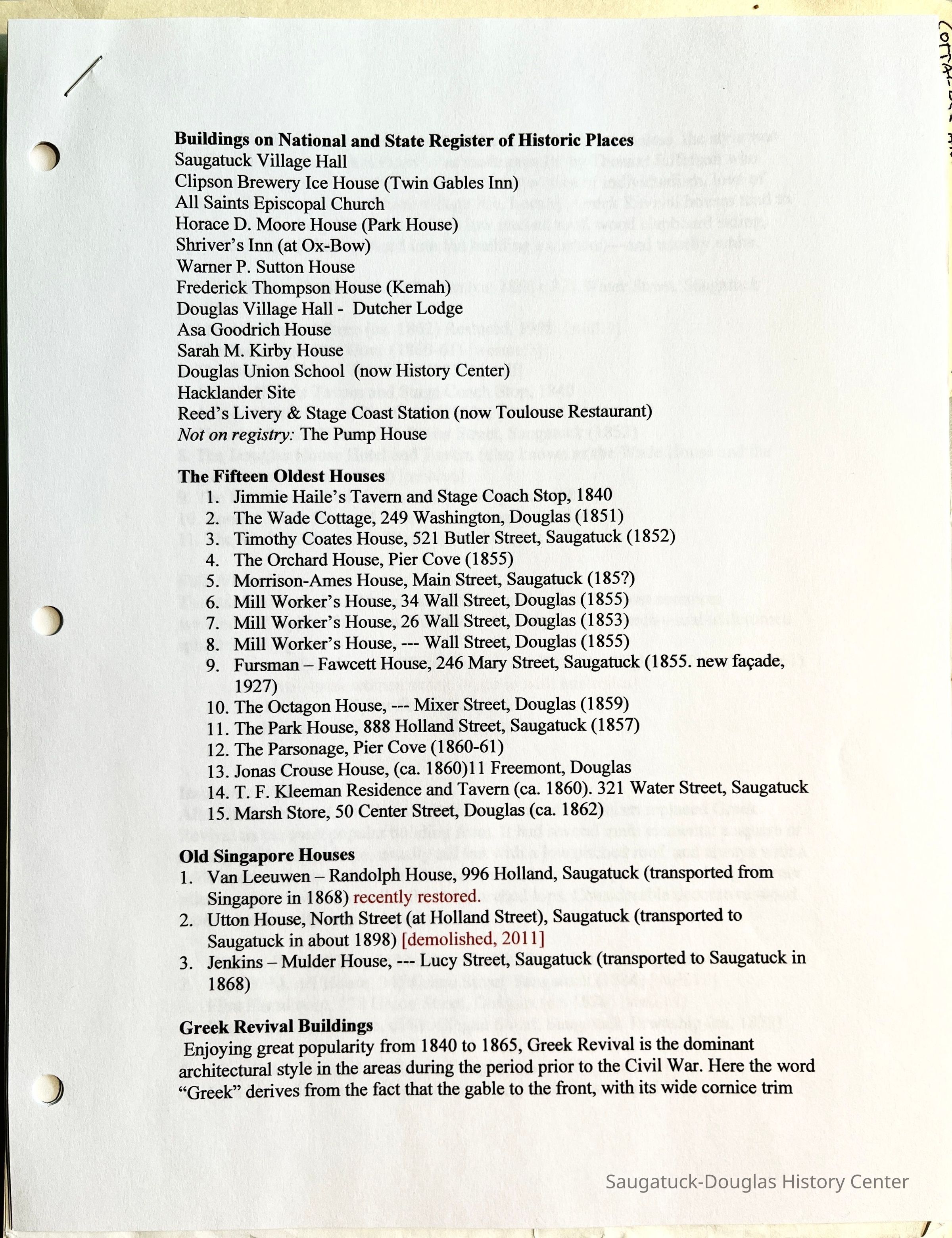 1-29-66 Saugatuck. - Many new and permanent improvements have been added to this place during the past season. Two new stores built —one by T. S. Coates, Esq., 24 x 60. Coates building is occupied by Messrs Johnson and Stockbridge; and the other is to be occupied by Dunning, Hopkins & Co., for Dry-Goods, Groceries, &c. A new feed store has been opened by Adolphus R. Mann, formerly of Manlius; also a new boot and shoe store by R. N. [B.] Newnham, formerly of the navy, besides a large number of dwellings in various parts of the village, which gives credence to the belief that ere many years are passed, Saugatuck will have recovered from her lethargy, and rank in commercial importance second to no town in the county. Money has been raised and a site selected for a large and commodious school house, to be built the coming season which shall reflect to the credit of the place. Rumor has it that a new church is to be built the coming season in place of the miserable building now occupied by the friends of the Congregational denomination. This is probably a premature move. Horace D. Moore is busily engaged in building a store on the site of the one consumed by fire on the 8th inst. ........The shipyards are doing a good business - Captain Coates new vessel is about to receive the plank. She will be a model craft, which, with the modest Captain, will rank her second to no vessel for fright or passengers, plying between this port and Chicago. The Lodge of Good Templars so much talked of in this place is non est, owing to the want of proper men to set it in motion, which is to be regretted. —Allegan Journal, January 29, 1866 [Transcribed by Bill Kemperman] The document continues with Mr. Kemperman's thoughts about conflicting press reports about the Singapore Bank Building and the "Big House" boarding house at Singapore.