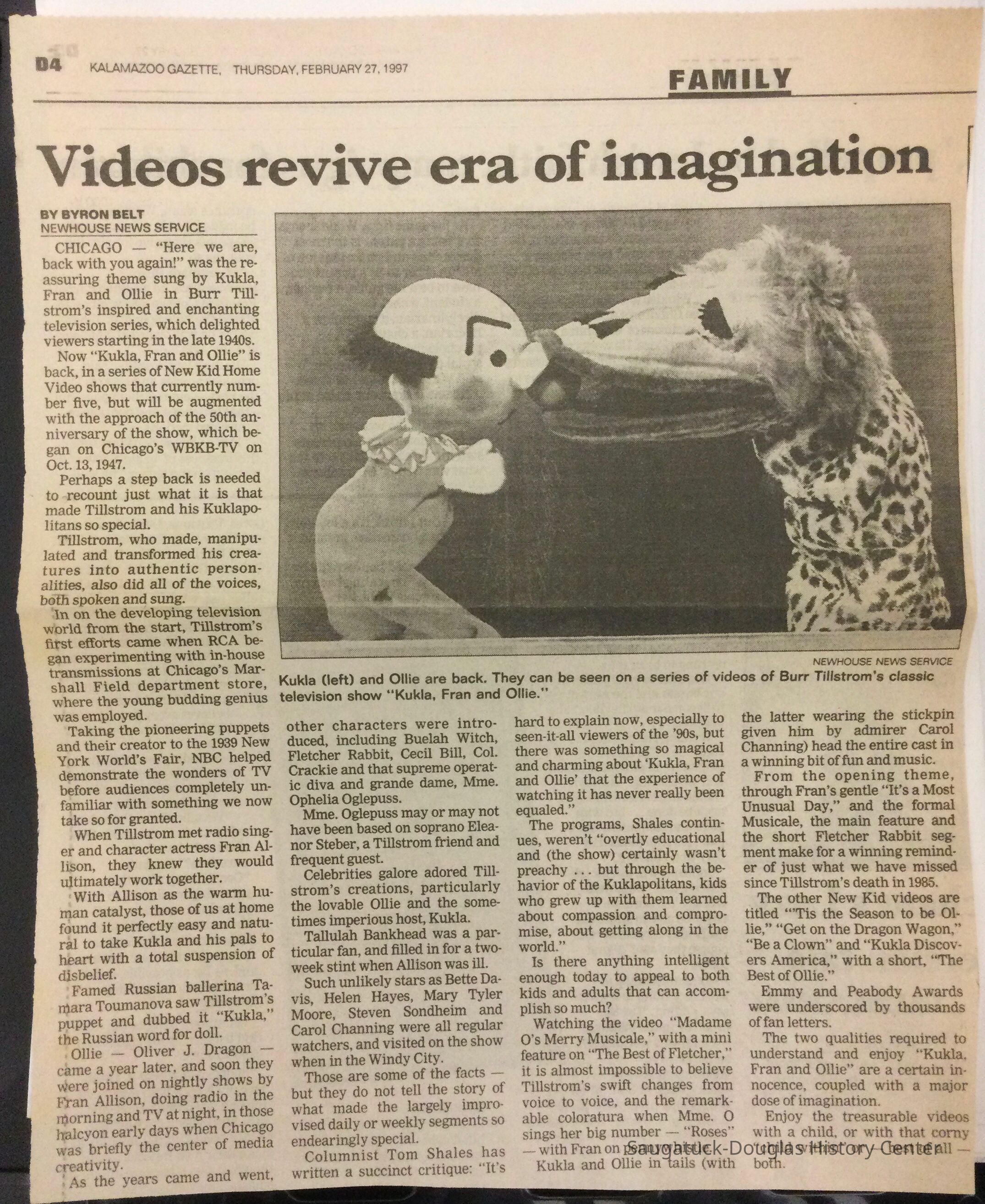 2023.08.01 - Newspaper article titled "Video’s revive era of imagination.” From the February 27, 1997 Kalamazoo Gazette about a 5-part VHS video series being produced from Burr Tillstrom’s original "Kukla Fran and Ollie" shows.