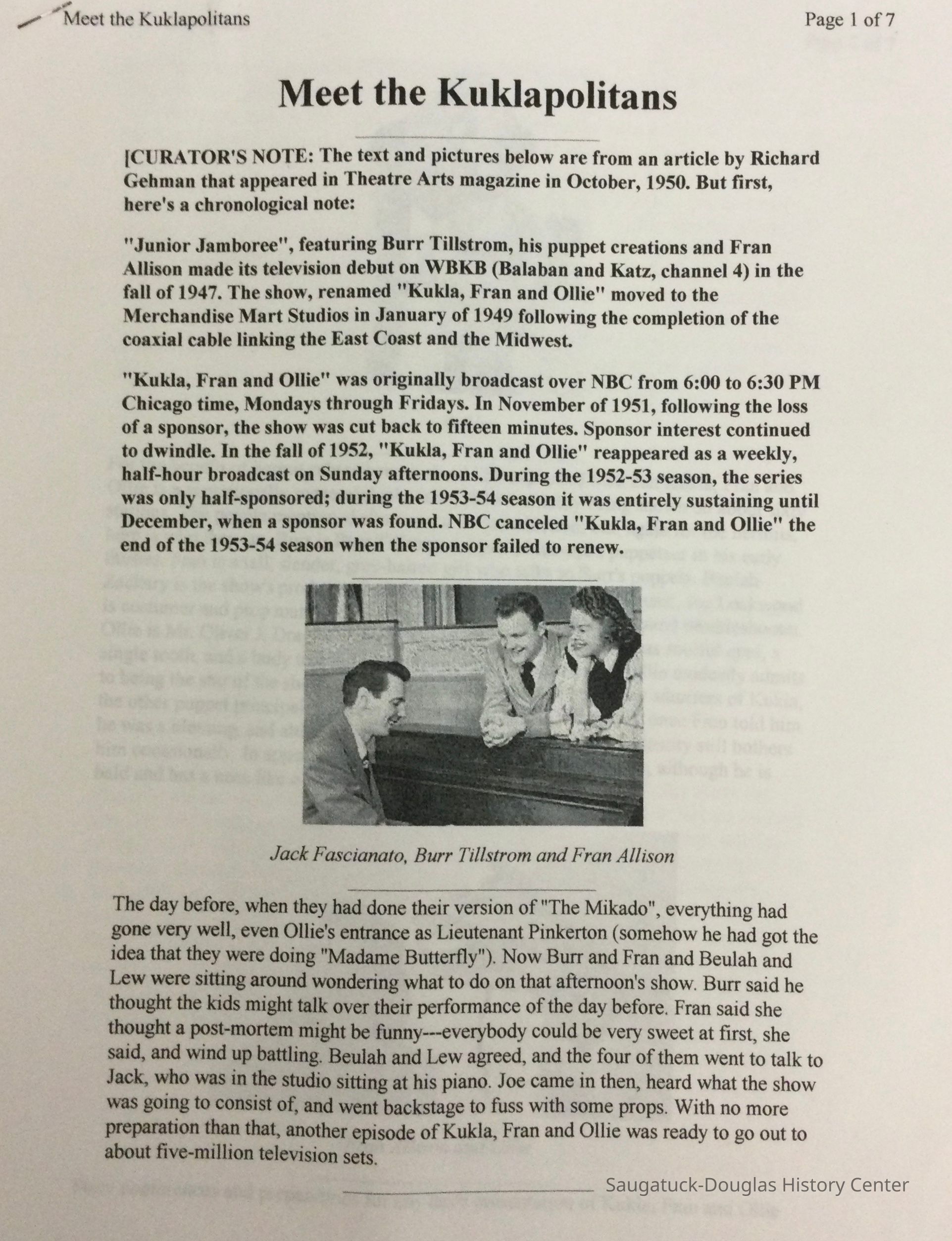 2023.08.02 - A seven page article titled “Meet the Kuklapolitans” All about the puppets that Burr Tillstrom had in his show, "Kukla, Fran and Ollie". From an article by Richard Gahman that appeared in Theatre Arts magazine in October, 1950.
