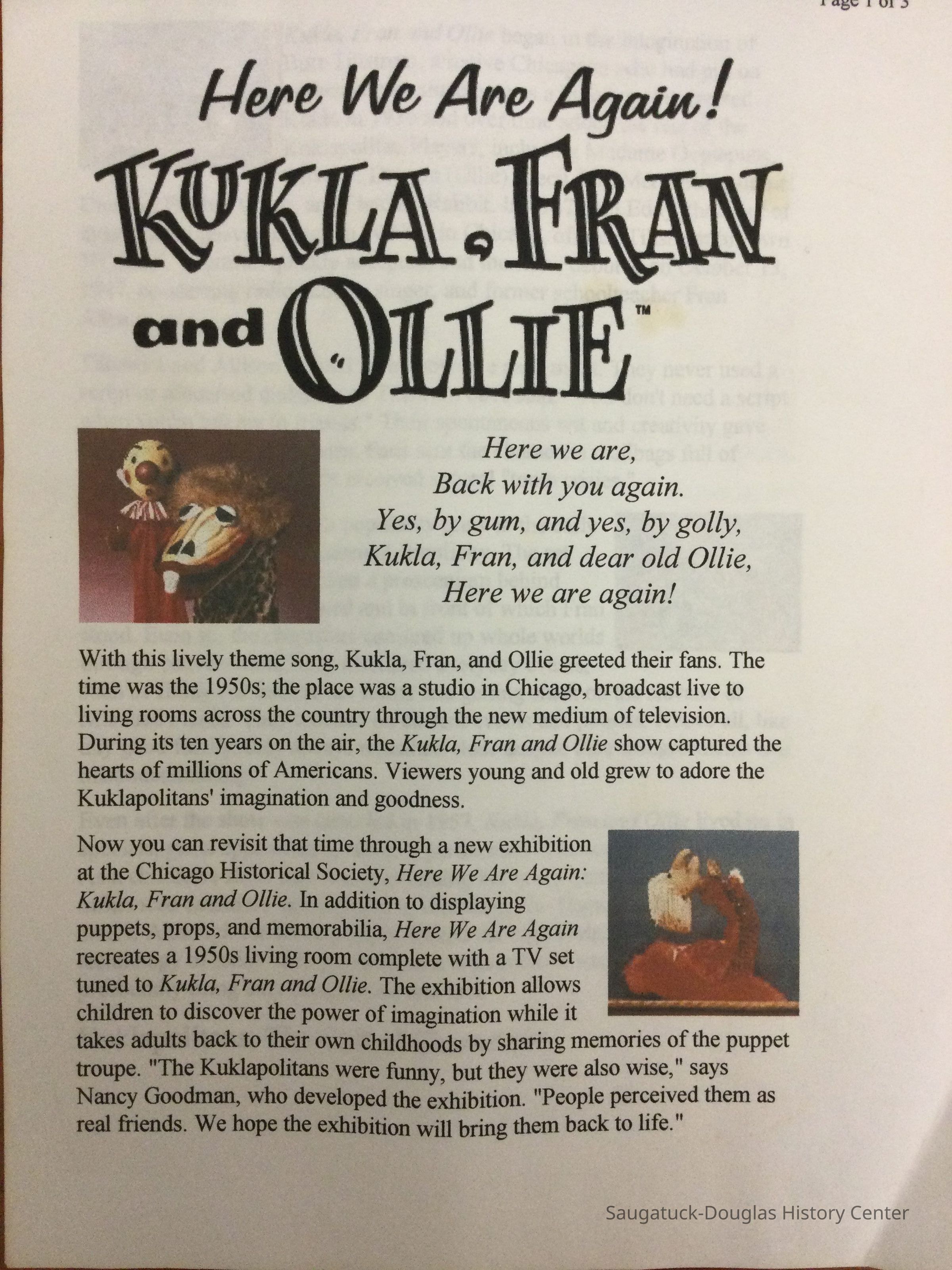 2023.08.03 - Three pages of information about the exhibit at the Chicago Historical Society, titled, “Here We Are Again! Kukla, Fran and Ollie."Collection