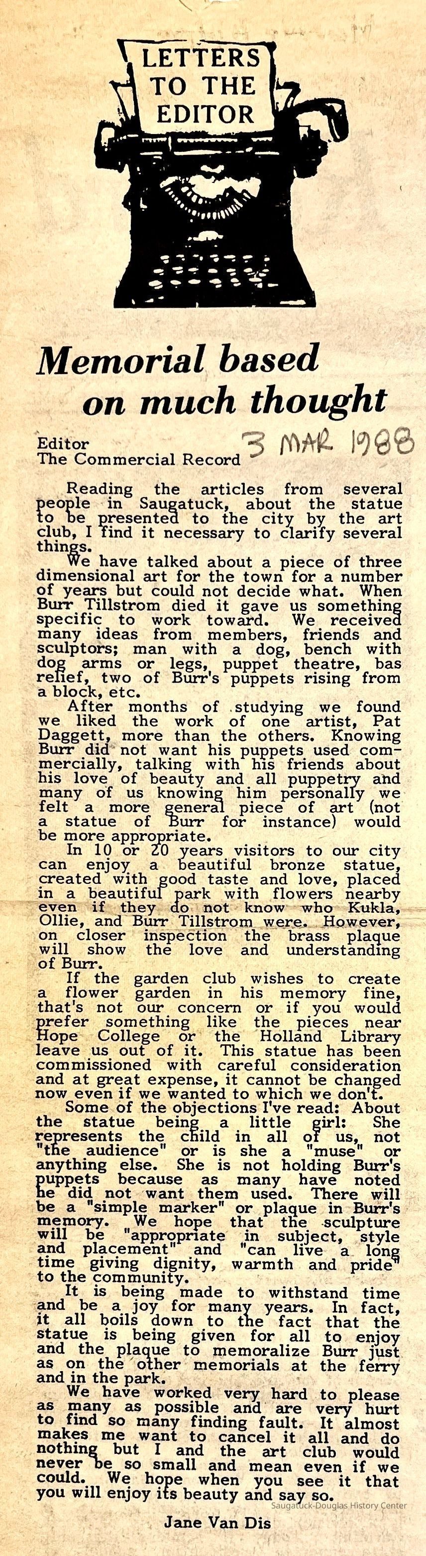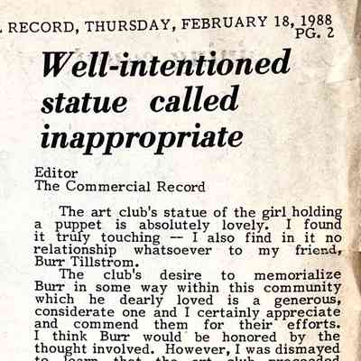 Collection of newspaper clippings about the Burr Tillstrom memorial. The bronze statue of a girl interacting with a rabbit hand puppet is located in Saugatuck's village square.Context