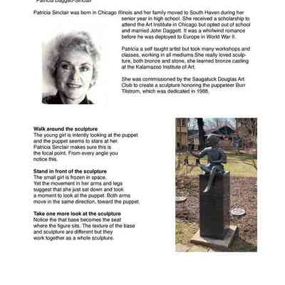 In 1988 the Saugatuck-Douglas Art Club erected a memorial in honor of Saugatuck resident and pioneering television puppeteer Burr Tillstrom of “Kukla, Fran and Ollie” fame. The sculpture was created by Patricia Daggett-Sinclair. According to the Art Club's website, the memorial effort was led by Helen Van Mell.Collection