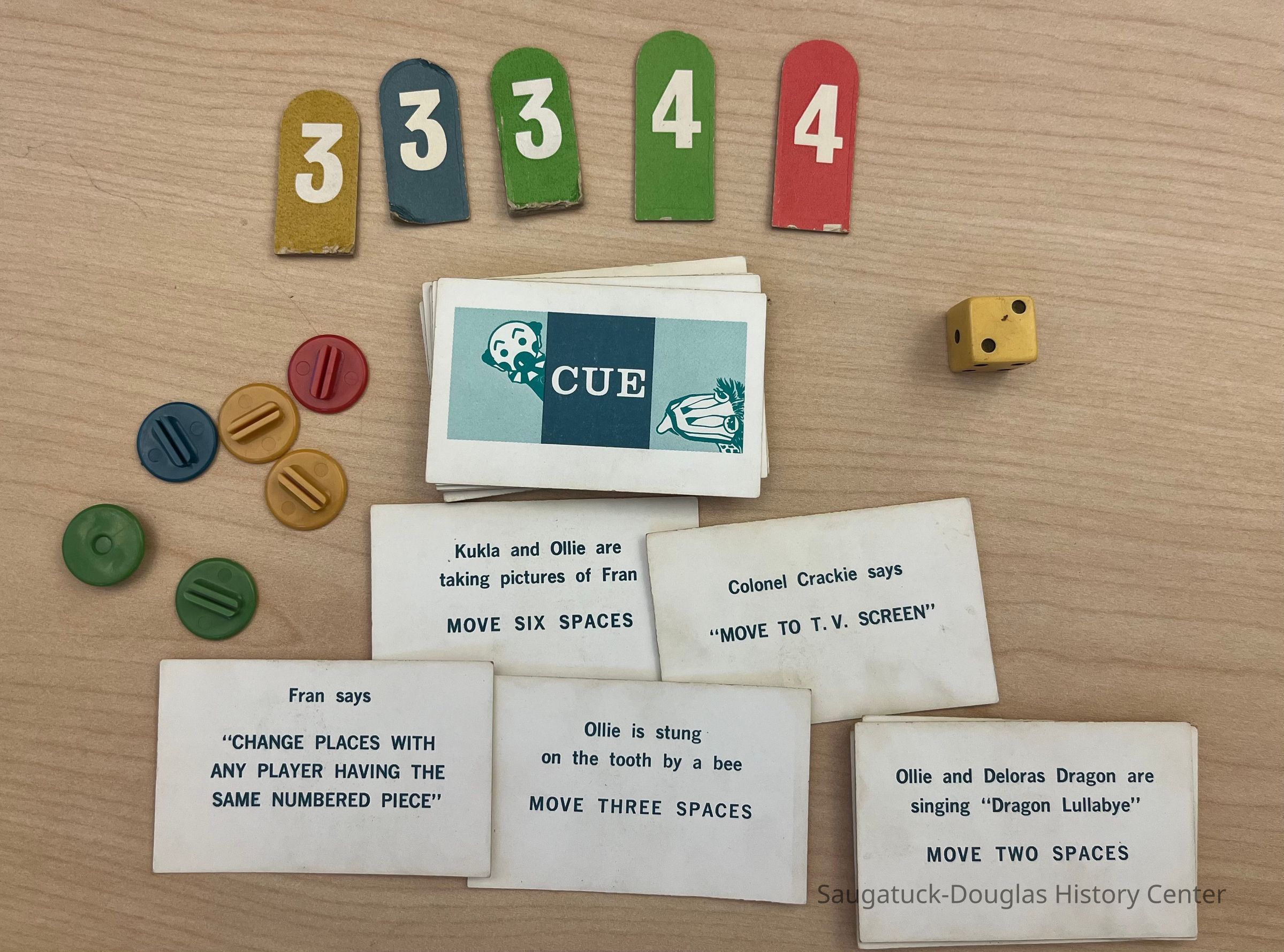 This game, based on the Kukla Fran & Ollie TV show, is to be the first player to move all of your playing pieces (representing puppets) into the center area marked ON STAGE. Each player starts with 4 pieces (numbered 1-4) on the starting circles. On your turn, you may move any 1 of your pieces. A piece may move in any direction except backward and moves a number of spaces equal to its number (the #3 piece moves 3 spaces). If 2 or more pieces are on the same row, the moving piece gets bonus moves equal to the numbers on all the pieces in that row. If you land on an opponent's piece, you send it back to its start space. Be the first to get all your pieces ON STAGE and you win.