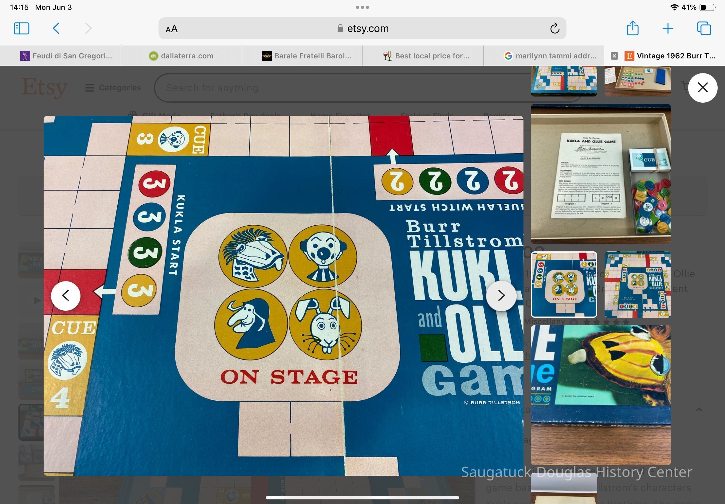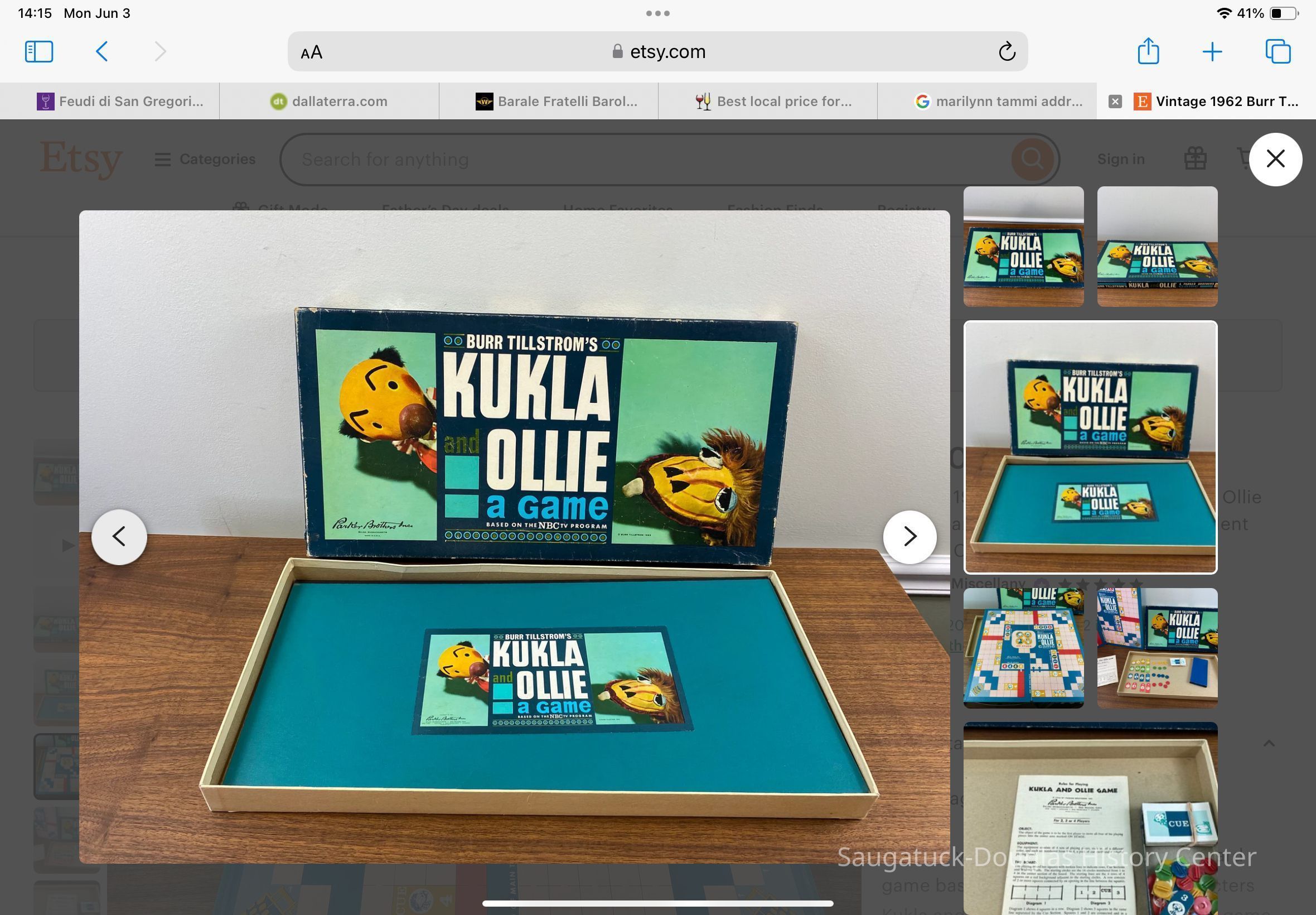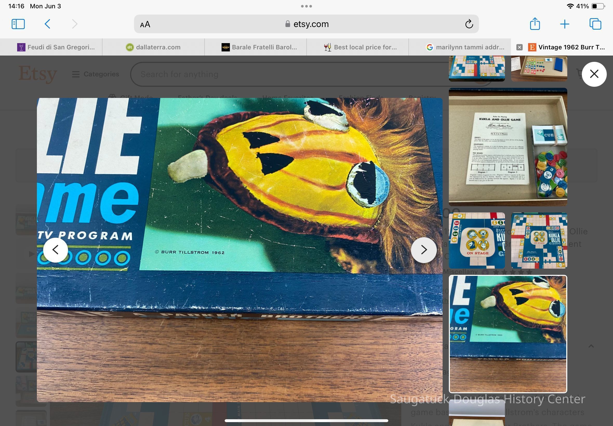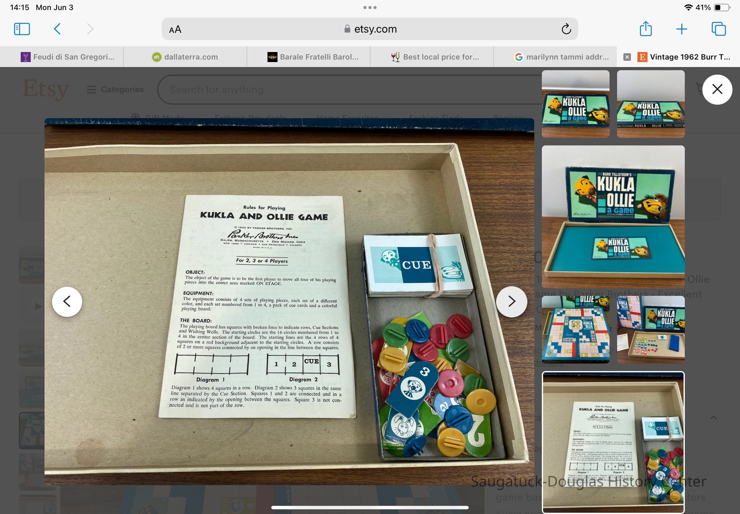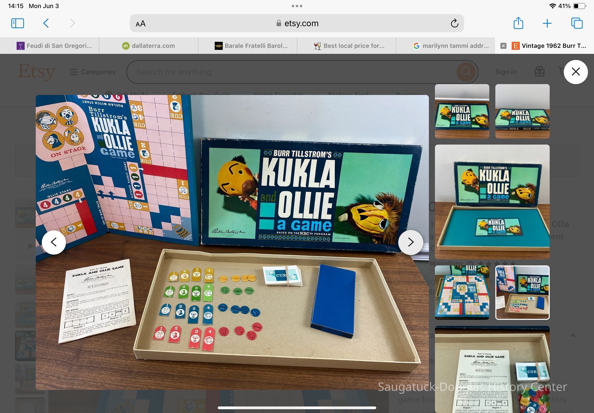 “This is a vintage 1962 edition of the board game based on Burr Hallstrom's characters Kukla and Ollie by Parker Brothers. The game is in excellent vintage condition. It is essentially complete but missing one of the green plastic holders for the cardboard number markers. I will include a marker to complete the game, but it is not green, nor original to the set.